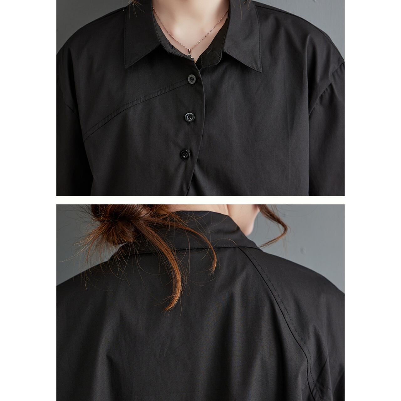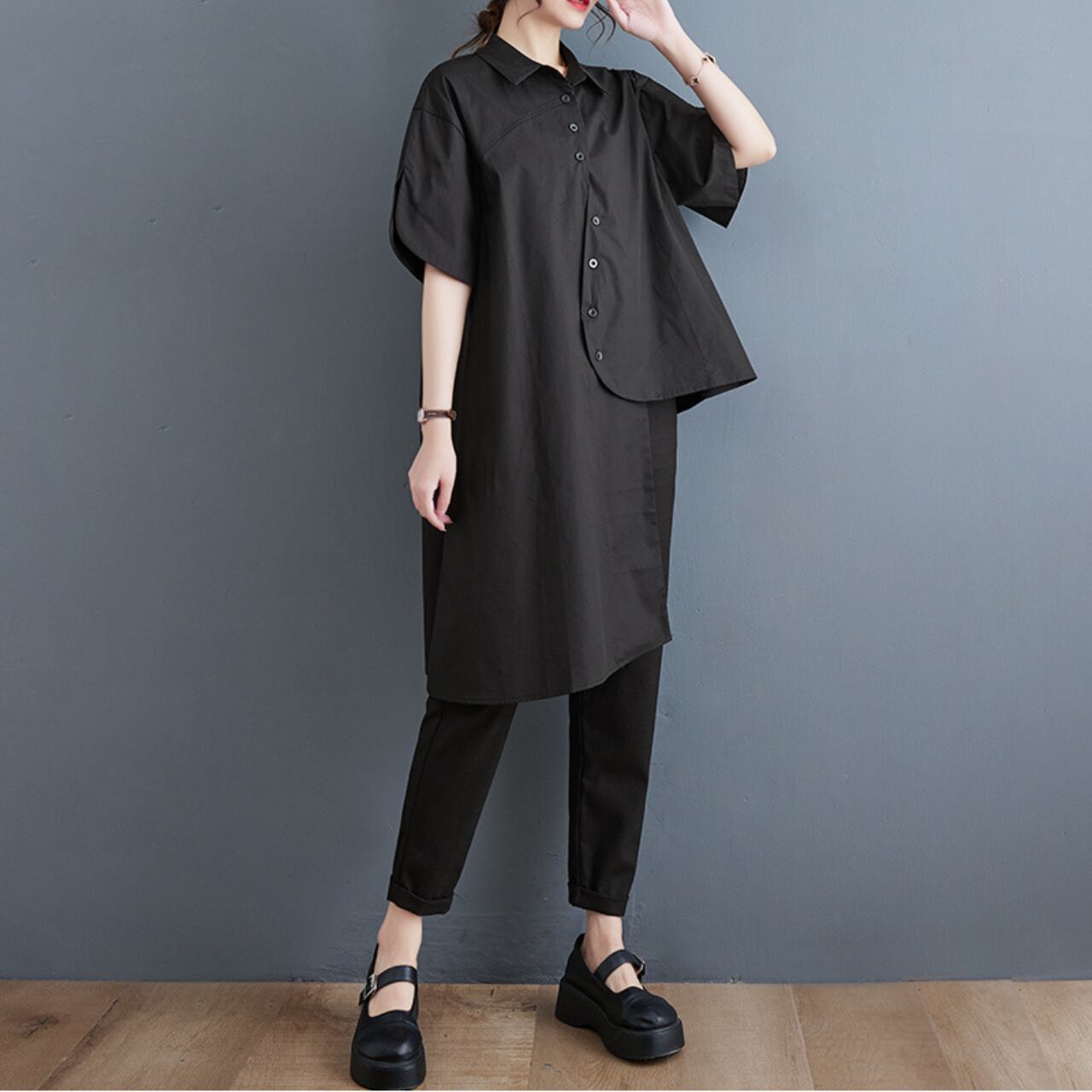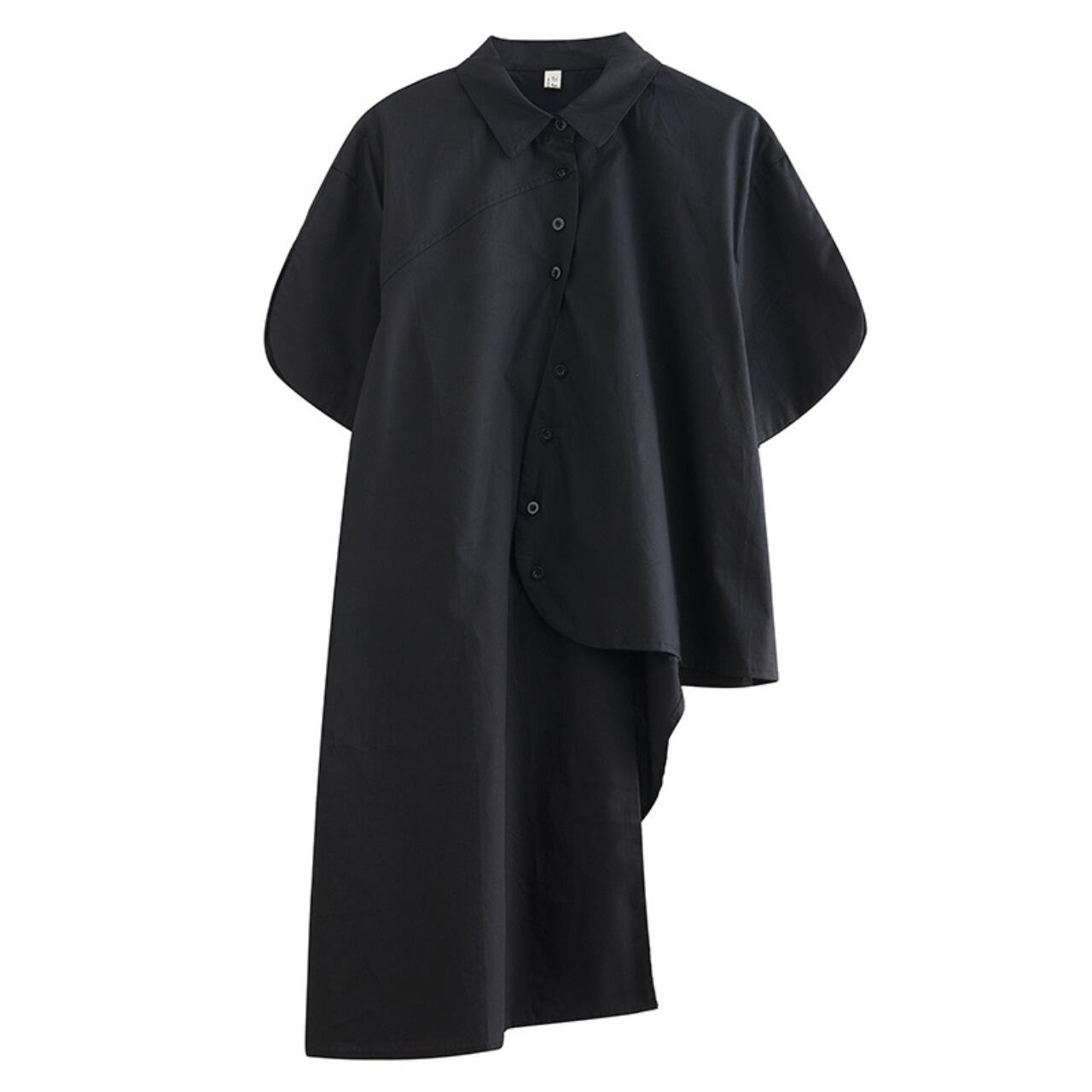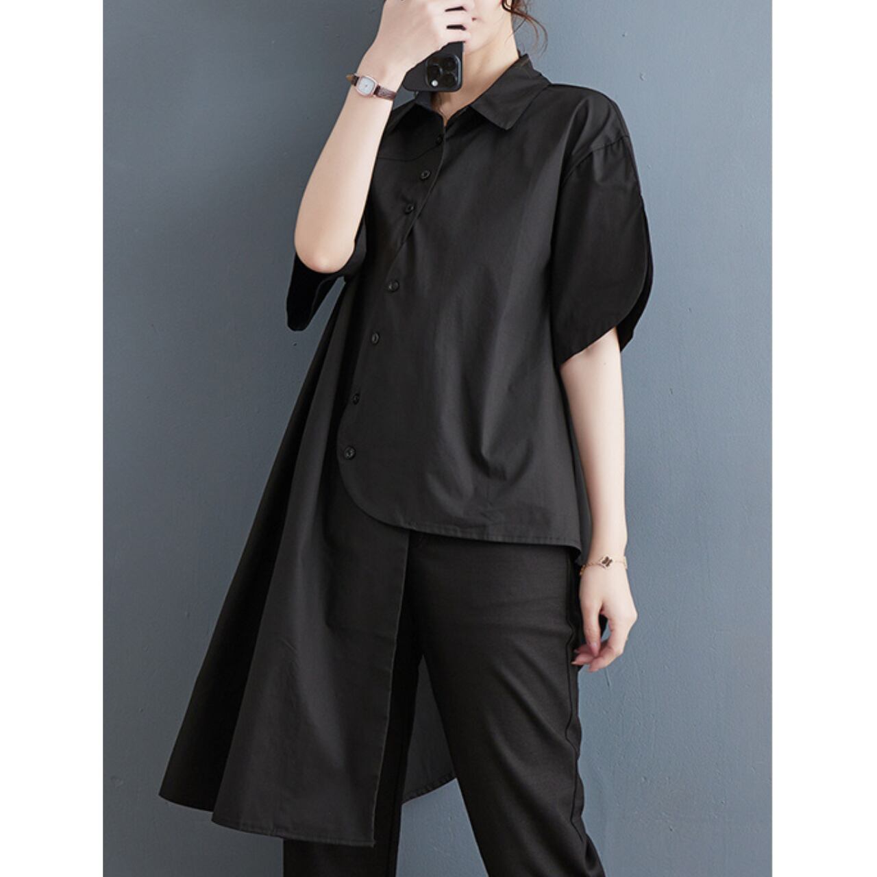 ボタンダウンシャツのディテールを活かしつつ、裾のアシンメトリーなカットが、シンプルながらも洗練されたスタイルを演出します。