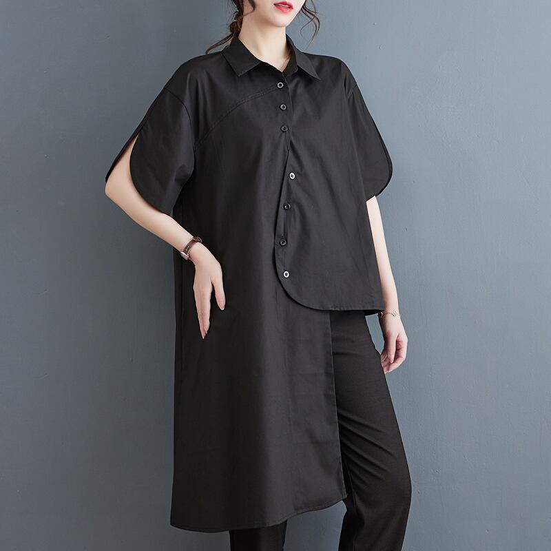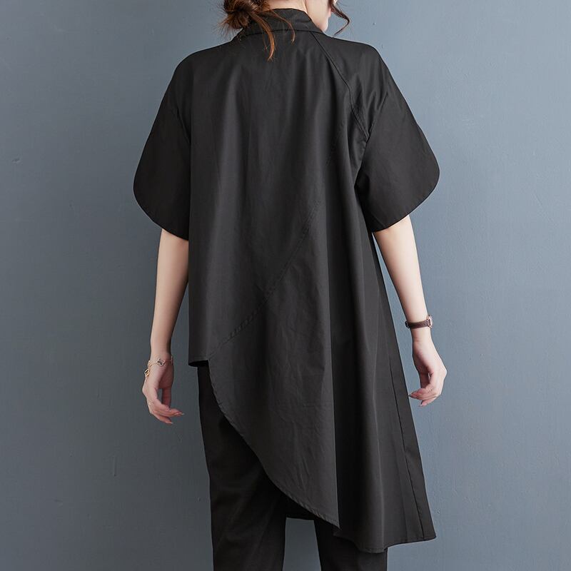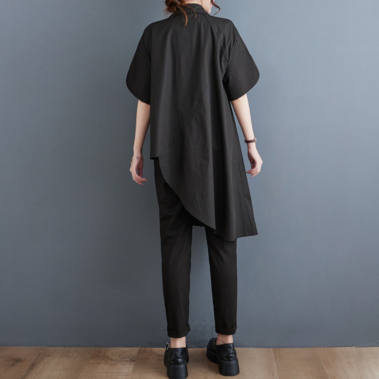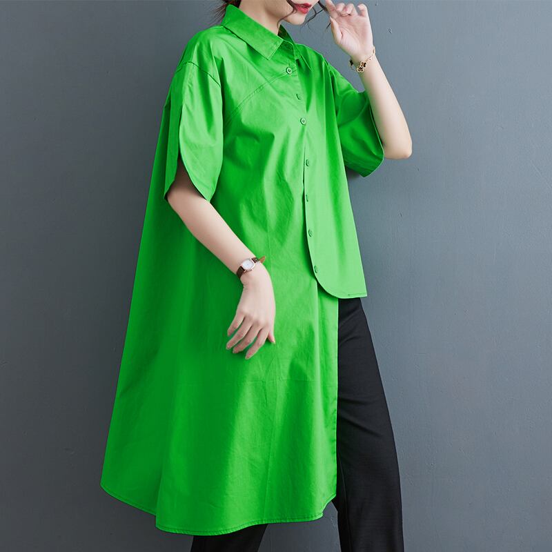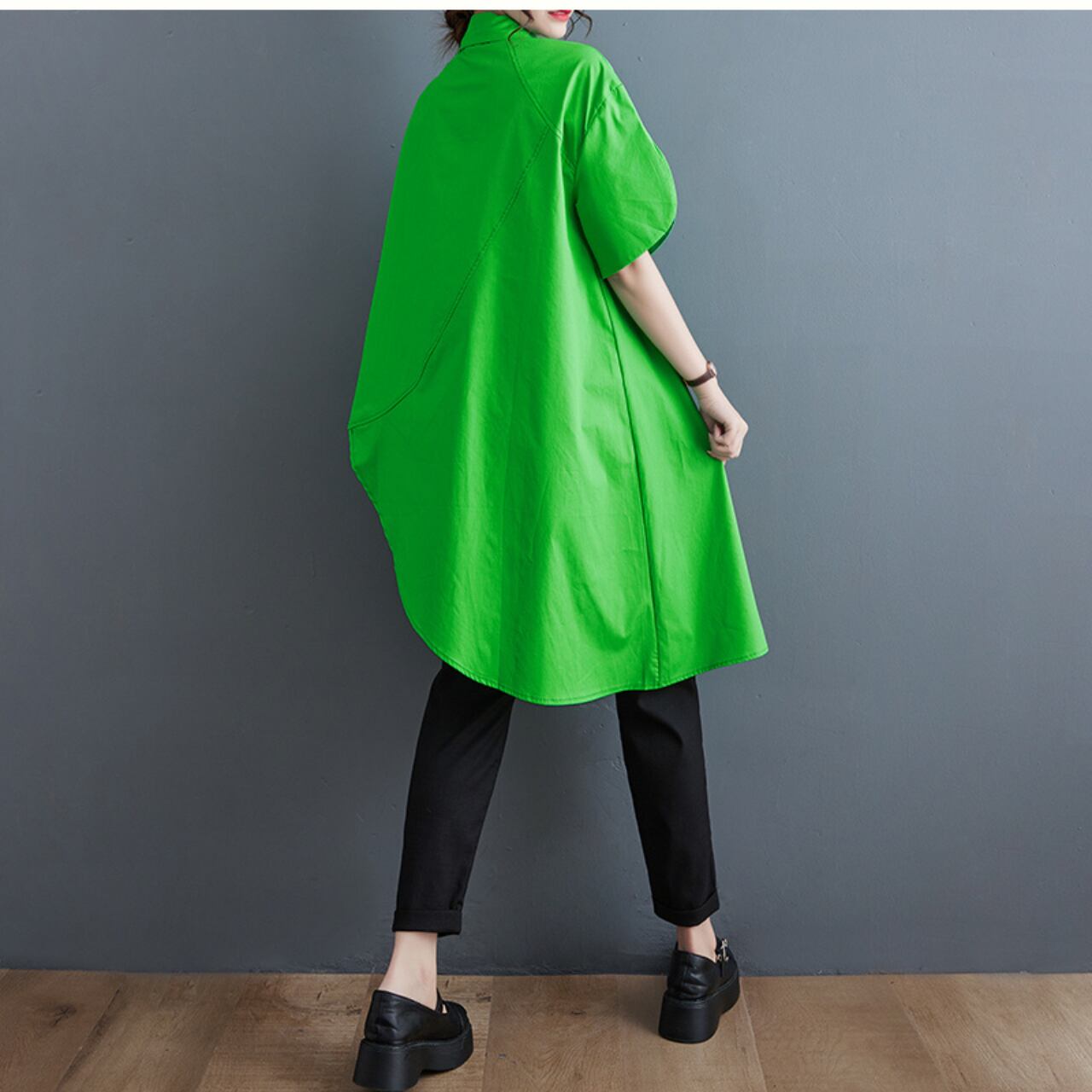ボタンダウンシャツのディテールを活かしつつ、裾のアシンメトリーなカットが、シンプルながらも洗練されたスタイルを演出します。