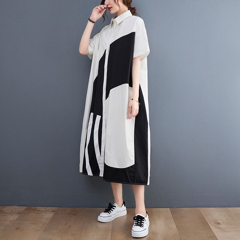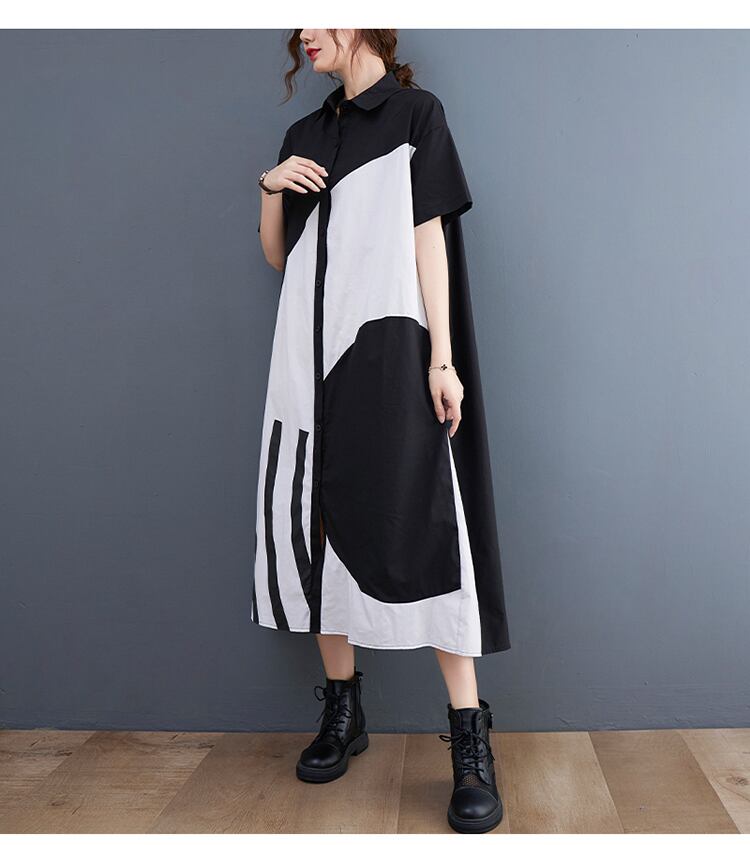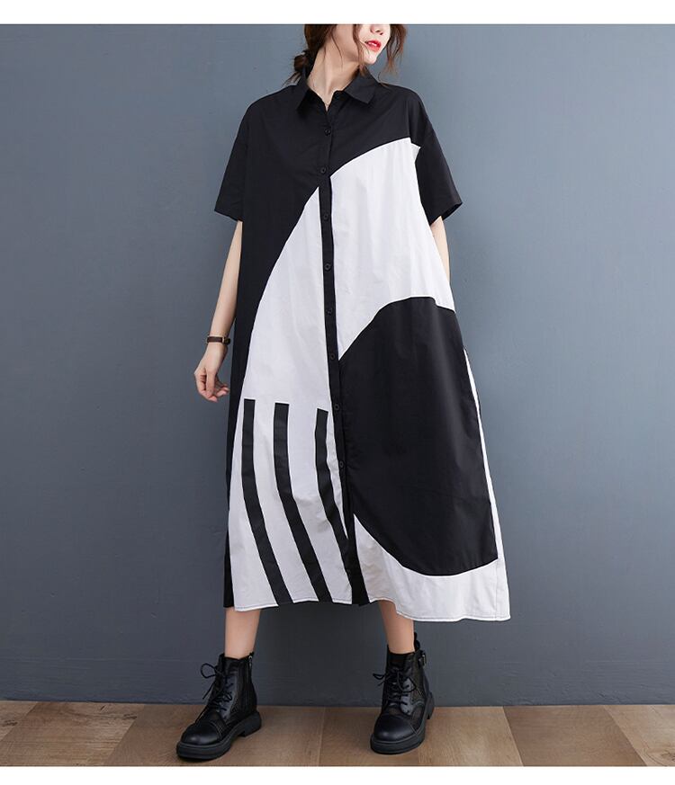 幾何学模様のパッチワークが目を惹く、Aラインのロングシャツワンピース。