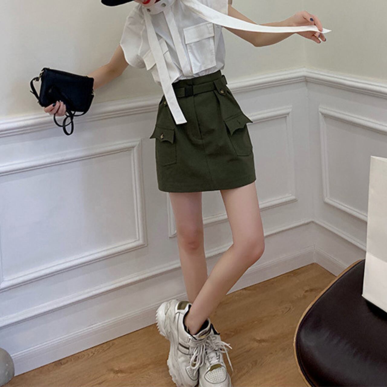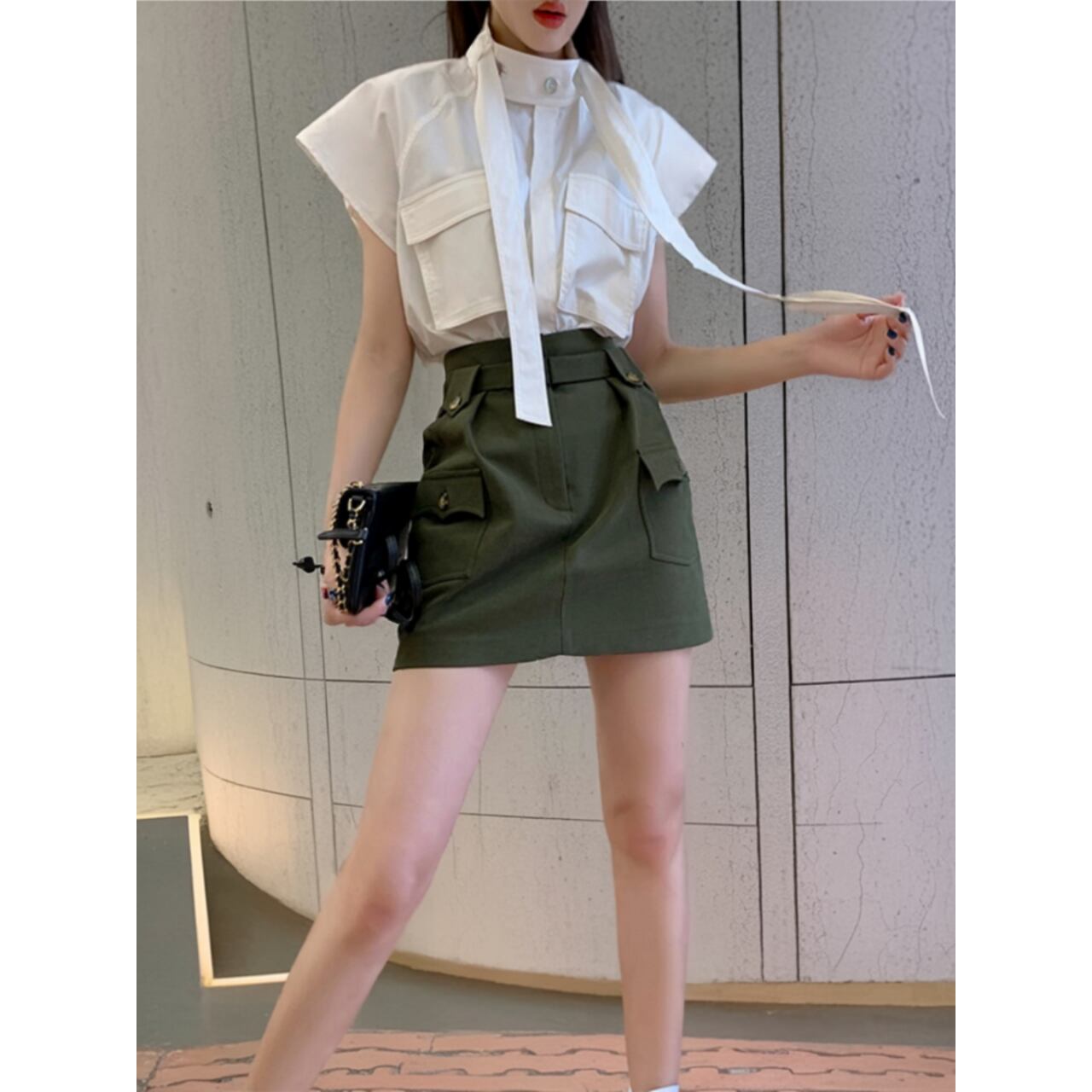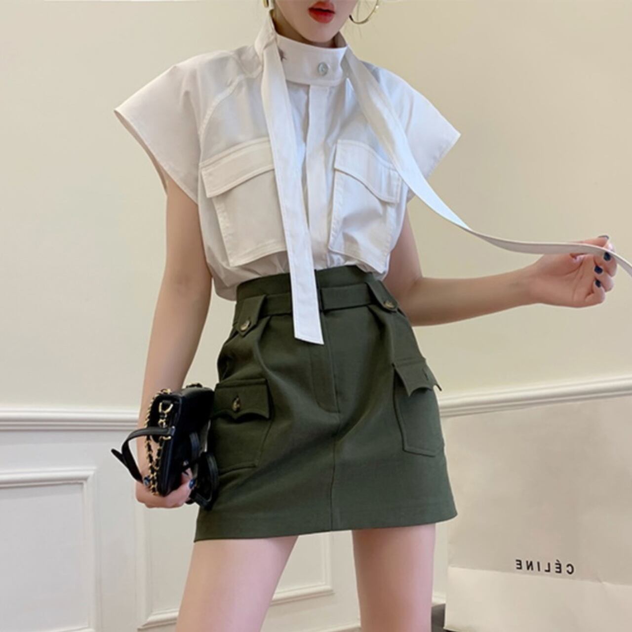 Patch Pocket Stand Collar High Neck Box Silhouette Blouse 00065