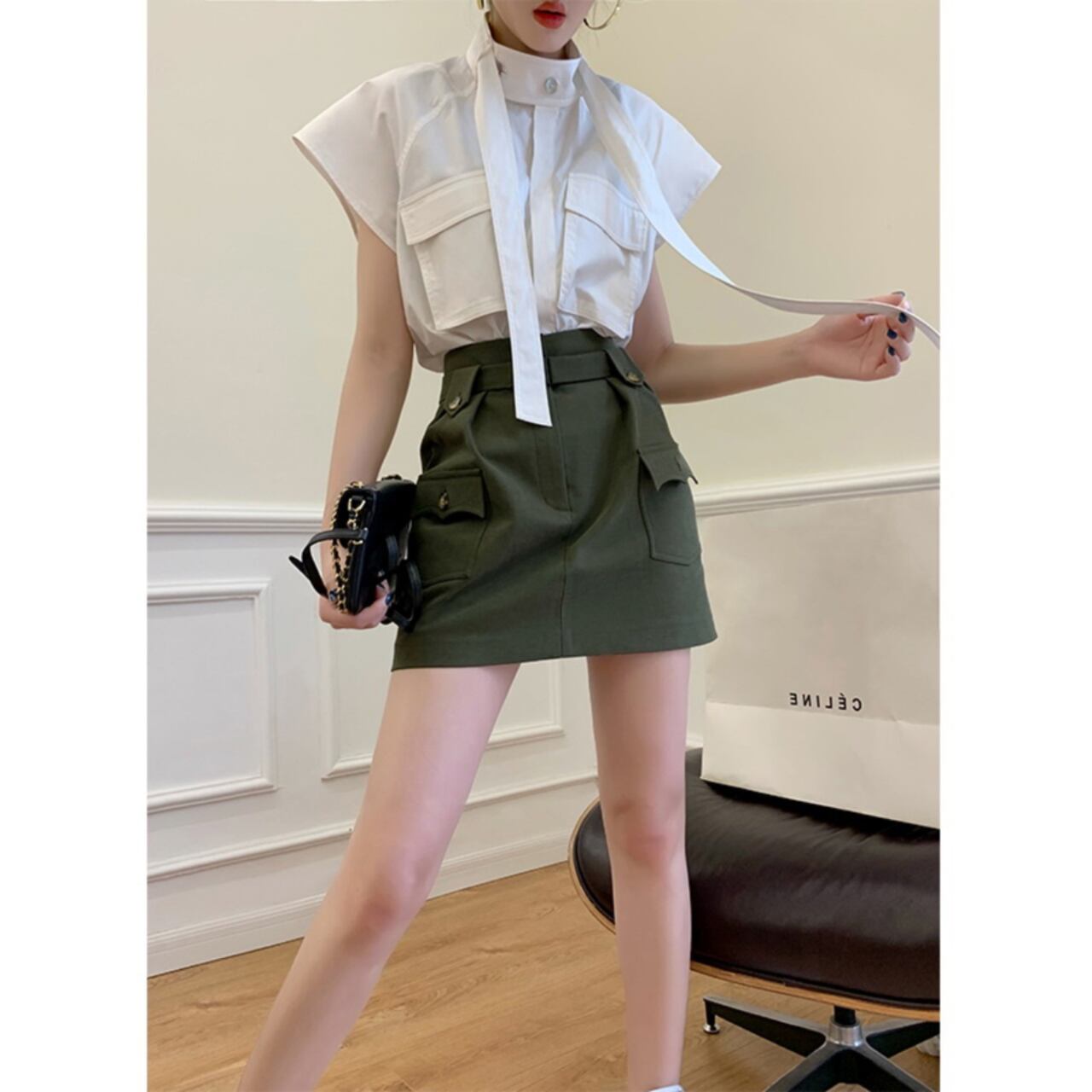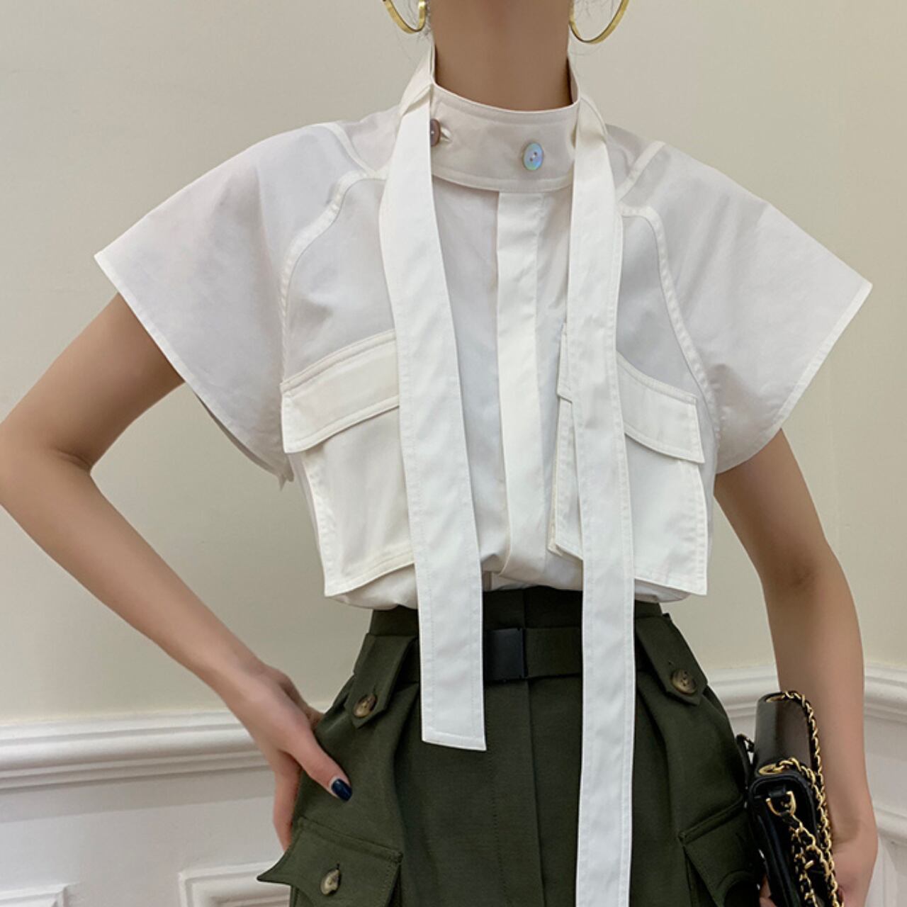 スタンドカラーとパッチポケットが特徴的なボックスシルエットのブラウス。
