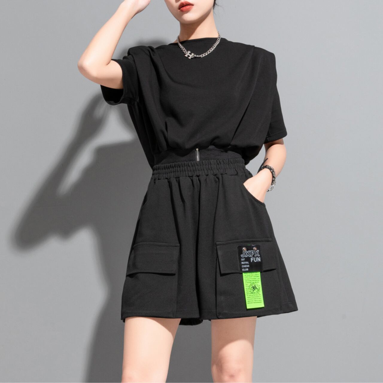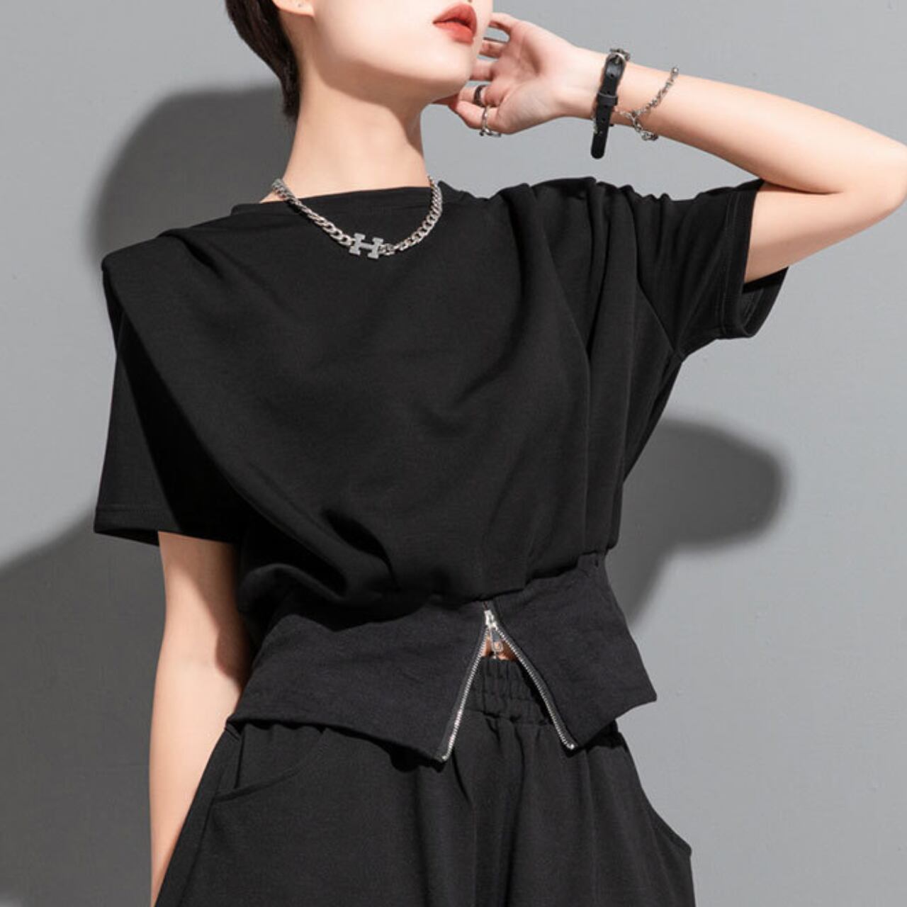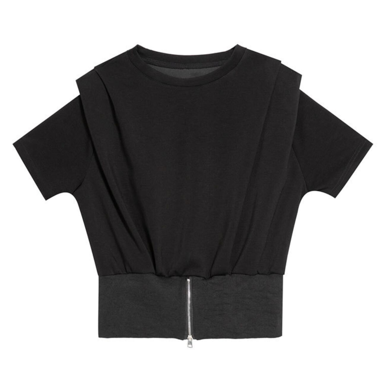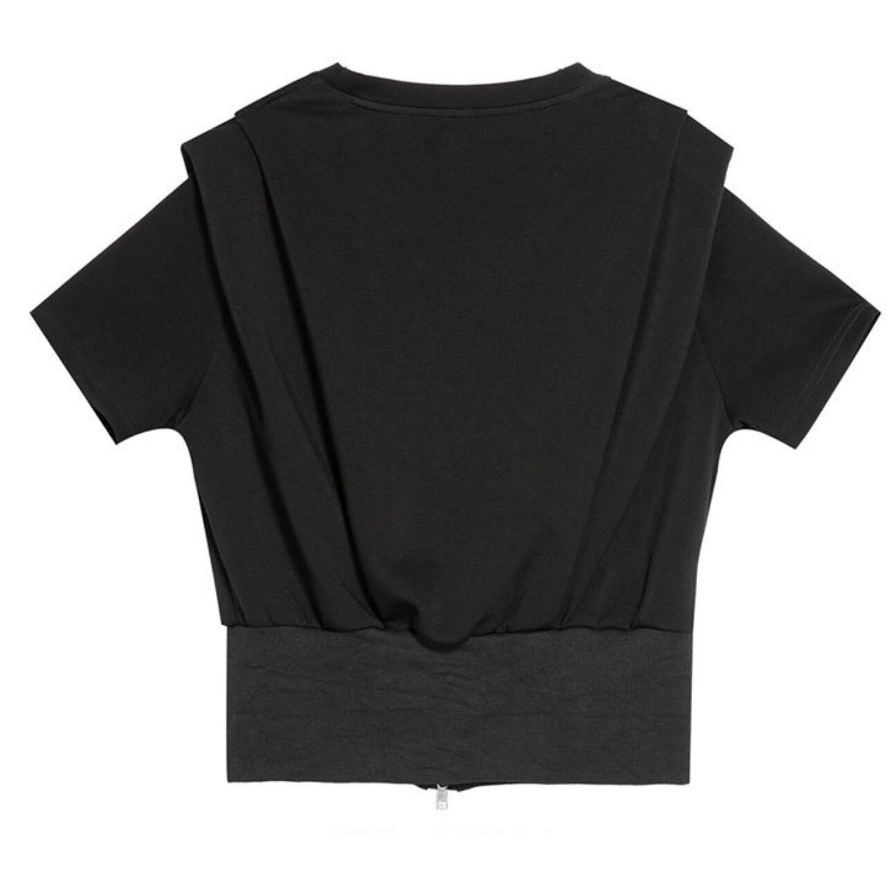 Drop Shoulder Front and Back Difference Hemline Zippered Short Sleeve Top 00066