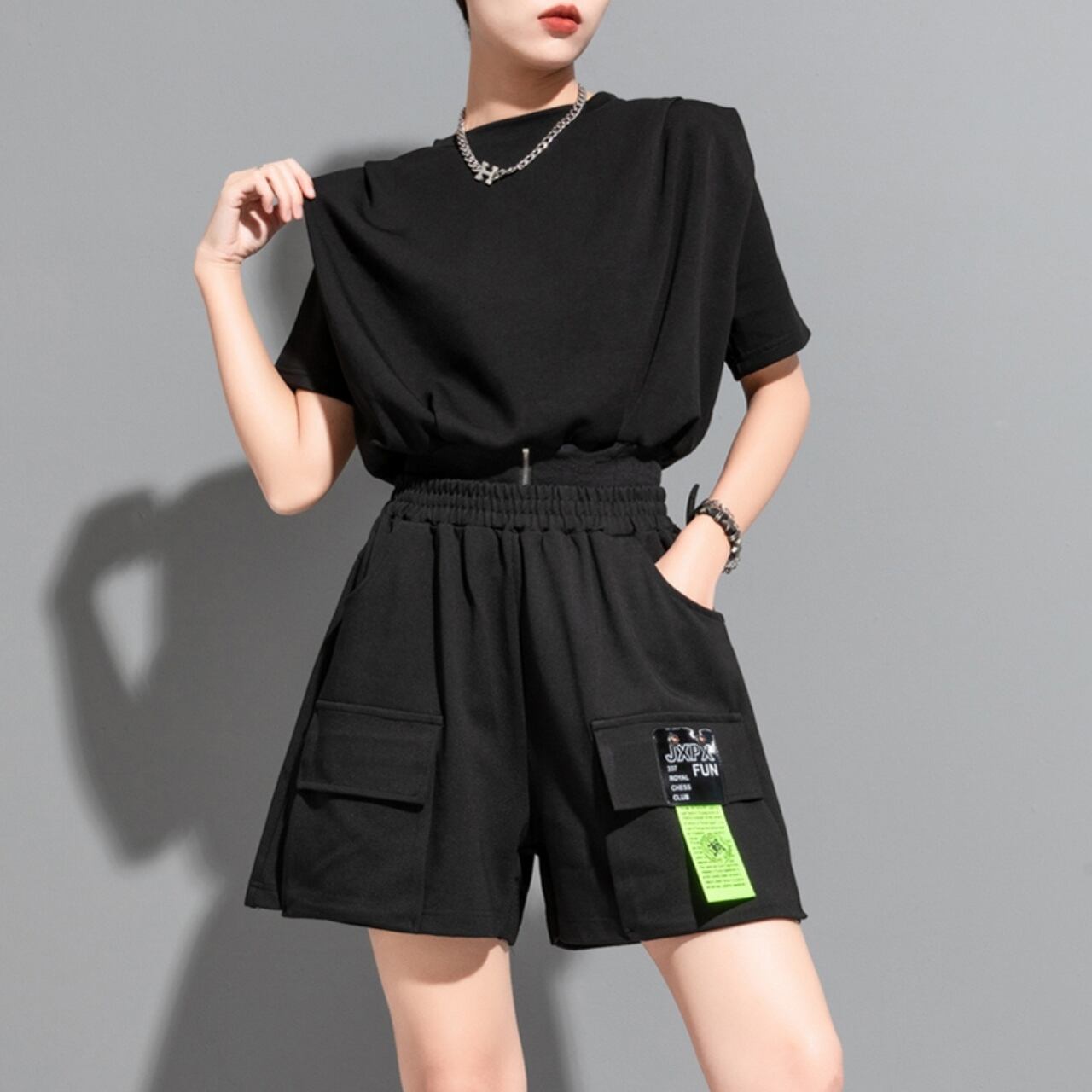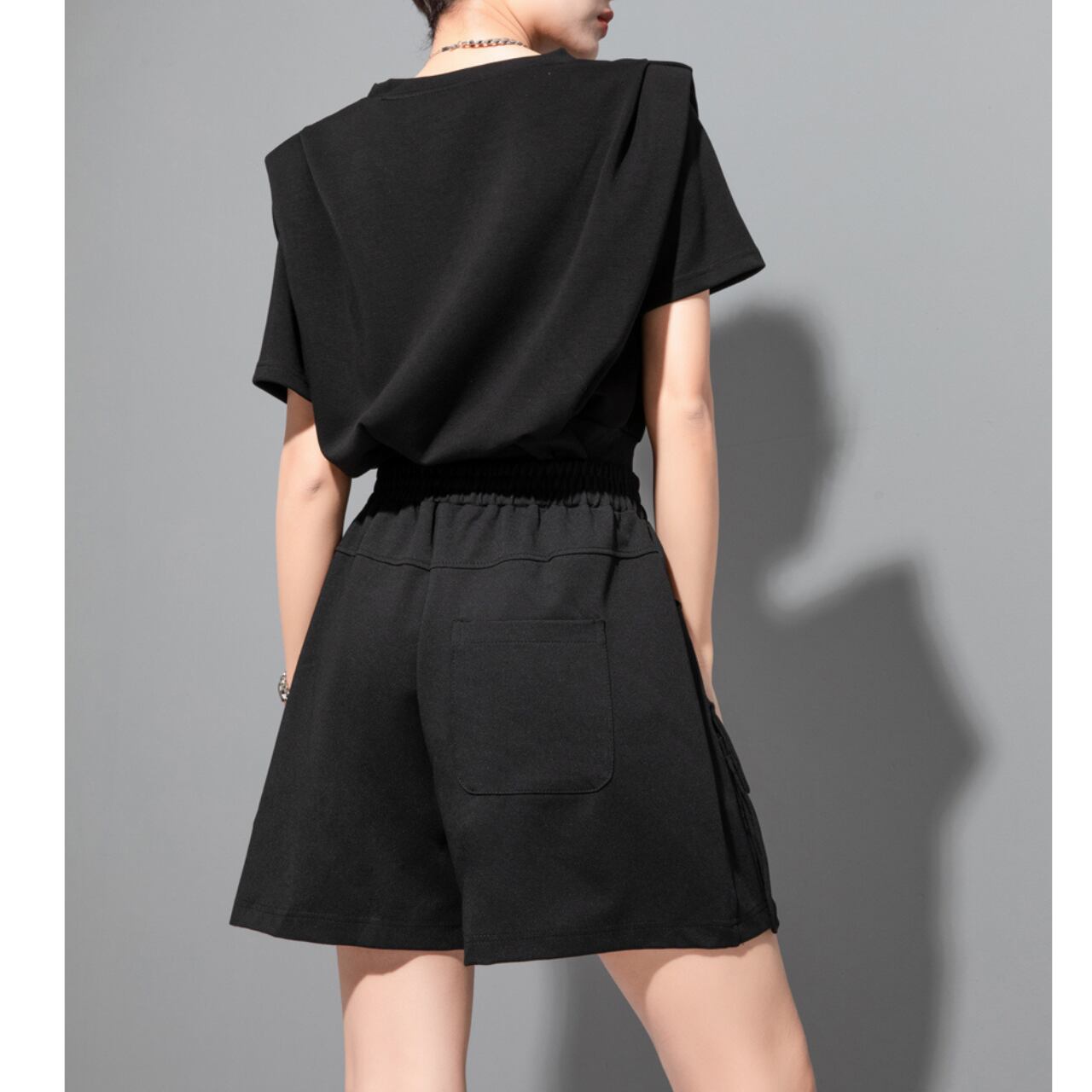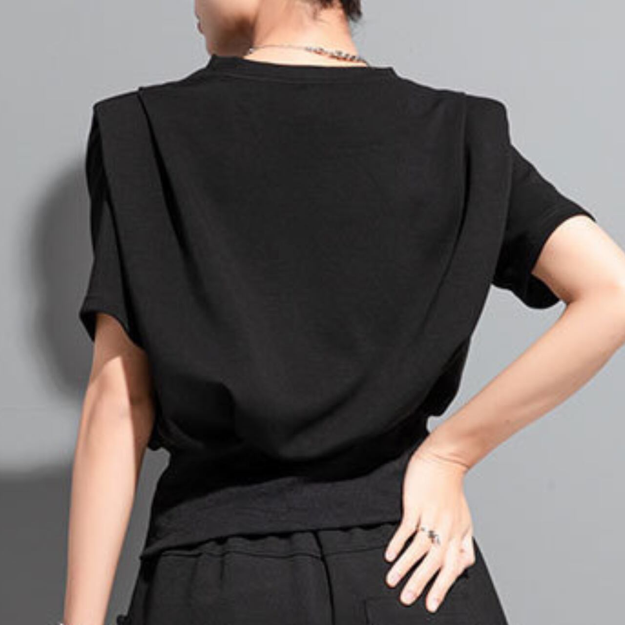 ドロップショルダーとパフスリーブが特徴的なトップスです。ハイウエストのショート丈デザインにより、スタイルアップ効果も期待できます。シンプルながらも個性を演出したい方におすすめです。様々なボトムスと合わせやすく、コーディネートの幅を広げてくれます。