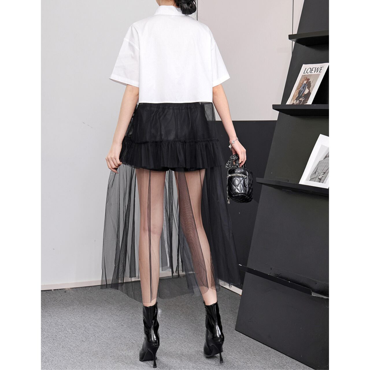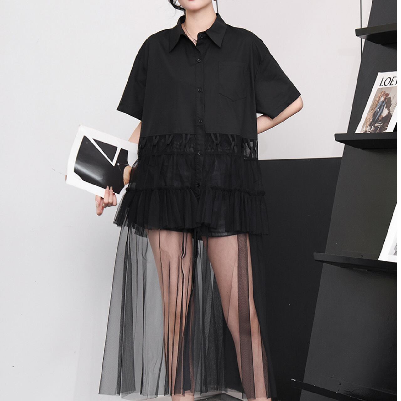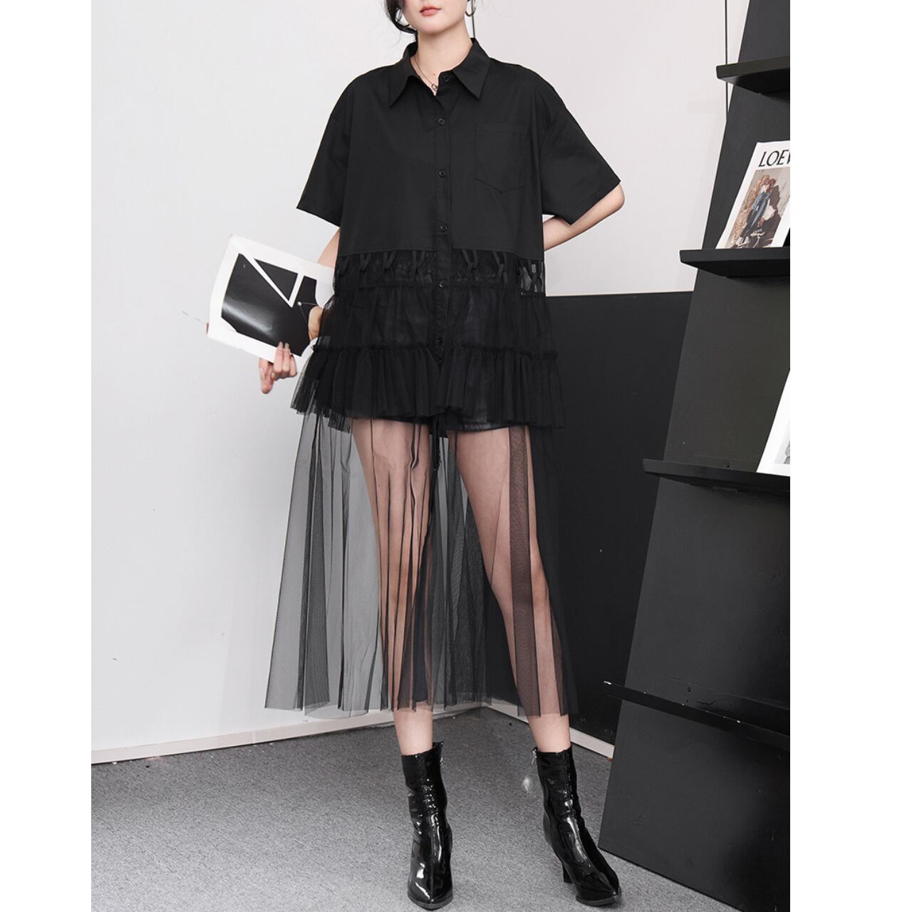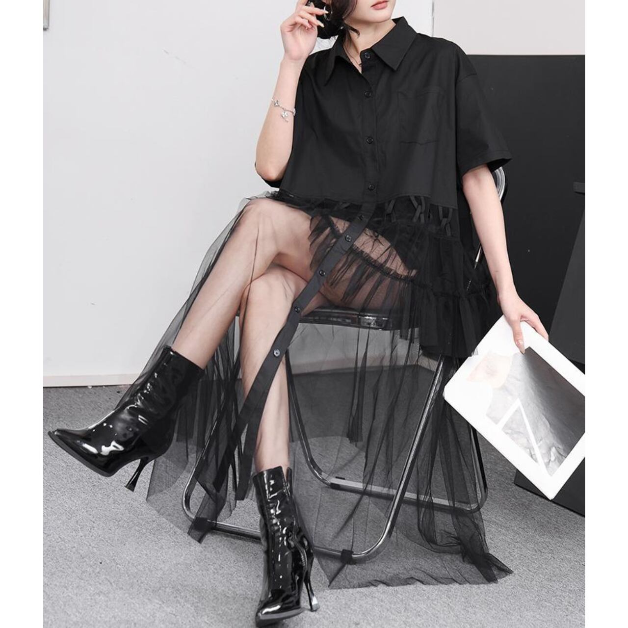 オーバーサイズのシャツとチュールスカートがレイヤードされたワンピース。