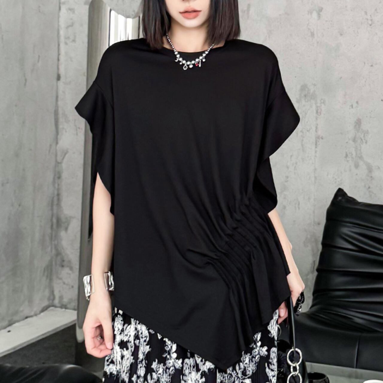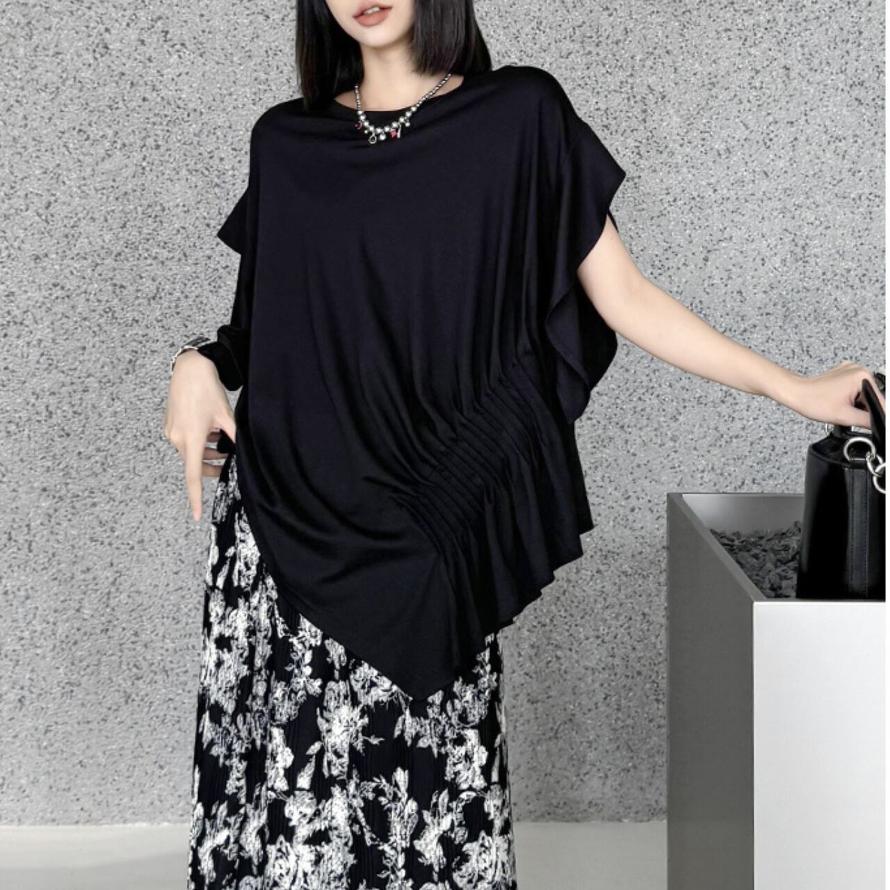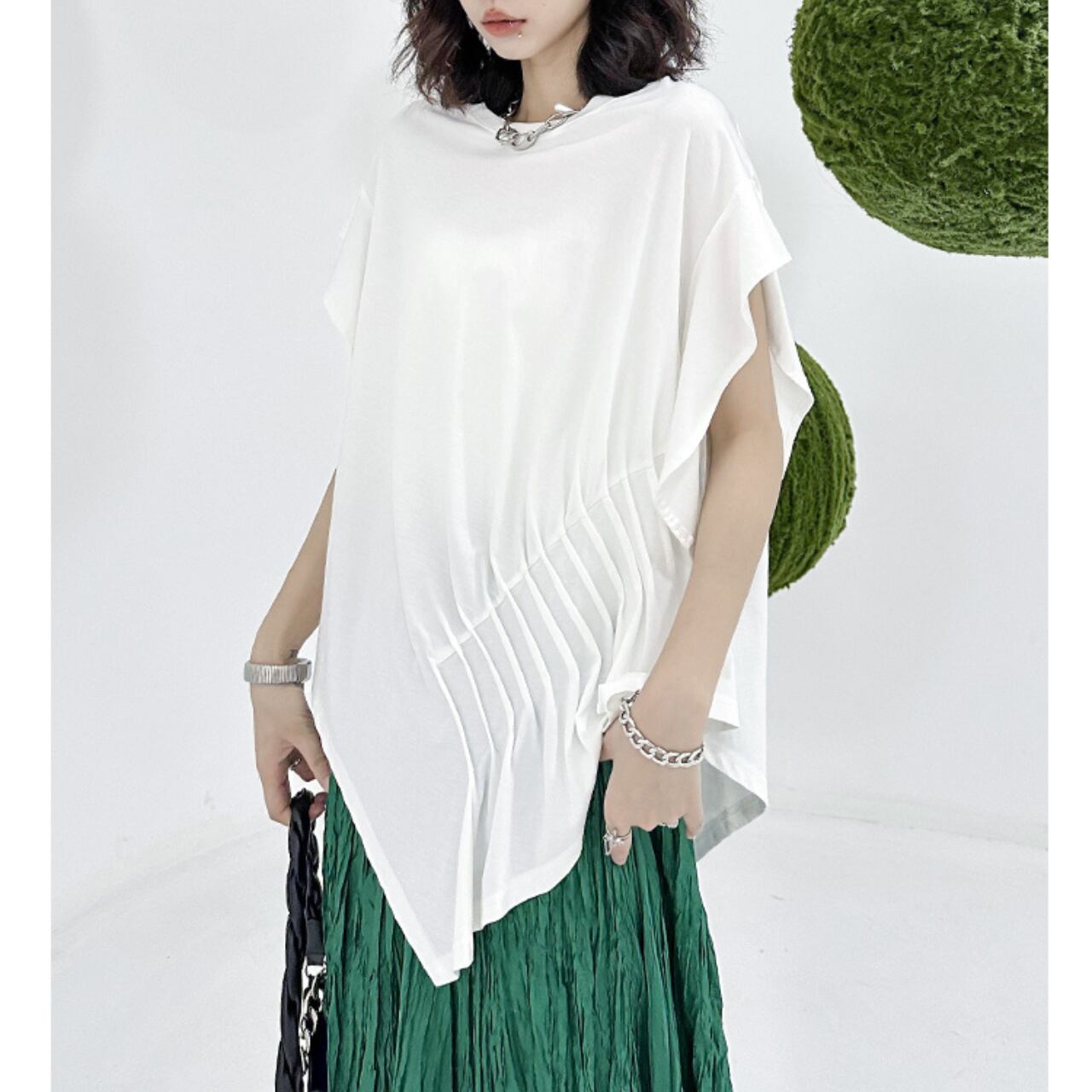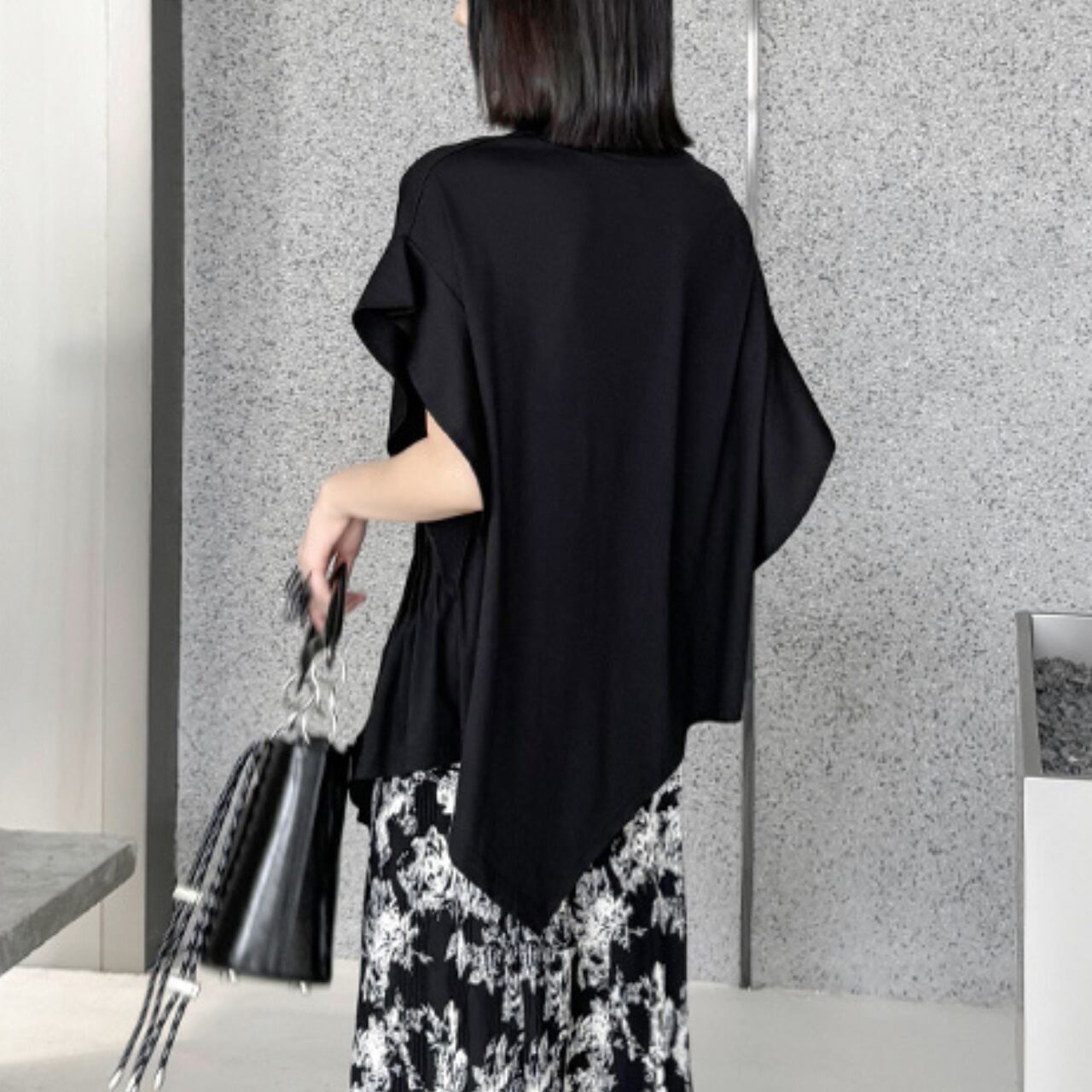 短めの袖丈とアシンメトリーなヘムラインが、洗練された雰囲気を演出します。