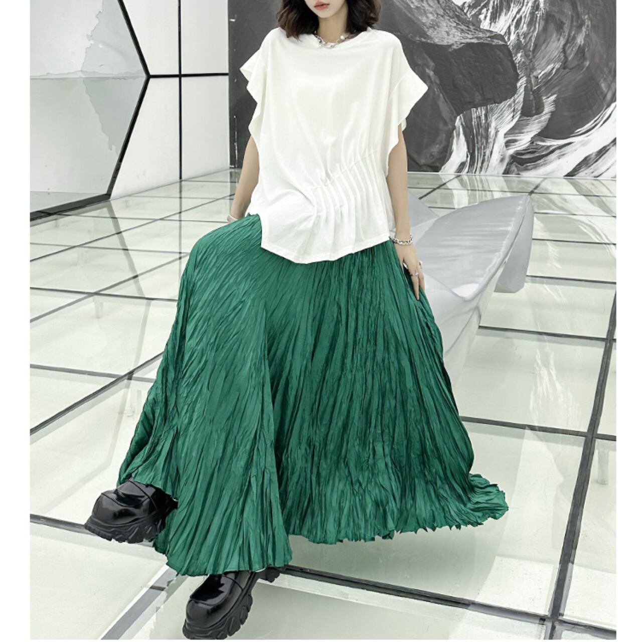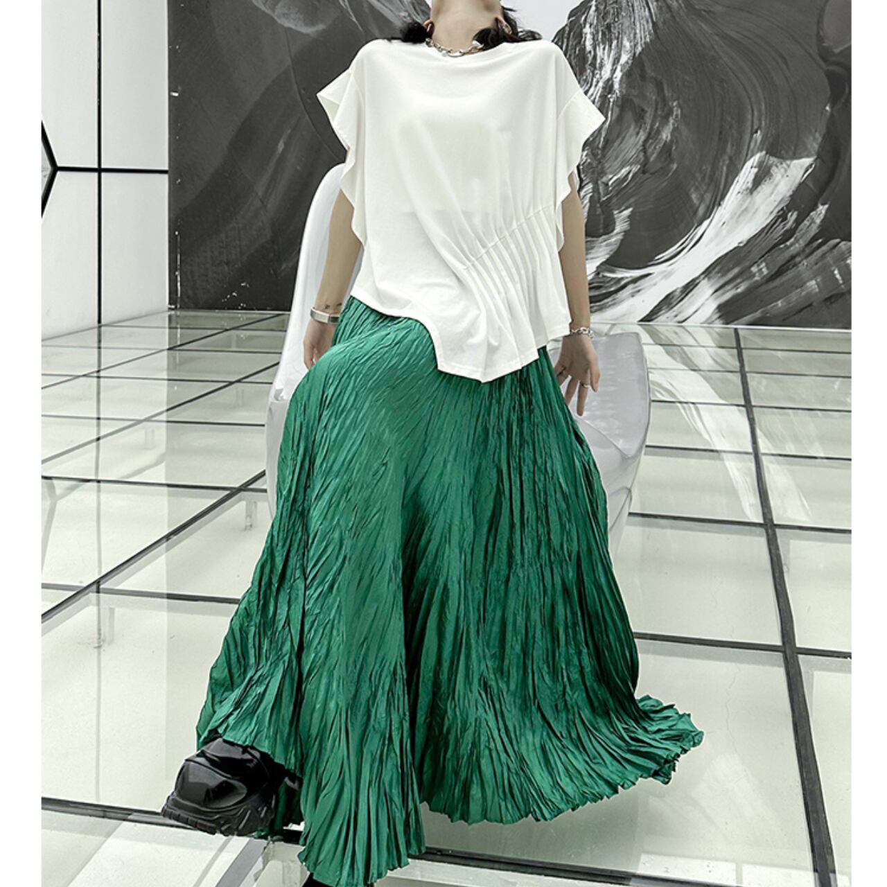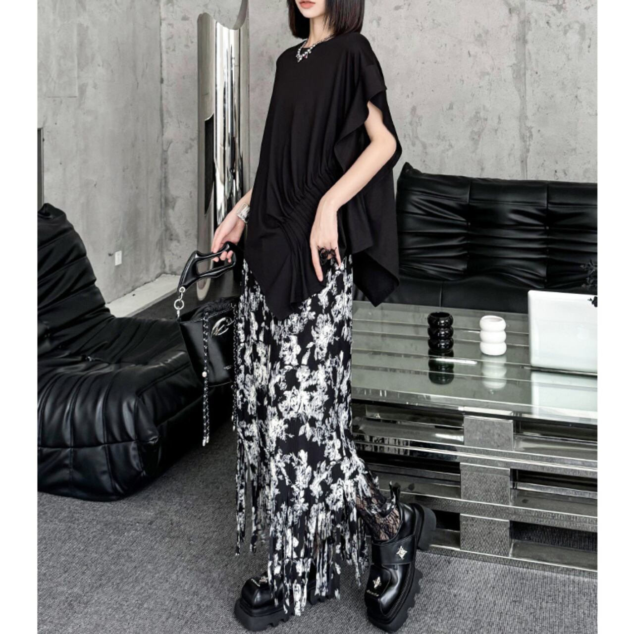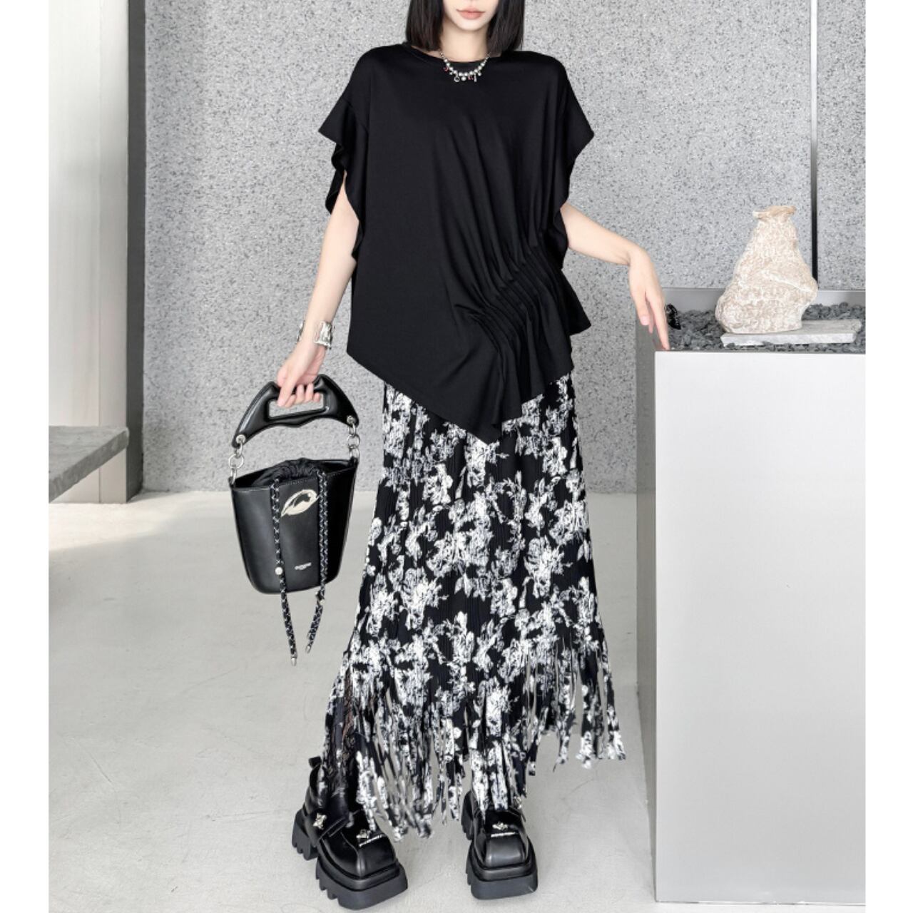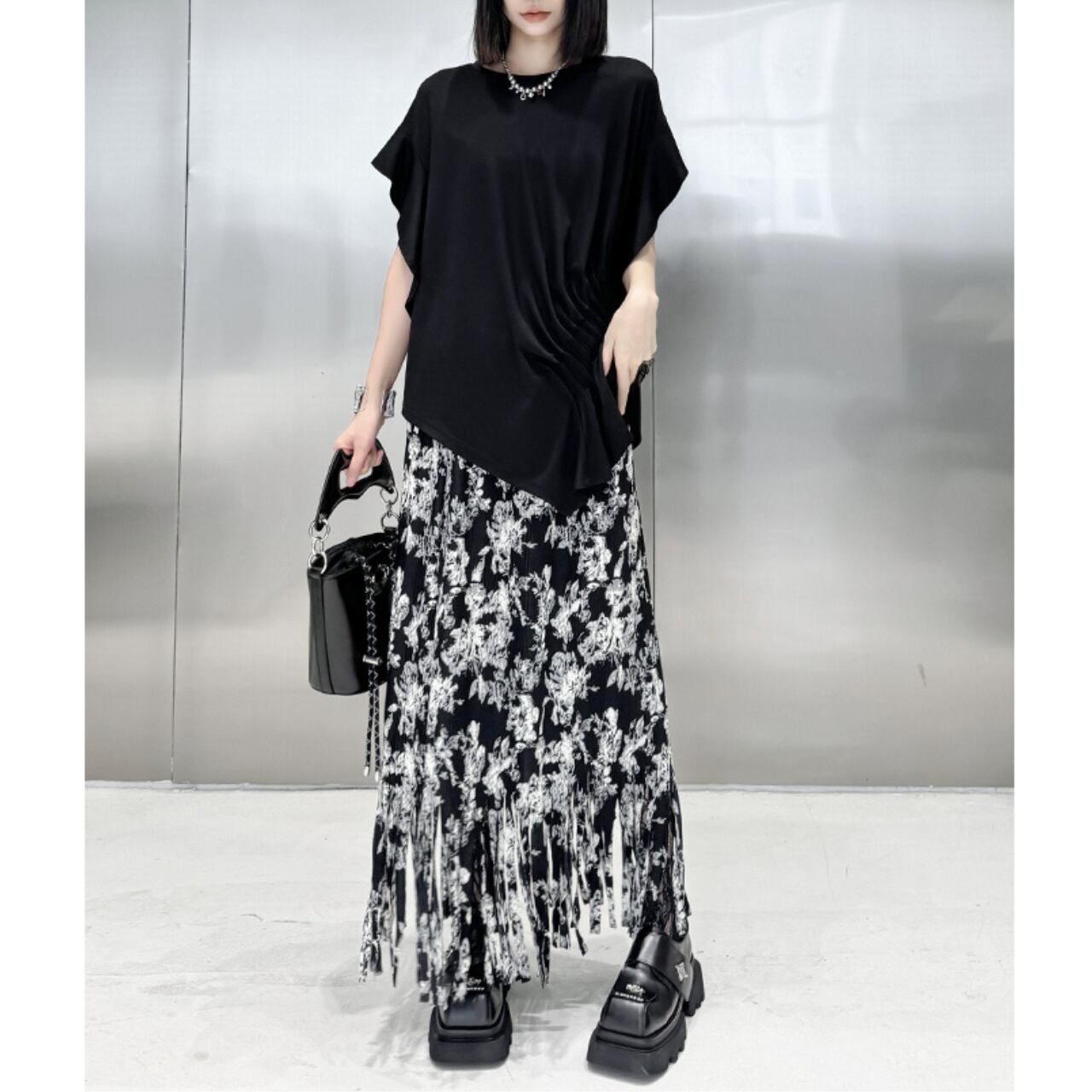 短めの袖丈とアシンメトリーなヘムラインが、洗練された雰囲気を演出します。