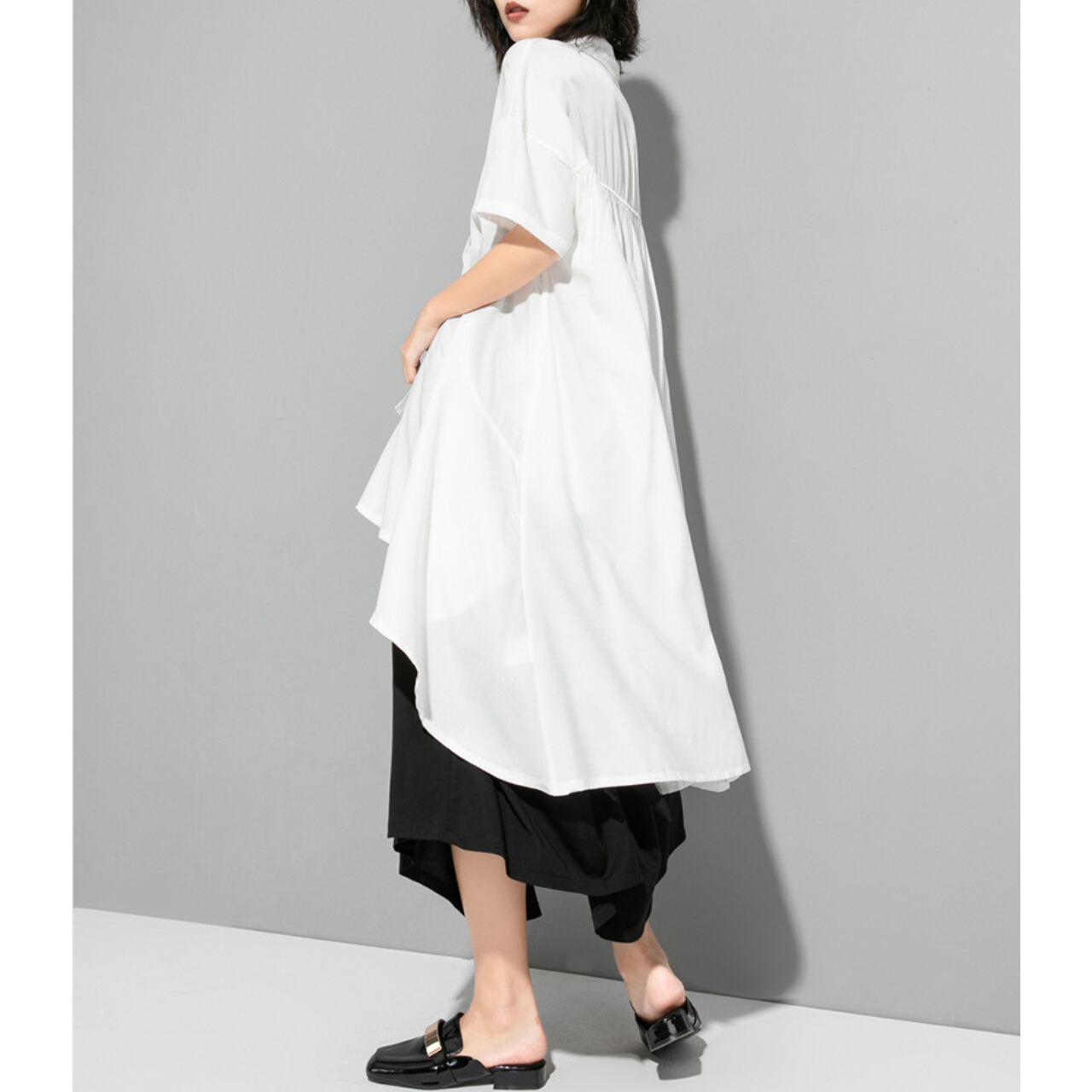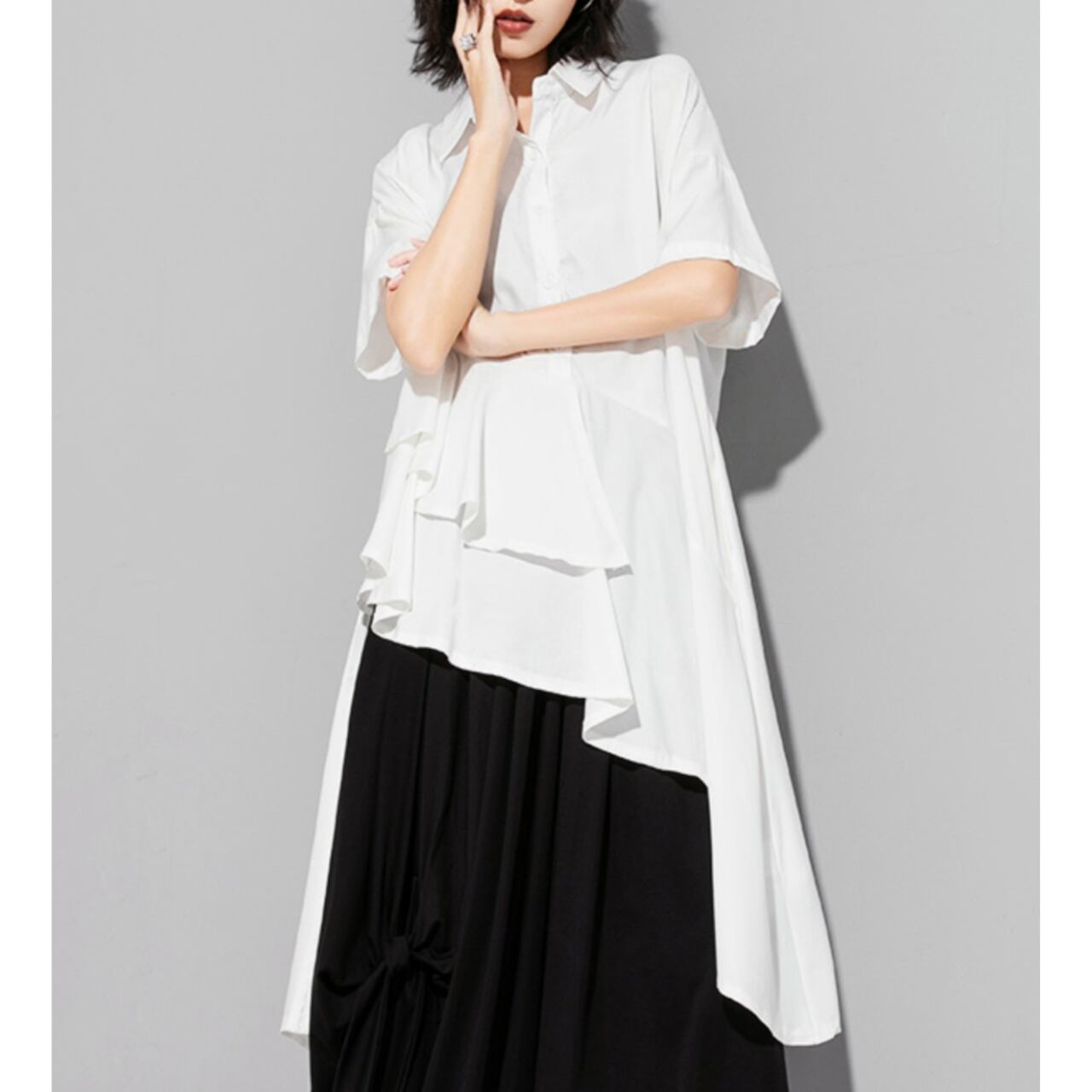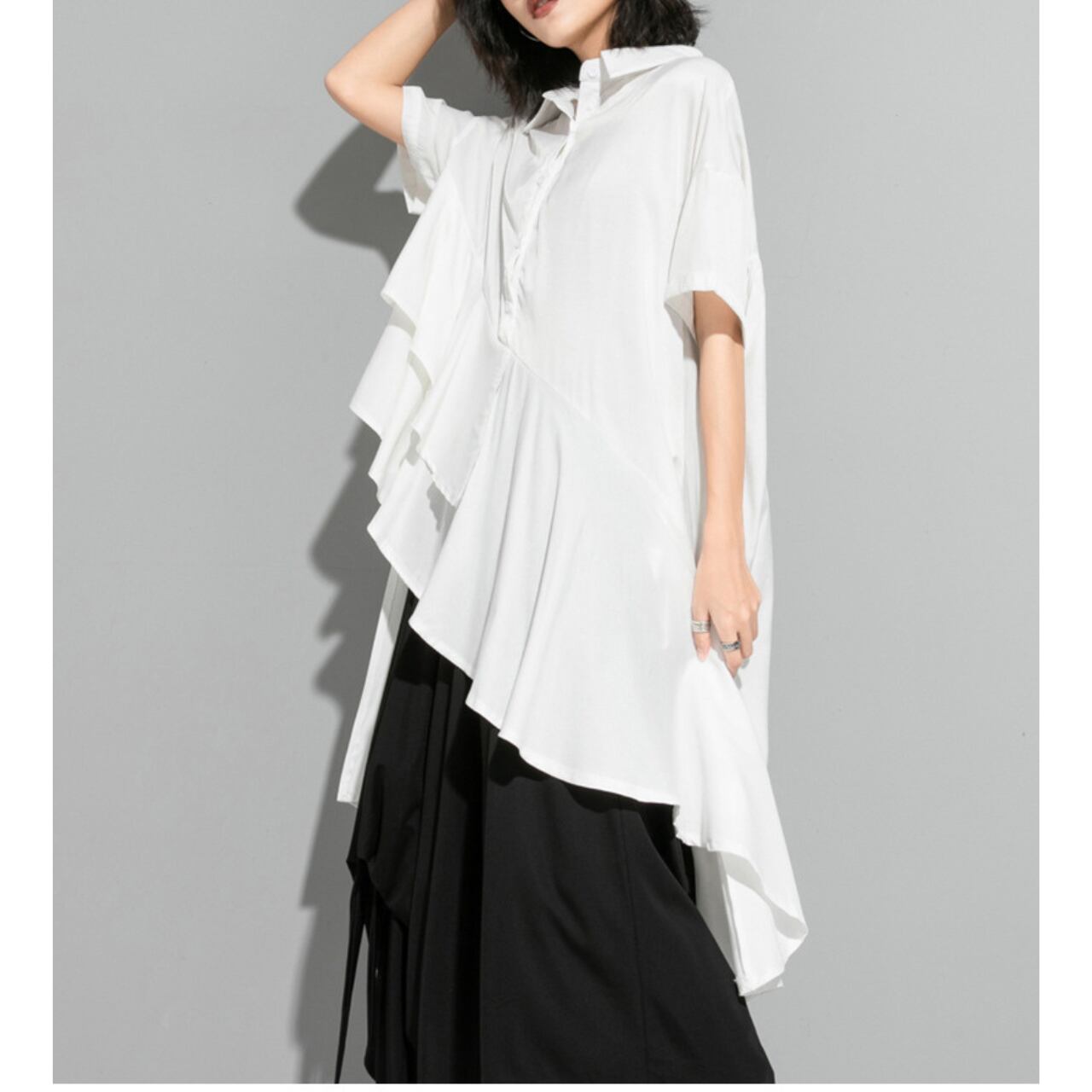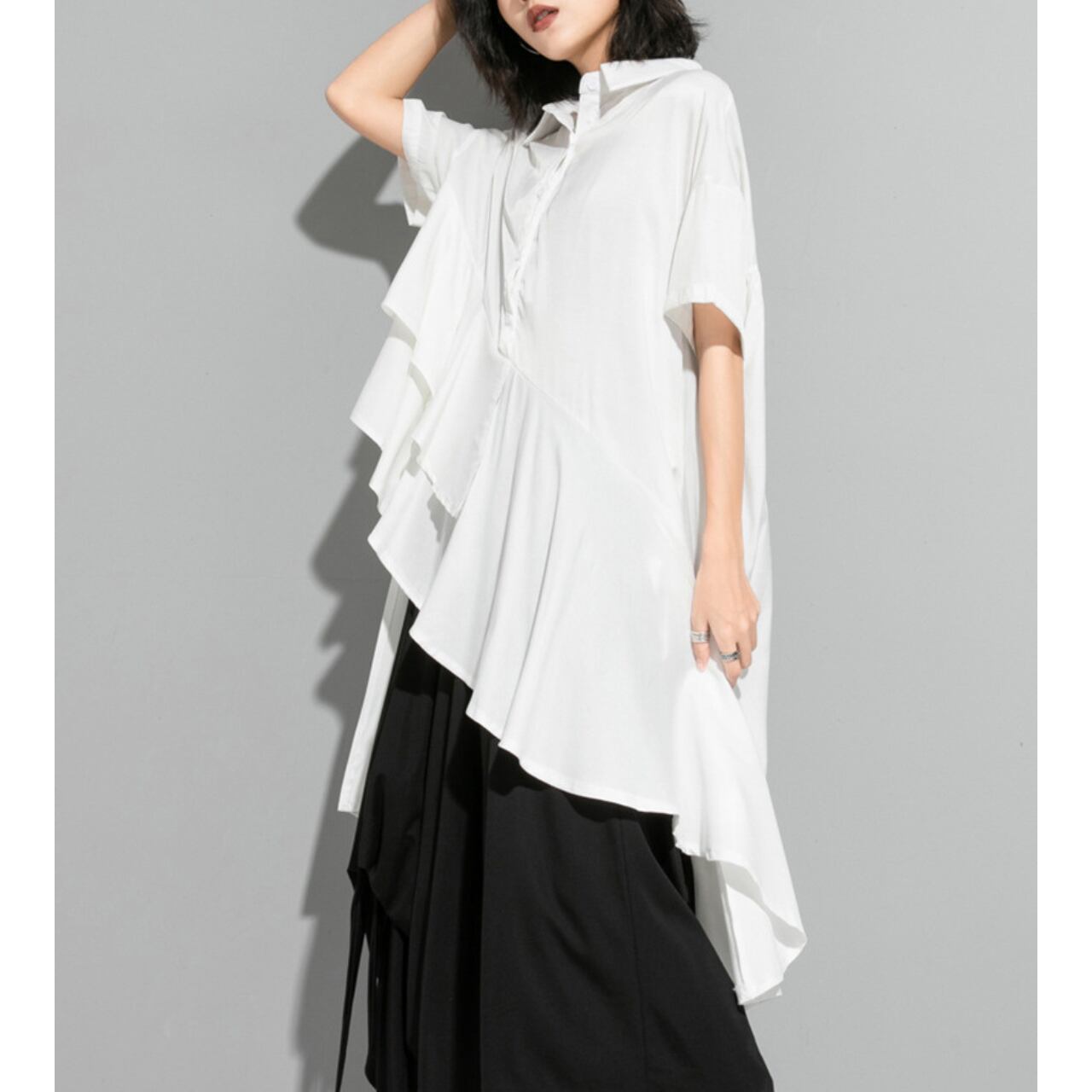アシンメトリーなデザインが目を惹くロングシャツ。
