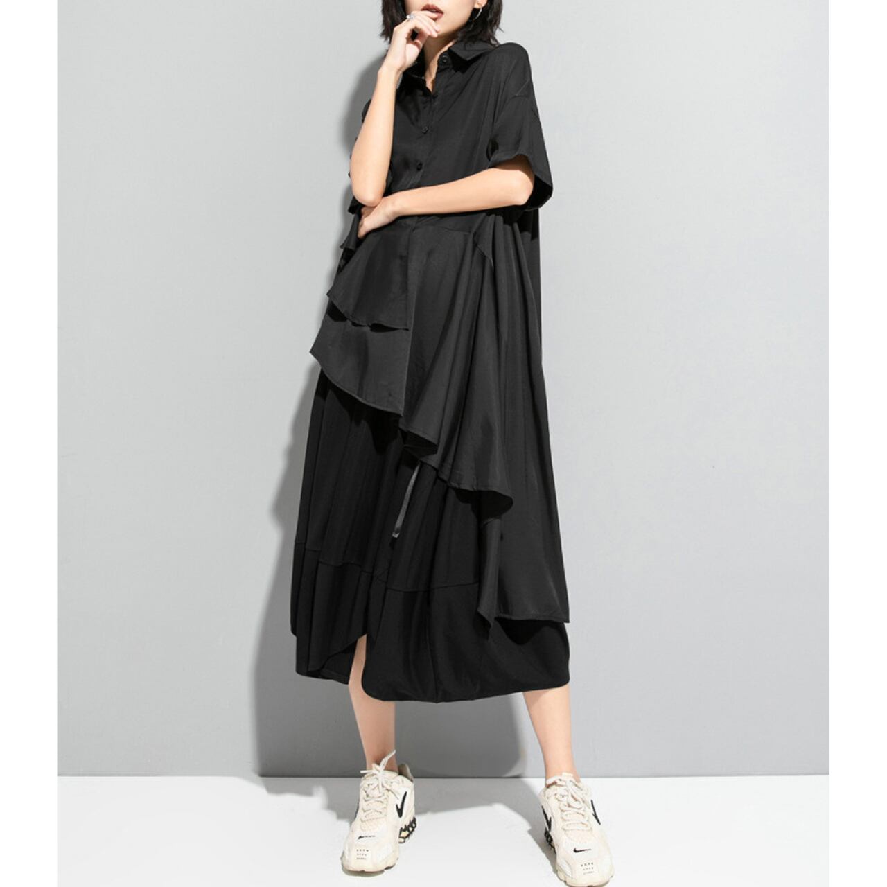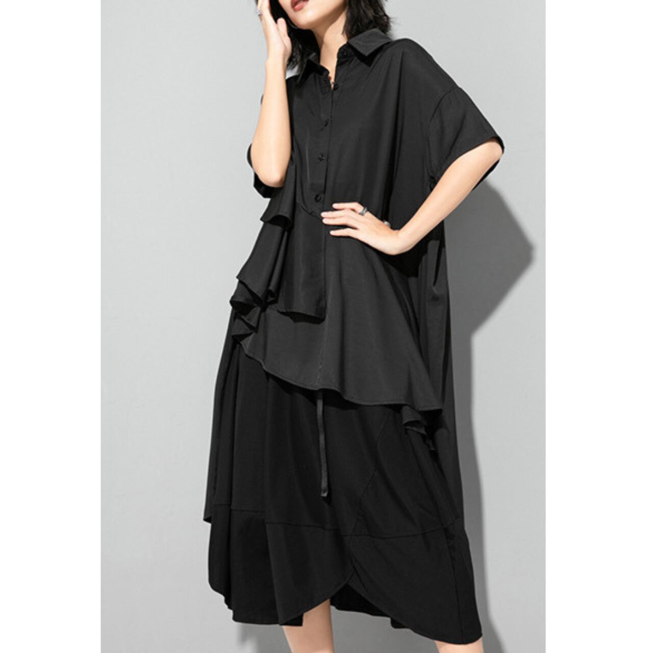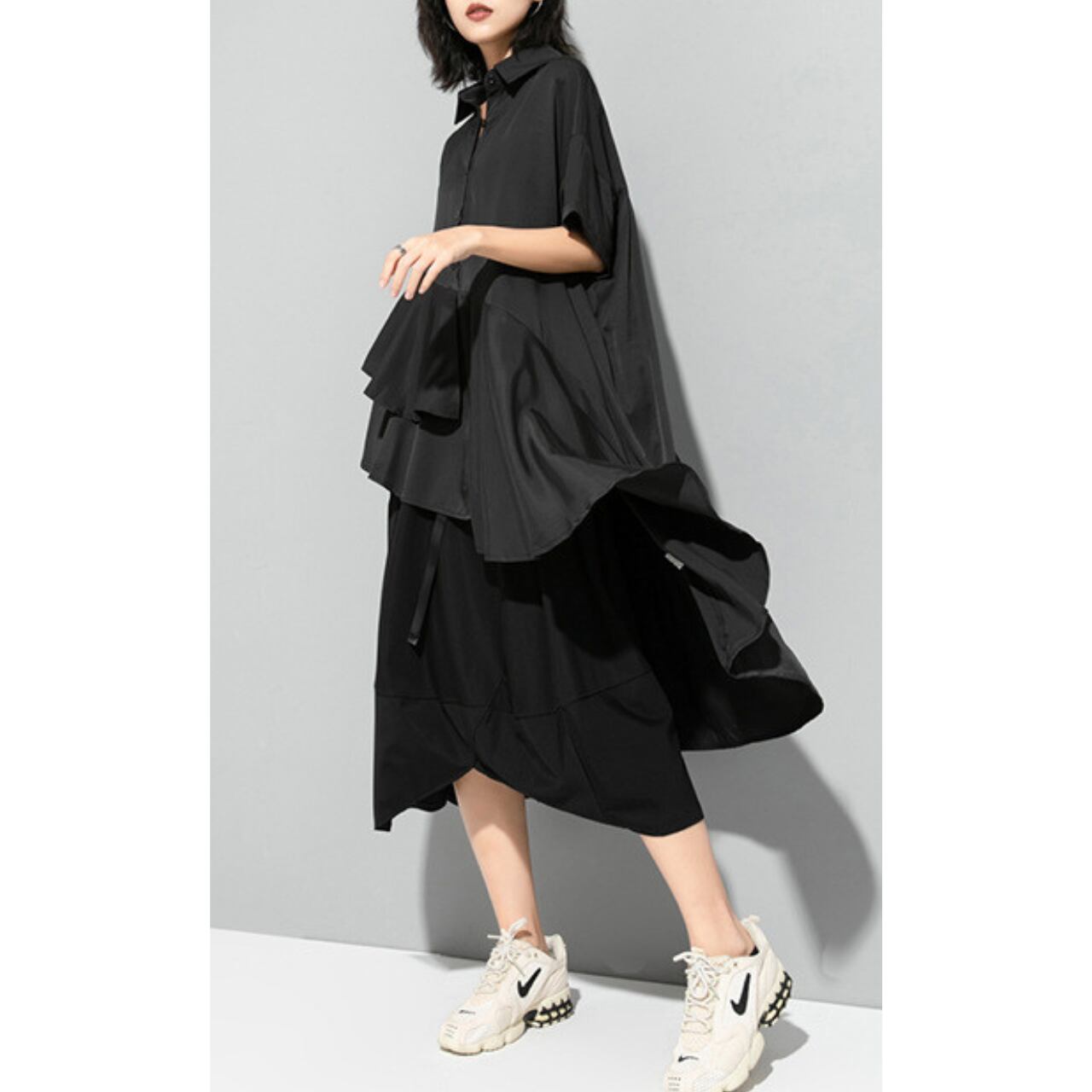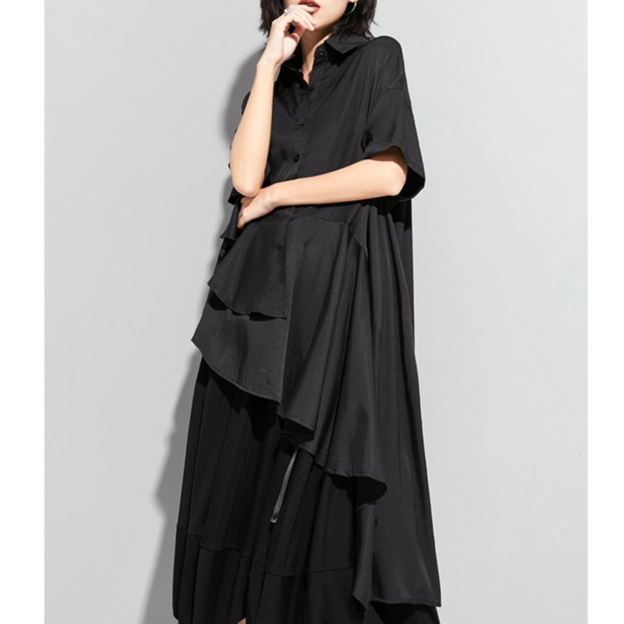 アシンメトリーなデザインが目を惹くロングシャツ。