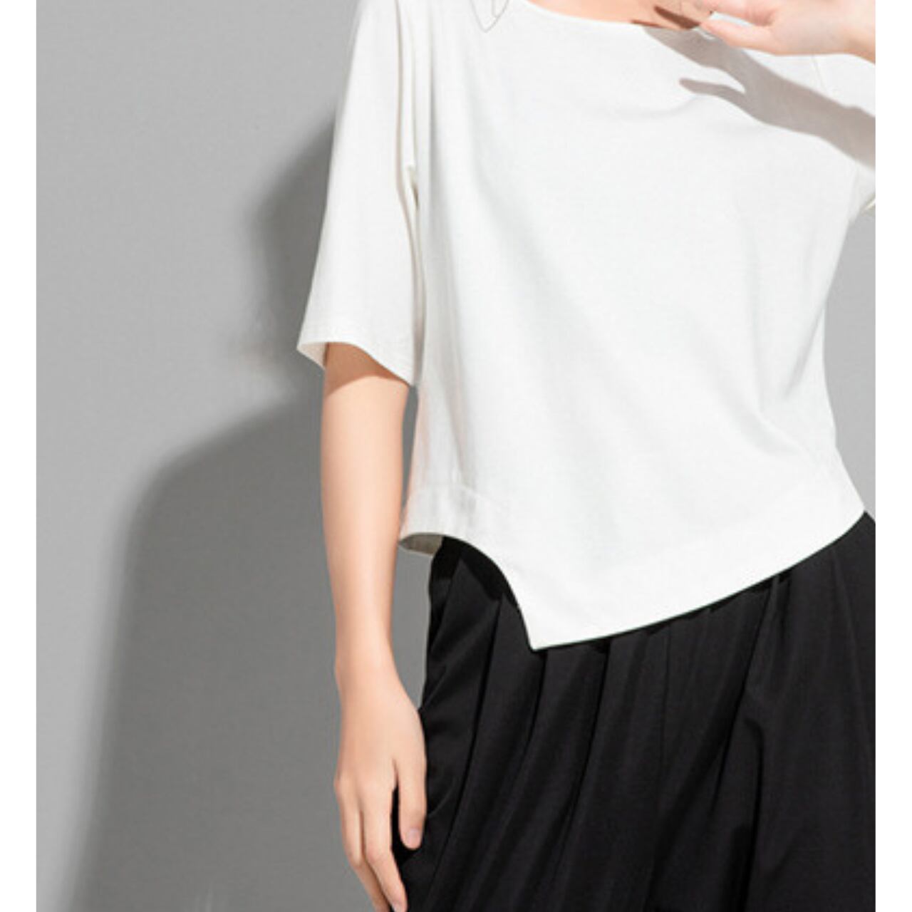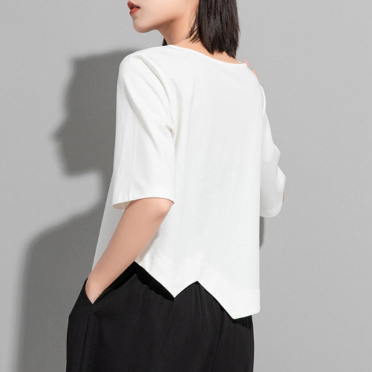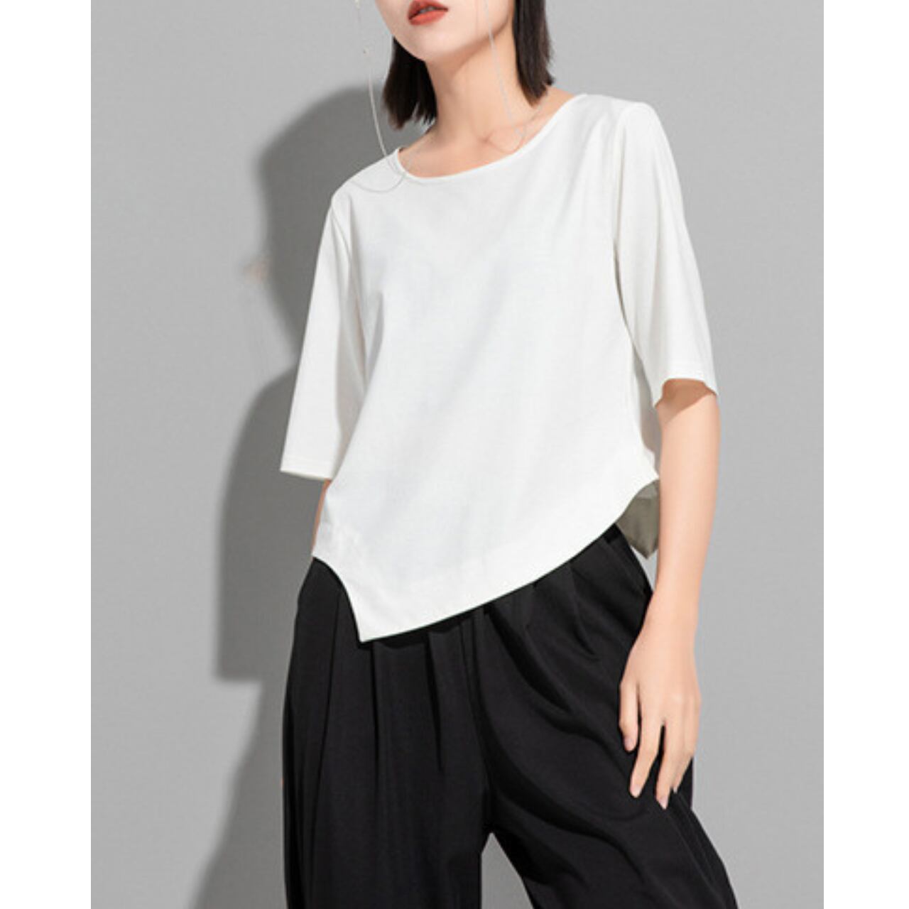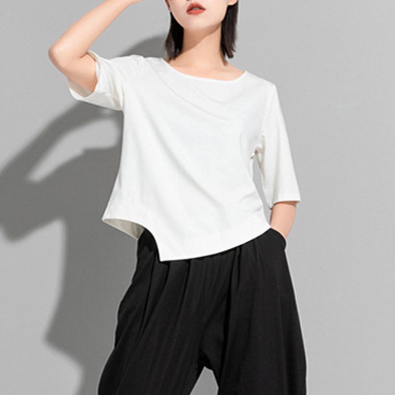 アシンメトリーなデザインが目を惹く、ボートネックのカットソー。 短めの半袖と、裾にかけて斜めにカットされたデザインが、シンプルながらも洗練された印象を与えます。 パンツスタイルにもスカートスタイルにも合わせやすく、様々なコーディネートをお楽しみいただけます。 【サイズ】 M 肩幅 36cm 胸囲 92cm 着丈 49cm 袖丈 28cm L 肩幅 37cm 胸囲 95cm 着丈 50cm 袖丈 29cm XL 肩幅 38cm 胸囲 98cm 着丈 51cm 袖丈 30cm ※採寸方法により1~3cmの誤差がある場合がございます 【カラー】 ホワイト ブラック 【素材】 コットン ナイロン 【お届けについて】 こちらの商品は海外店舗より直接発送となる為、ご入金から1週間〜3週間前後で発送致します。 ◼️注意事項 ・タイミングによっては 商品在庫切れにより注文キャンセルとさせていただく恐れもございますので、予めご了承くださいませ。 ・こちらは輸入品となります。 日本製とは検品基準が異なる為、新品未使用品でも、ごくわずかな汚れや傷がある場合もございます。 ・商品の色味は、お手持ちのデバイスの画面によって実物と若干異なる場合がございます。 ・イメージ違いやサイズ等、お客様都合による交換、返品、キャンセルは対応出来かねます。 ———————————— ご購入前にこちらをお読みください →https://shop.remtry.net/about ————————————