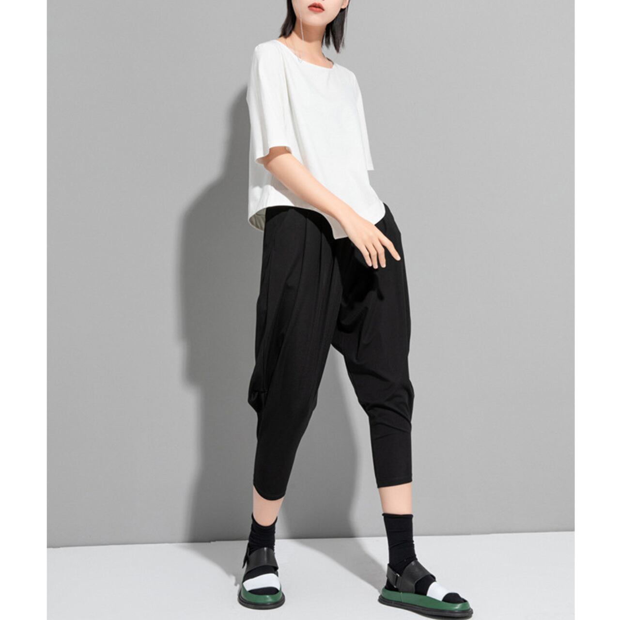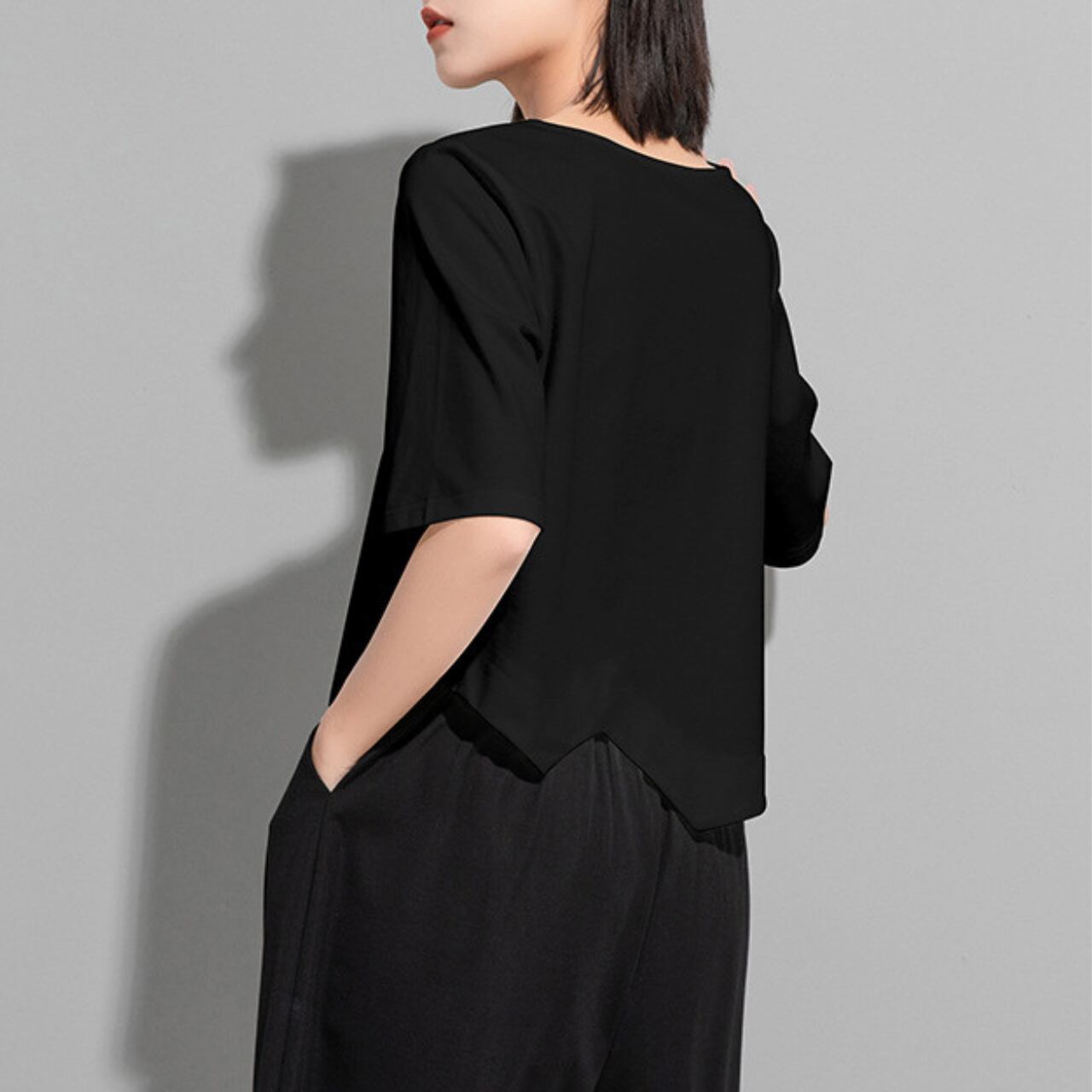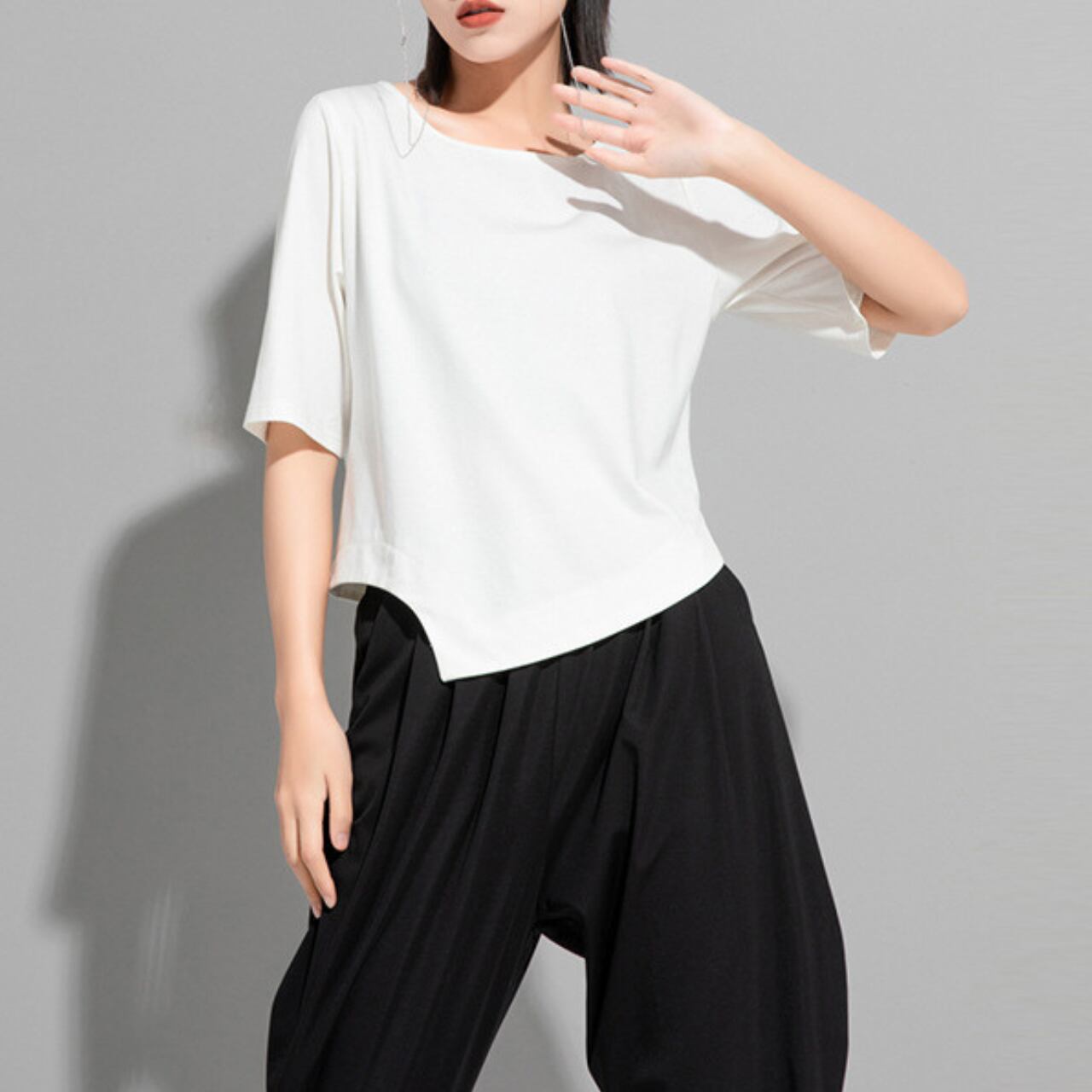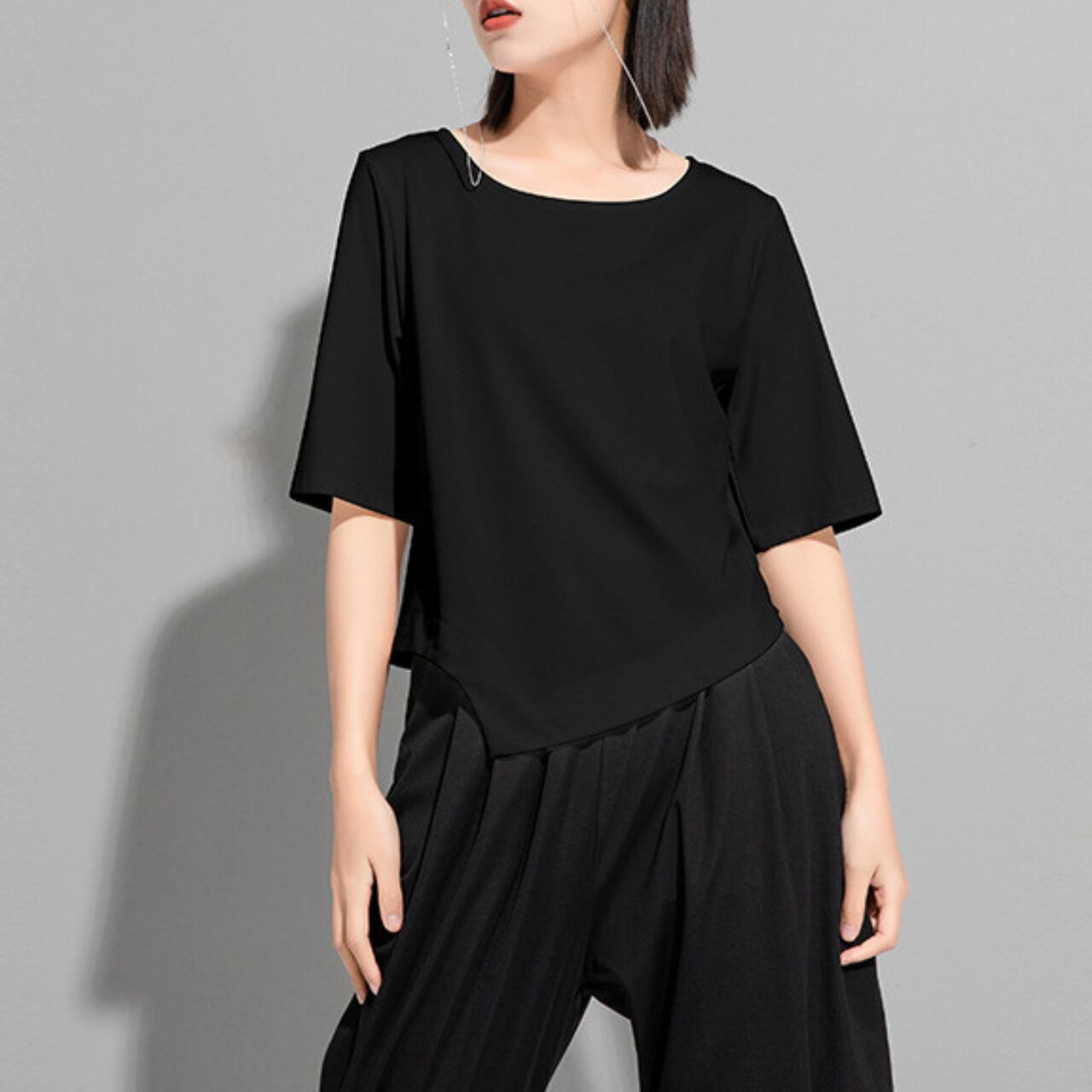 アシンメトリーなデザインが目を惹く、ボートネックのカットソー。 短めの半袖と、裾にかけて斜めにカットされたデザインが、シンプルながらも洗練された印象を与えます。 パンツスタイルにもスカートスタイルにも合わせやすく、様々なコーディネートをお楽しみいただけます。 【サイズ】 M 肩幅 36cm 胸囲 92cm 着丈 49cm 袖丈 28cm L 肩幅 37cm 胸囲 95cm 着丈 50cm 袖丈 29cm XL 肩幅 38cm 胸囲 98cm 着丈 51cm 袖丈 30cm ※採寸方法により1~3cmの誤差がある場合がございます 【カラー】 ホワイト ブラック 【素材】 コットン ナイロン 【お届けについて】 こちらの商品は海外店舗より直接発送となる為、ご入金から1週間〜3週間前後で発送致します。 ◼️注意事項 ・タイミングによっては 商品在庫切れにより注文キャンセルとさせていただく恐れもございますので、予めご了承くださいませ。 ・こちらは輸入品となります。 日本製とは検品基準が異なる為、新品未使用品でも、ごくわずかな汚れや傷がある場合もございます。 ・商品の色味は、お手持ちのデバイスの画面によって実物と若干異なる場合がございます。 ・イメージ違いやサイズ等、お客様都合による交換、返品、キャンセルは対応出来かねます。 ———————————— ご購入前にこちらをお読みください →https://shop.remtry.net/about ————————————