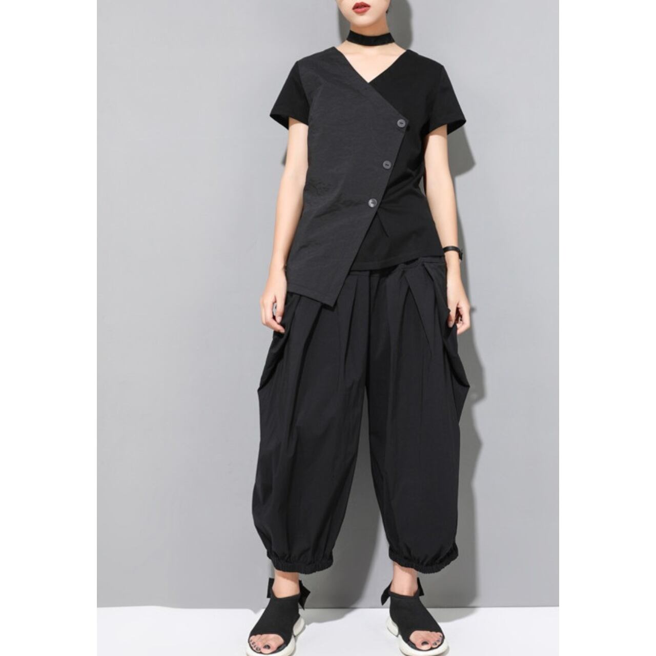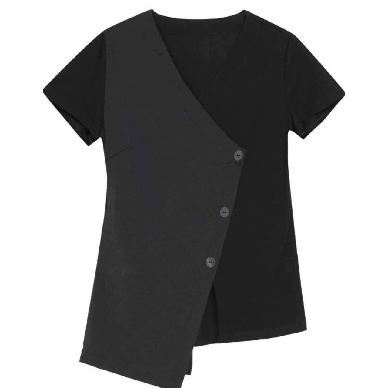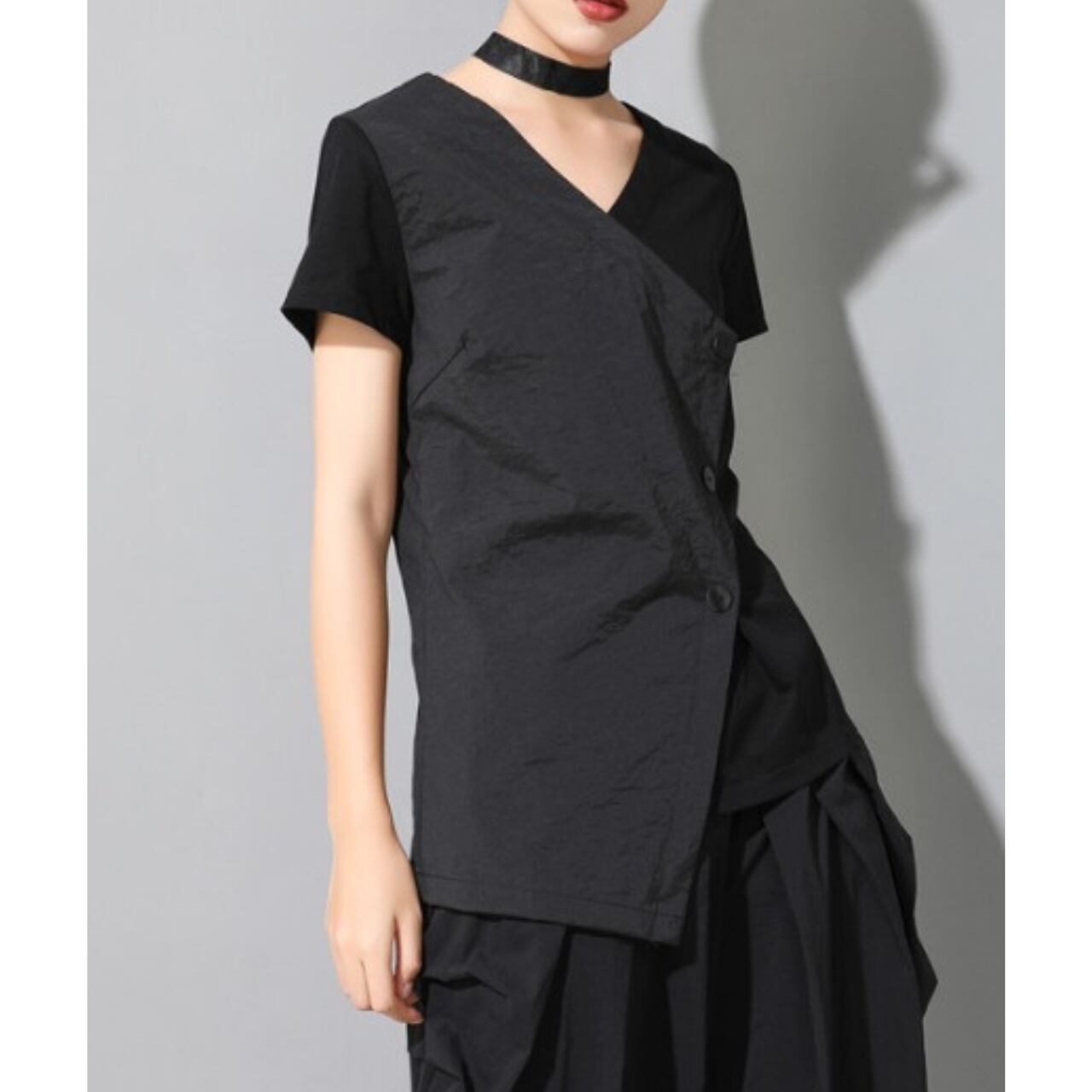 大胆なVネックと斜めに配置されたボタンが目を惹く、ショートスリーブブラウス。 シャープかつスタイリッシュな印象を演出します。 シンプルなデザインながらも、個性的なシルエットで着こなしにアクセントを加え、パンツスタイルにもスカートスタイルにも合わせやすい一枚です。 【サイズ】 M 肩幅 37cm 胸囲 92cm 着丈左 68cm 着丈右 60cm 袖丈 16cm L 肩幅 38cm 胸囲 96cm 着丈左 69cm 着丈右 61cm 袖丈 17cm XL 肩幅 39cm 胸囲 100cm 着丈左 70cm 着丈右 62cm 袖丈 18cm XXL 肩幅 40cm 胸囲 104cm 着丈左 71cm 着丈右 63cm 袖丈 19cm ※採寸方法により1~3cmの誤差がある場合がございます 【カラー】 ブラック 【素材】 ナイロン アクリル 【お届けについて】 こちらの商品は海外店舗より直接発送となる為、ご入金から1週間〜3週間前後で発送致します。 ◼️注意事項 ・タイミングによっては 商品在庫切れにより注文キャンセルとさせていただく恐れもございますので、予めご了承くださいませ。 ・こちらは輸入品となります。 日本製とは検品基準が異なる為、新品未使用品でも、ごくわずかな汚れや傷がある場合もございます。 ・商品の色味は、お手持ちのデバイスの画面によって実物と若干異なる場合がございます。 ・イメージ違いやサイズ等、お客様都合による交換、返品、キャンセルは対応出来かねます。 ———————————— ご購入前にこちらをお読みください →https://shop.remtry.net/about ————————————
