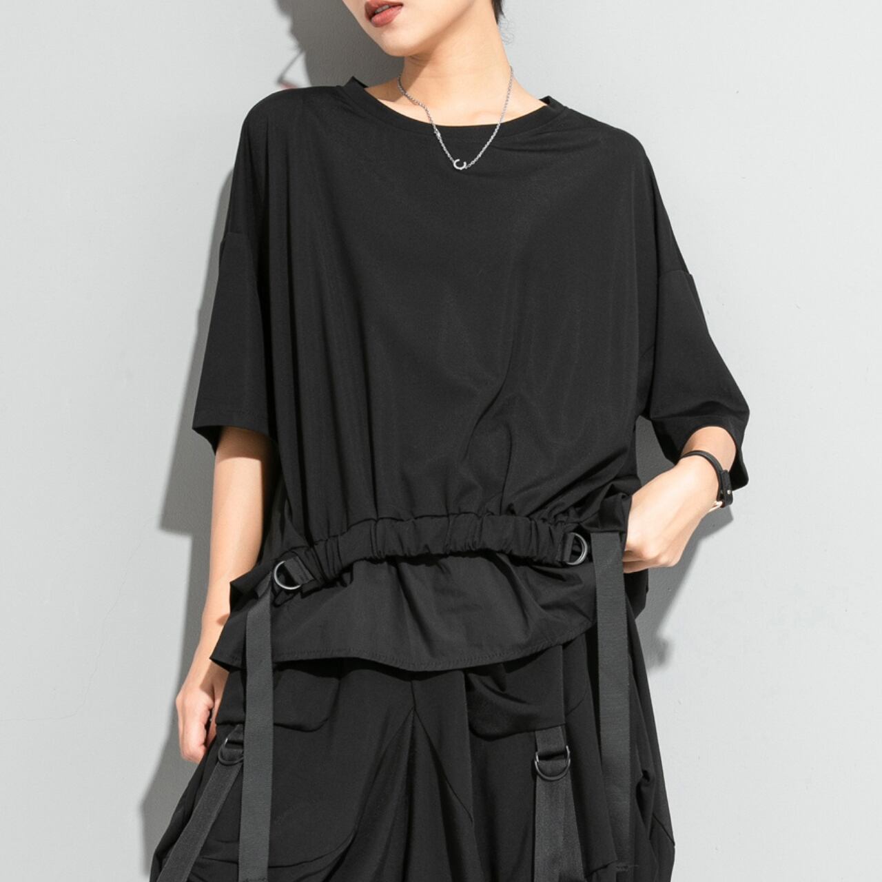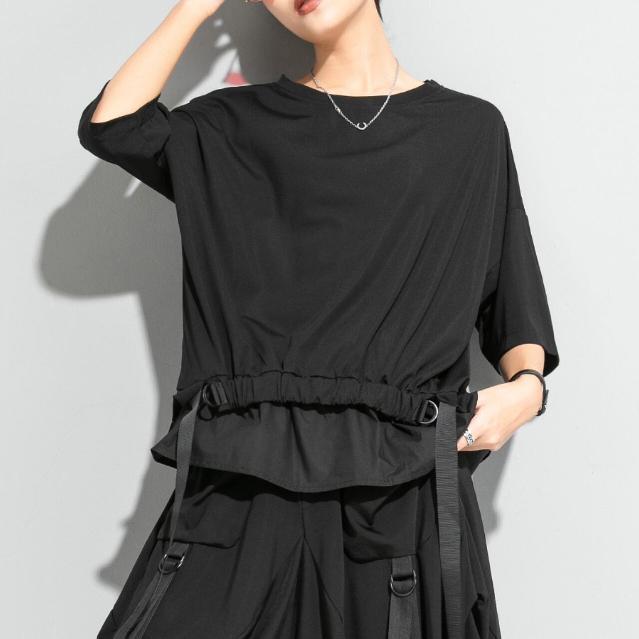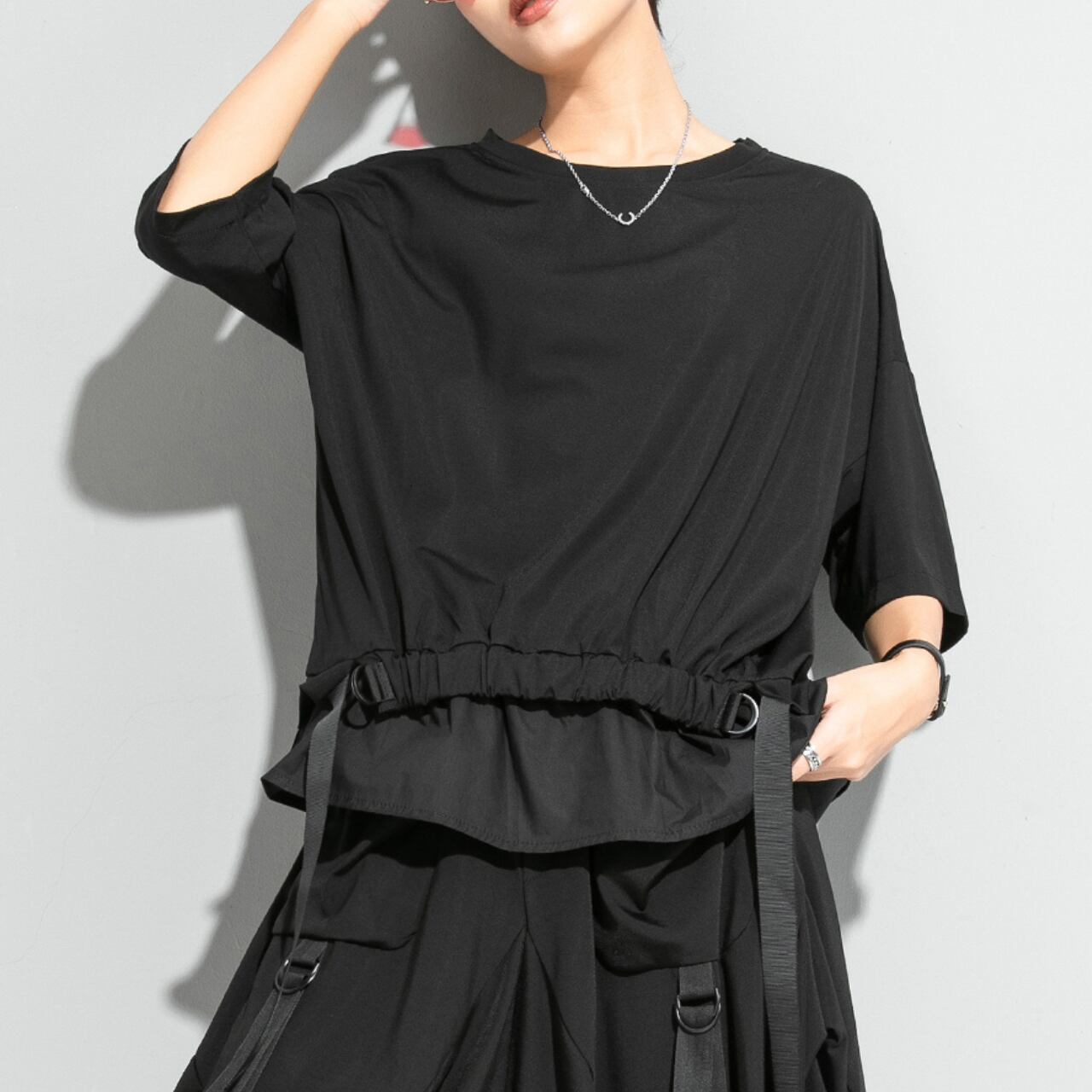 ウエスト部分のストリングベルトが、シルエットにアクセントを加え、着こなしに変化を与えます。