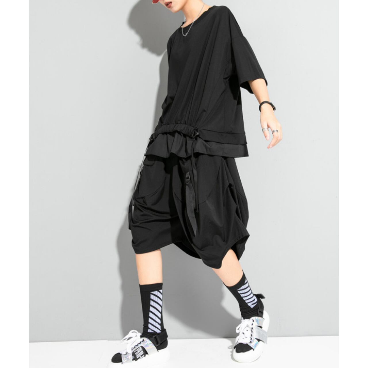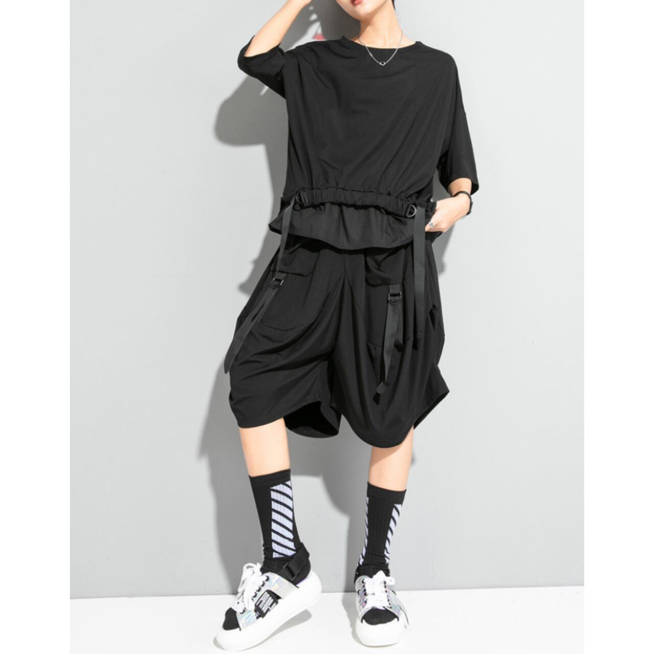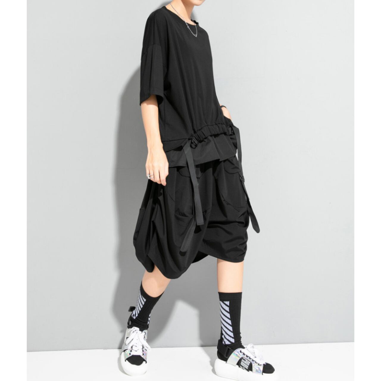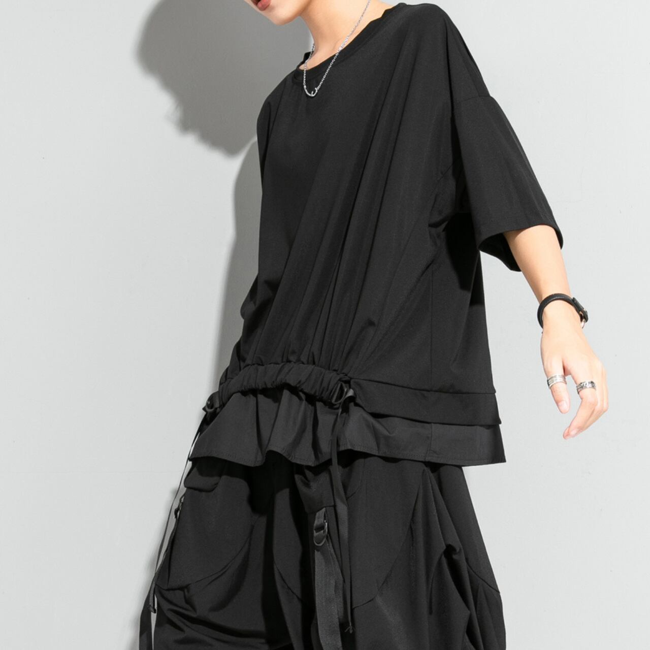 ウエスト部分のストリングベルトが、シルエットにアクセントを加え、着こなしに変化を与えます。