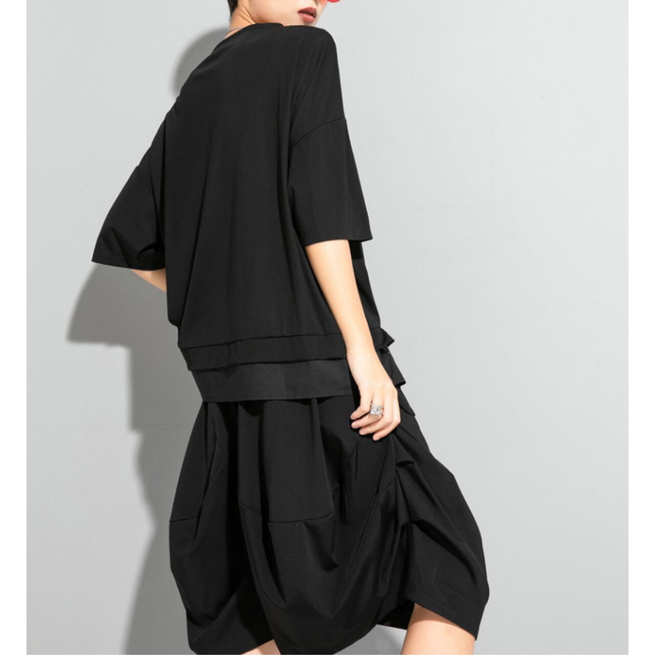 ドロップショルダーと五分袖のデザインが、リラックス感を演出するトップス。