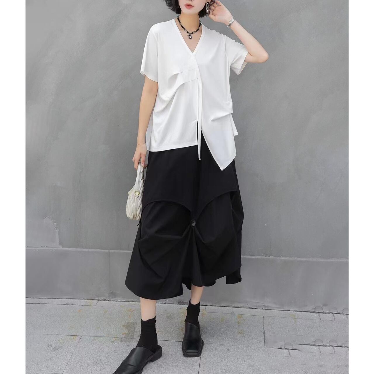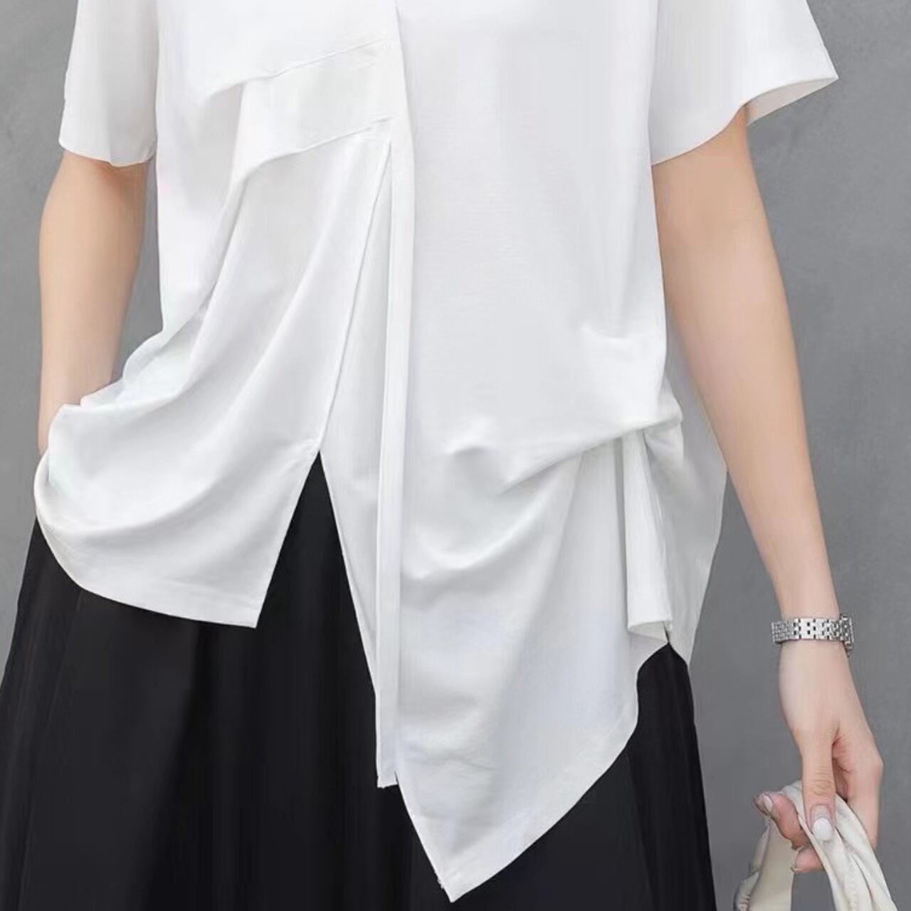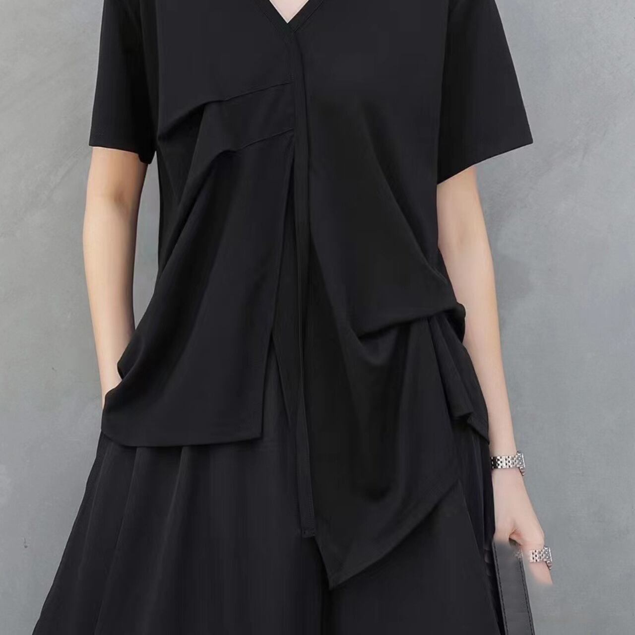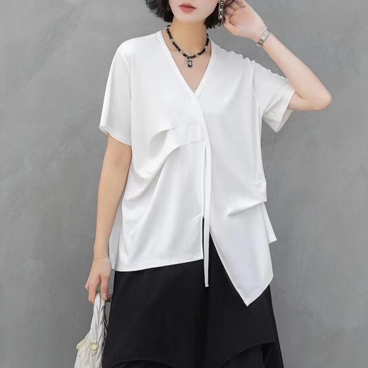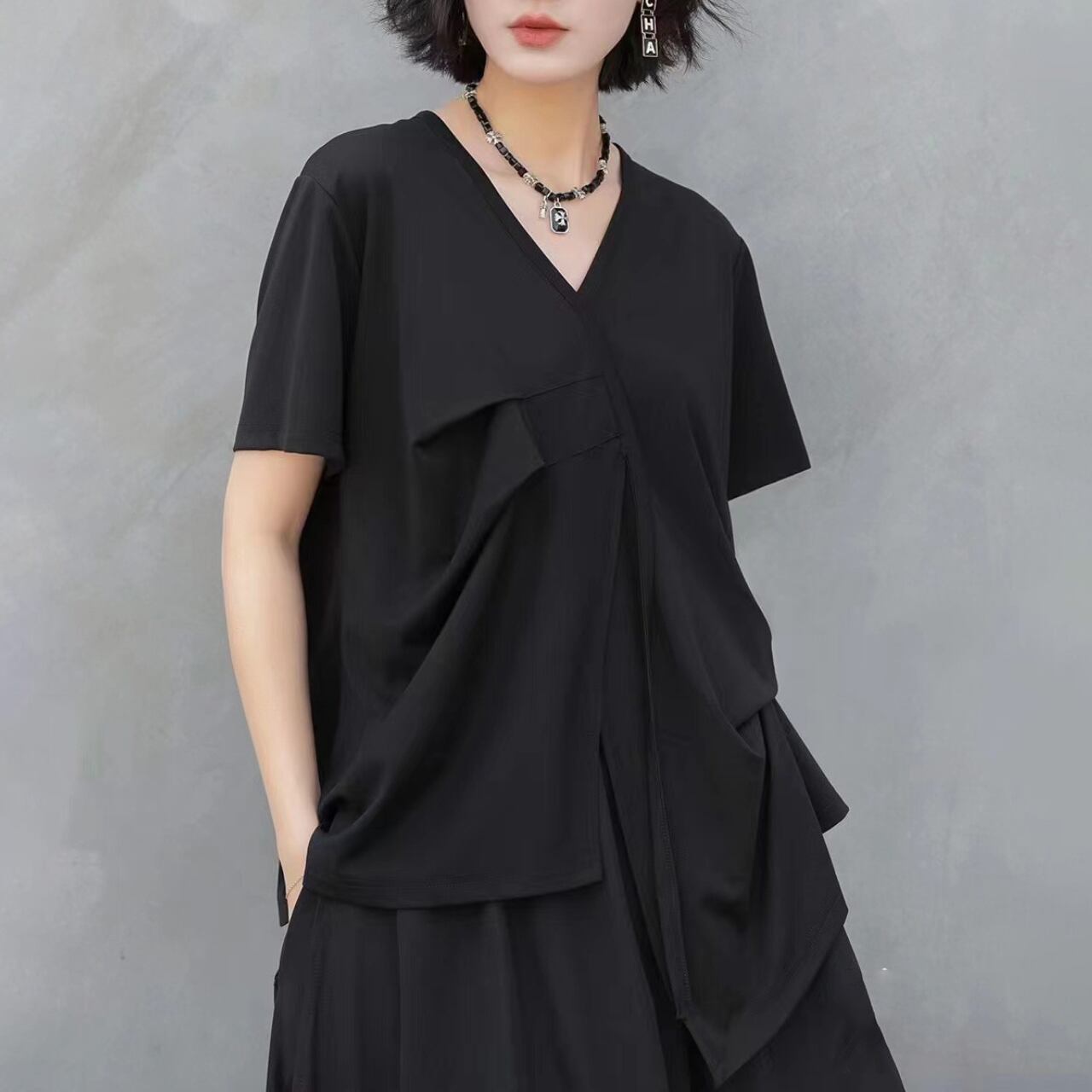 Drape Design Asymmetrical V-Neck Oversized T-Shirt 00117