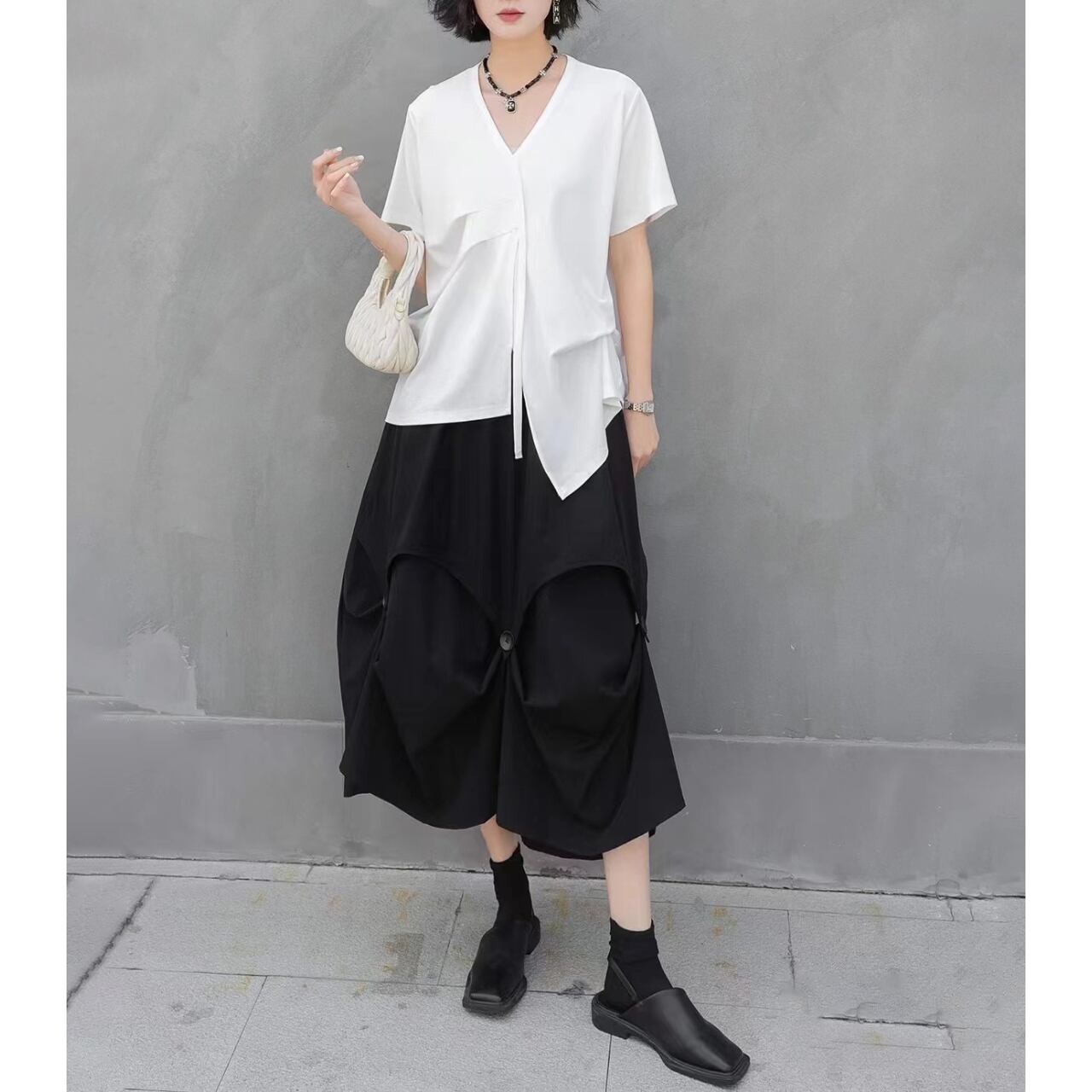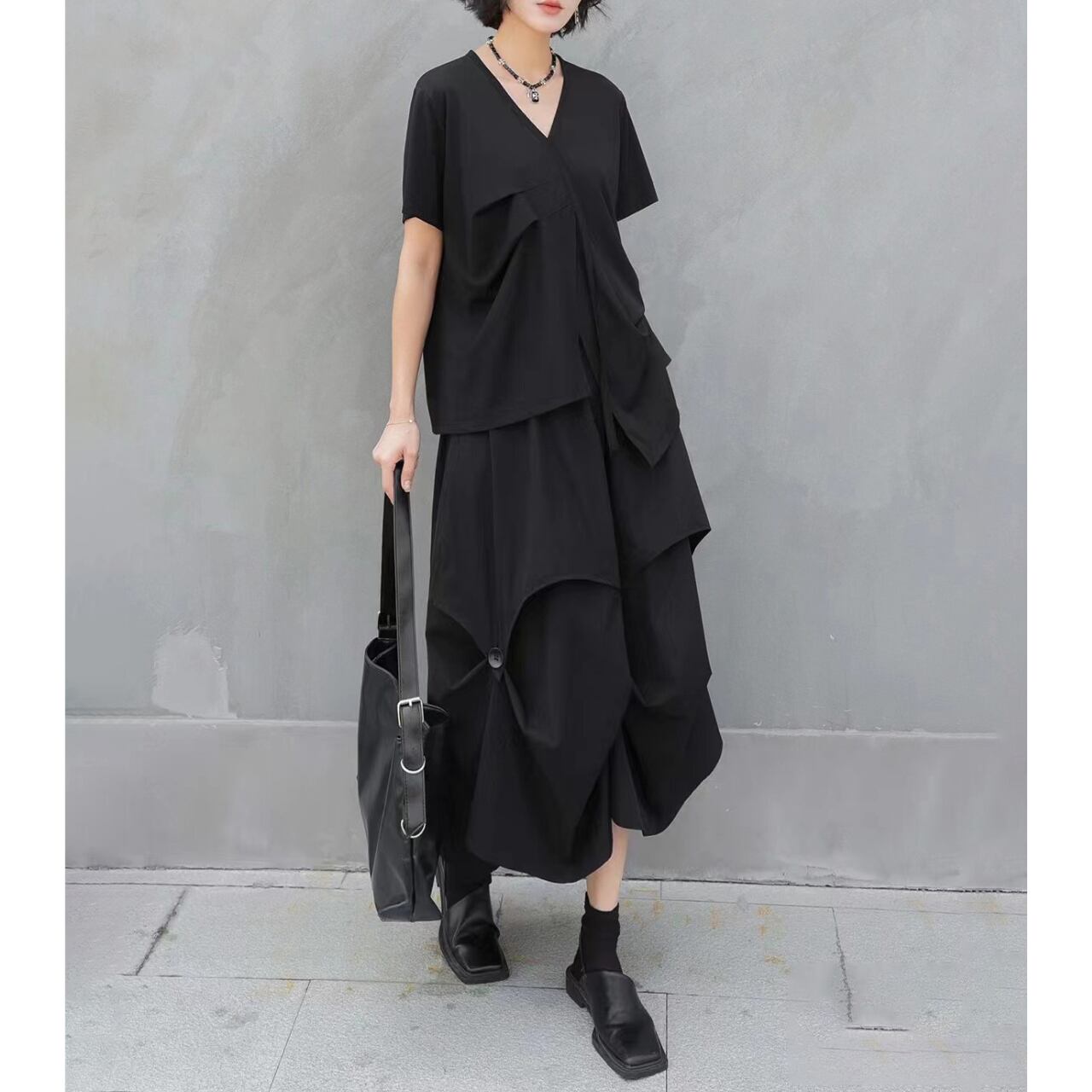 ドレープが自然な落ち感とシルエットを生み出し、着るだけでこなれた雰囲気を演出します。