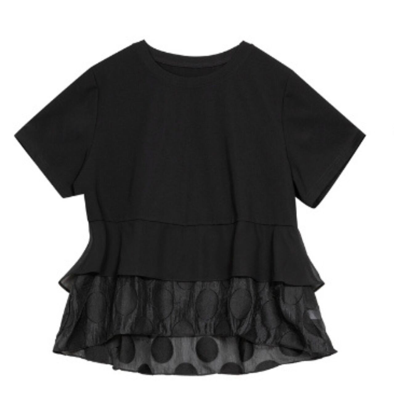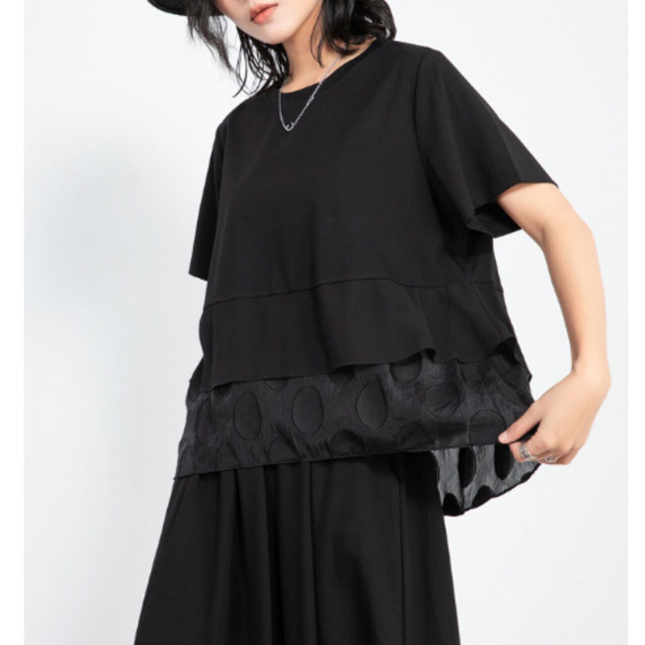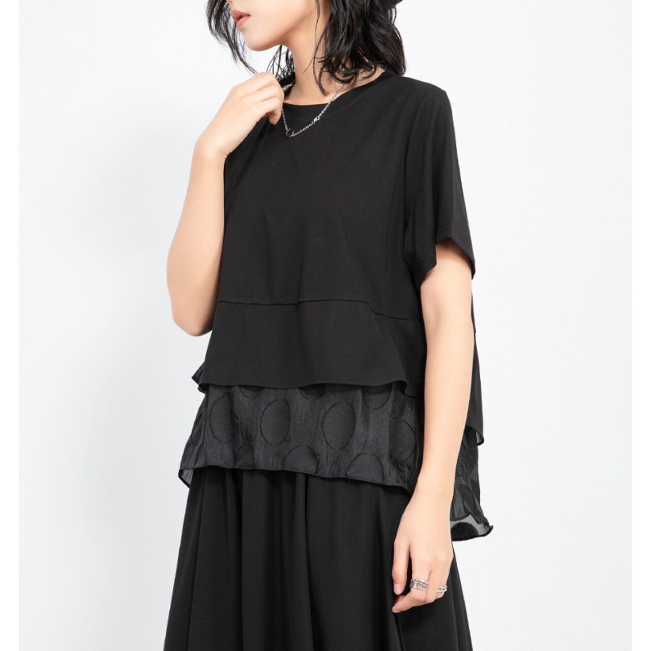 重ね着風のデザインが目を惹く、ショートスリーブのトップス。