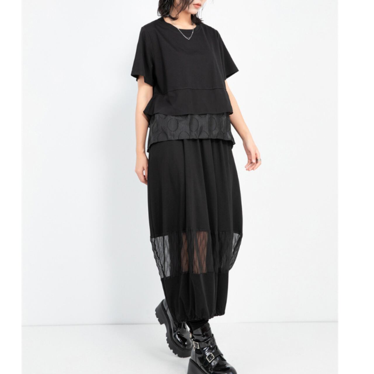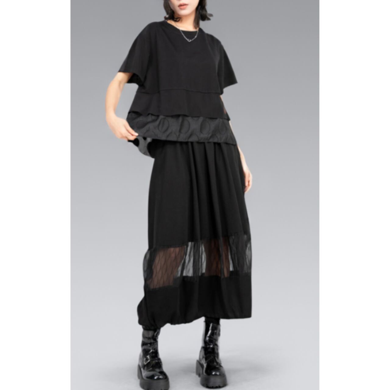 シンプルなデザインながら、レイヤードされたティアード部分が程よいアクセントとなり、着こなしに奥行きを与えます。