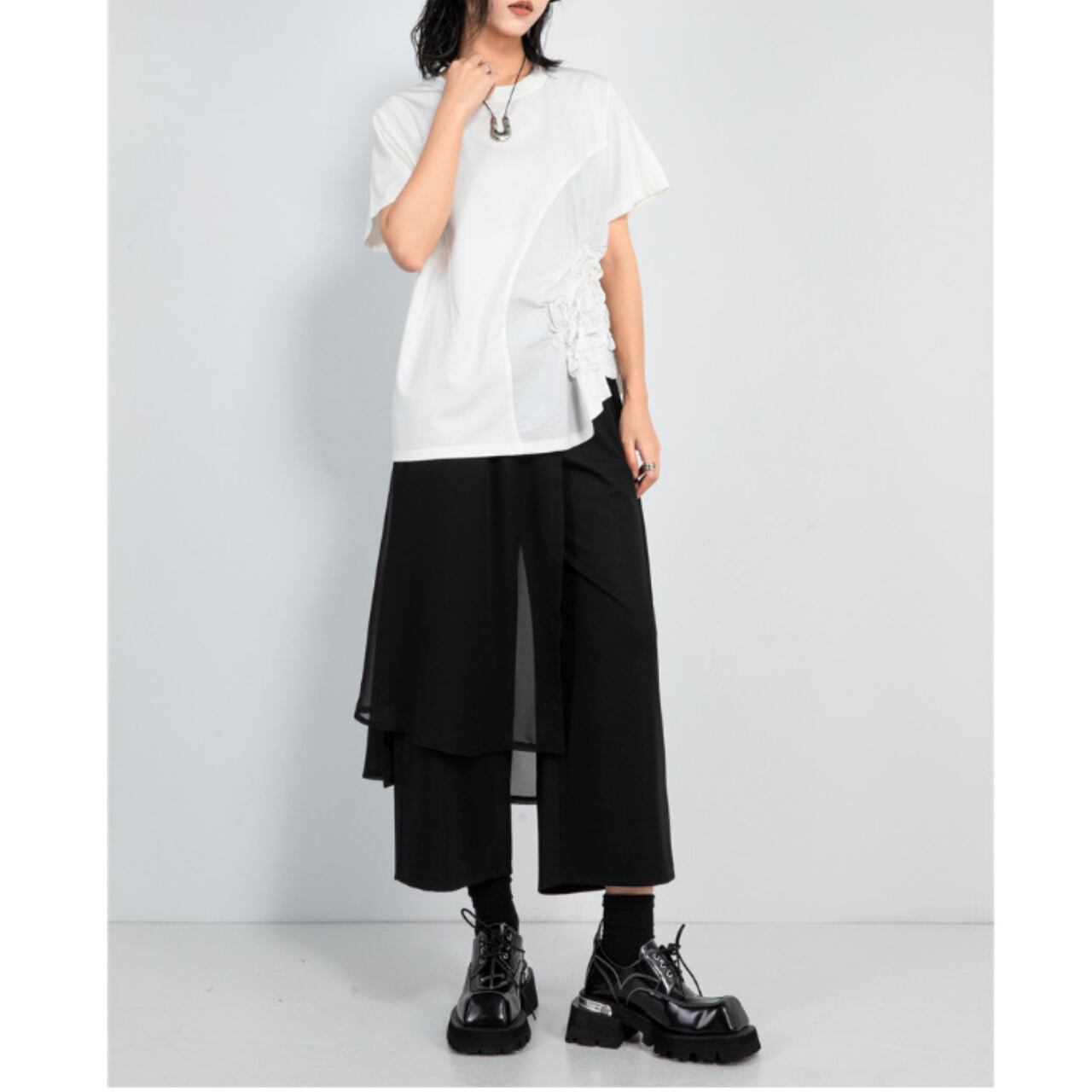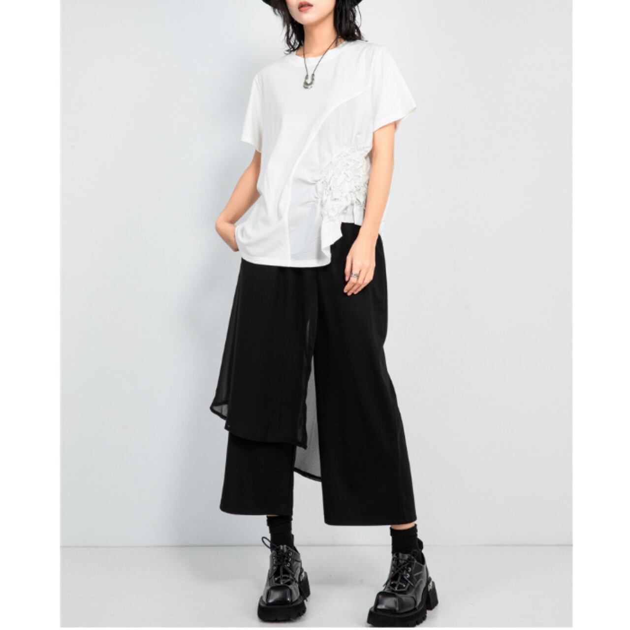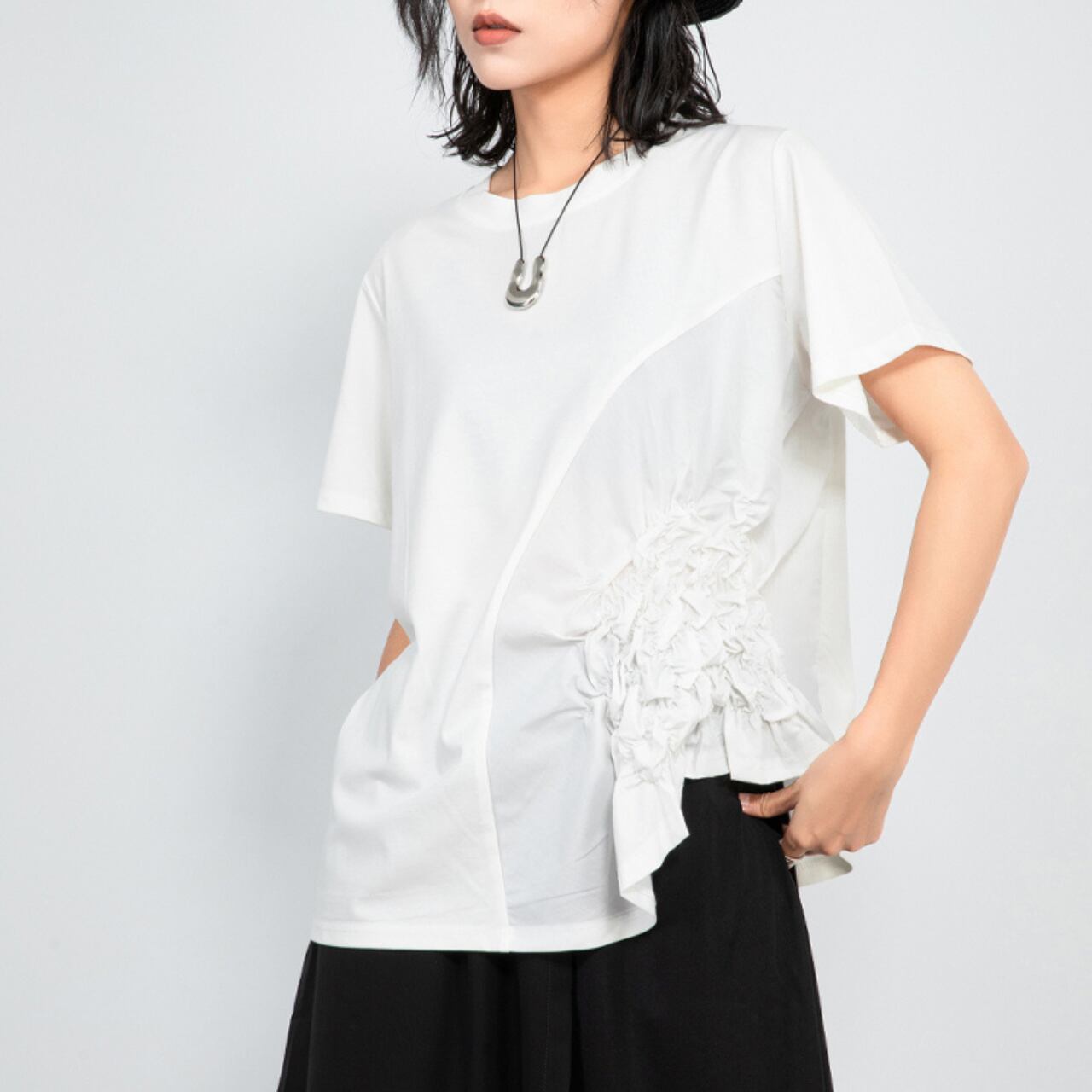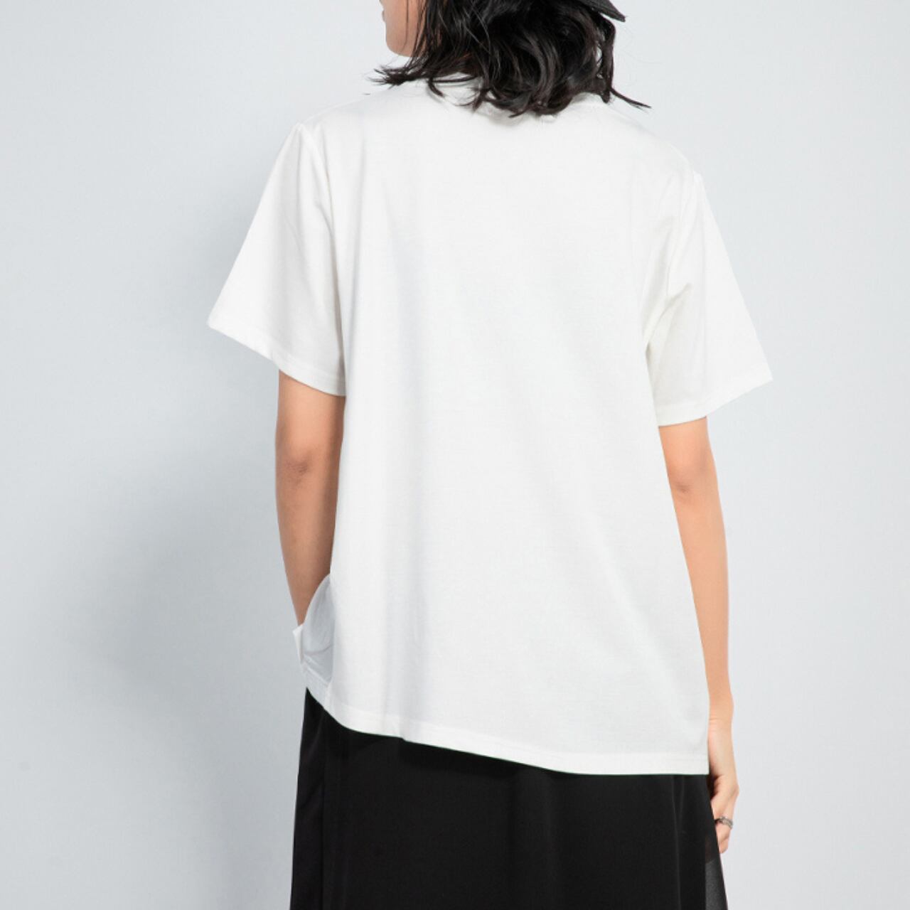 アシンメトリーなデザインが目を惹く、オーバーサイズのショートスリーブTシャツ。