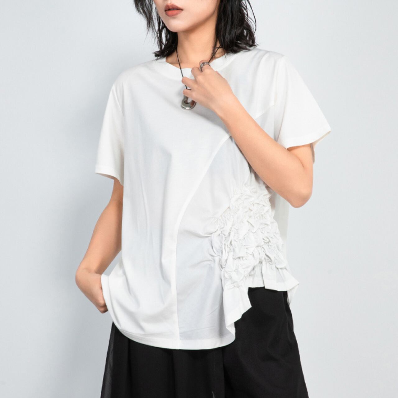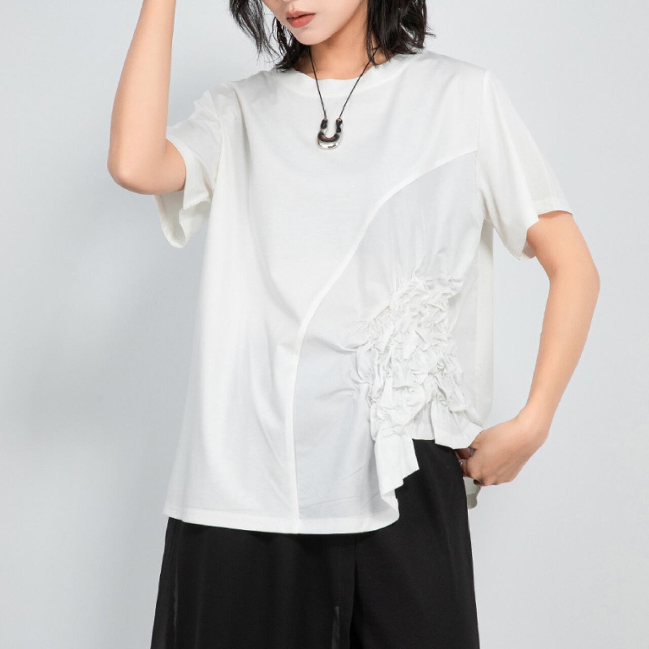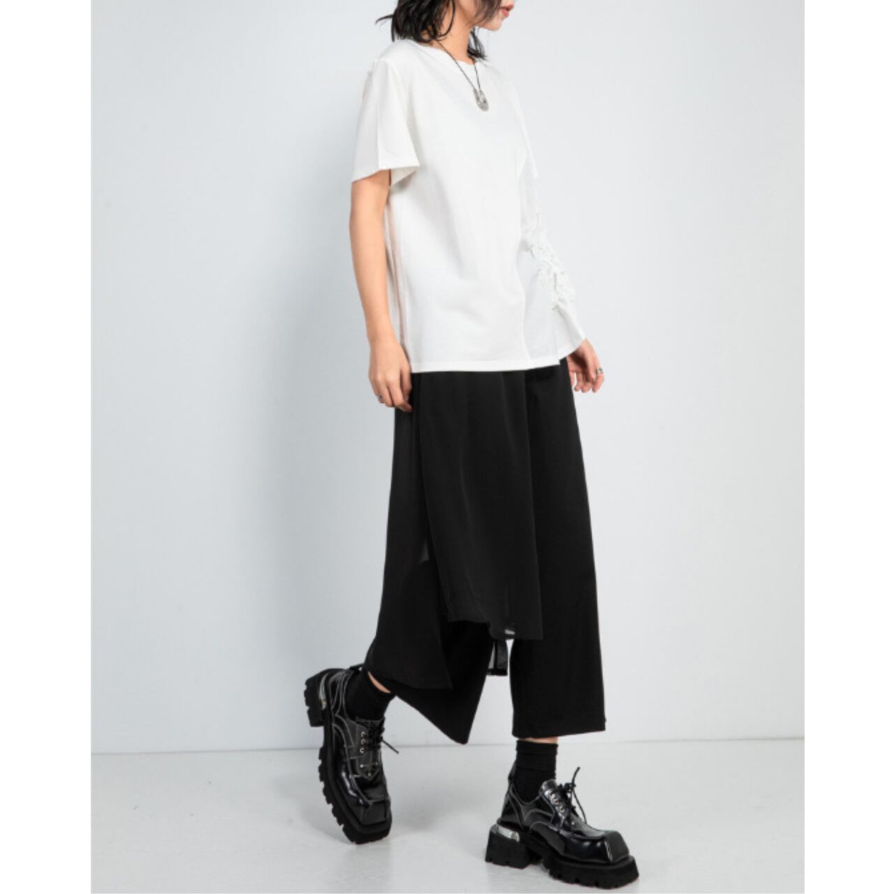 アシンメトリーなデザインが目を惹く、オーバーサイズのショートスリーブTシャツ。