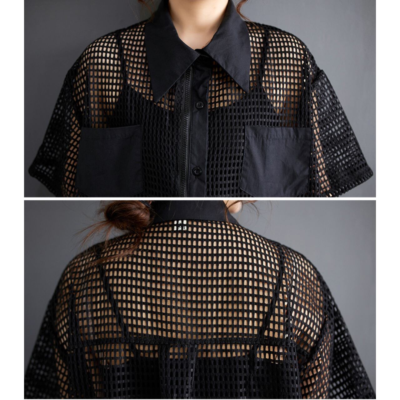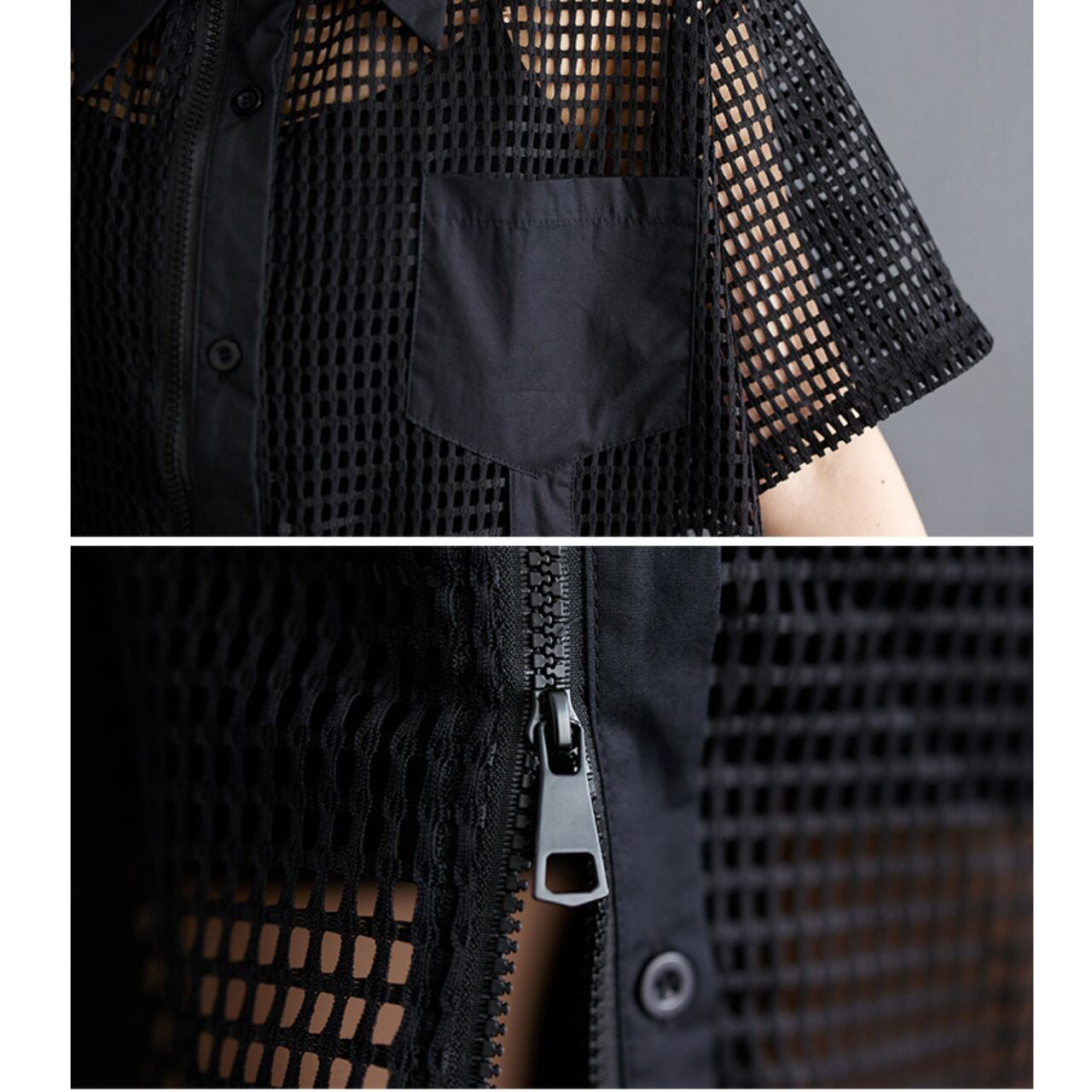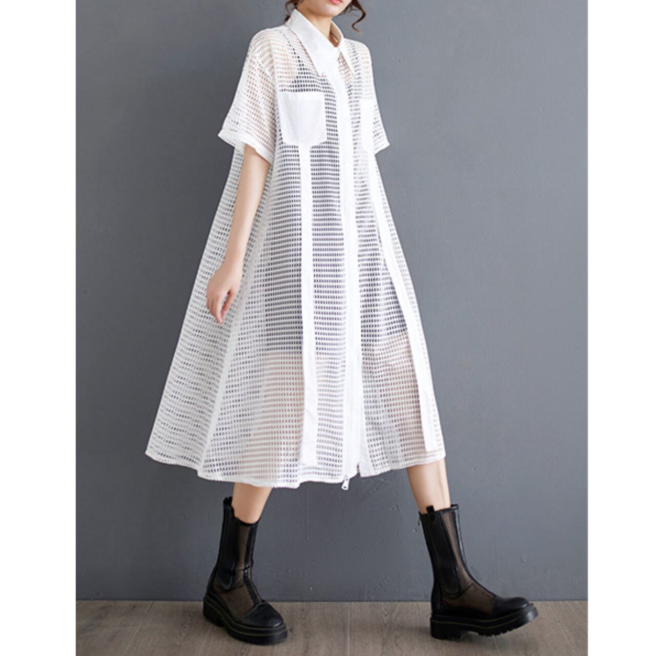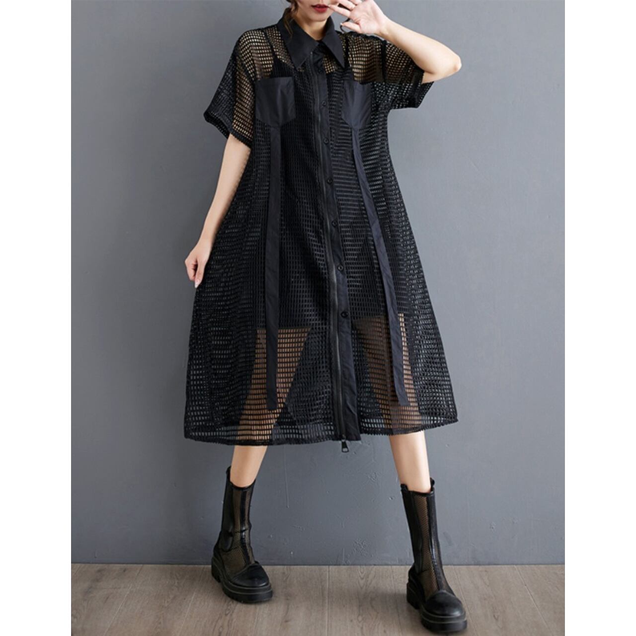 メッシュ素材が織りなす軽やかで洗練されたAラインシャツワンピース。