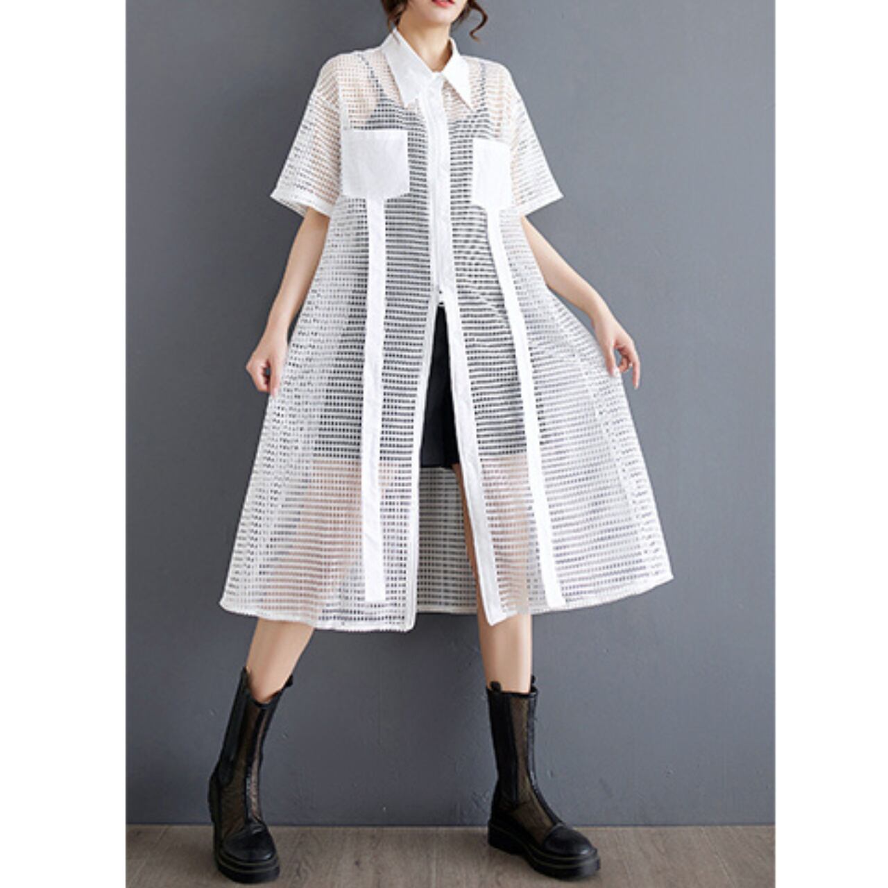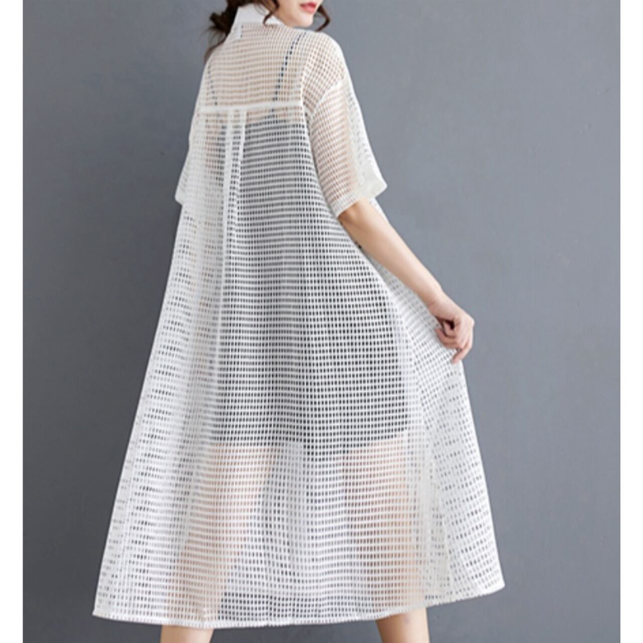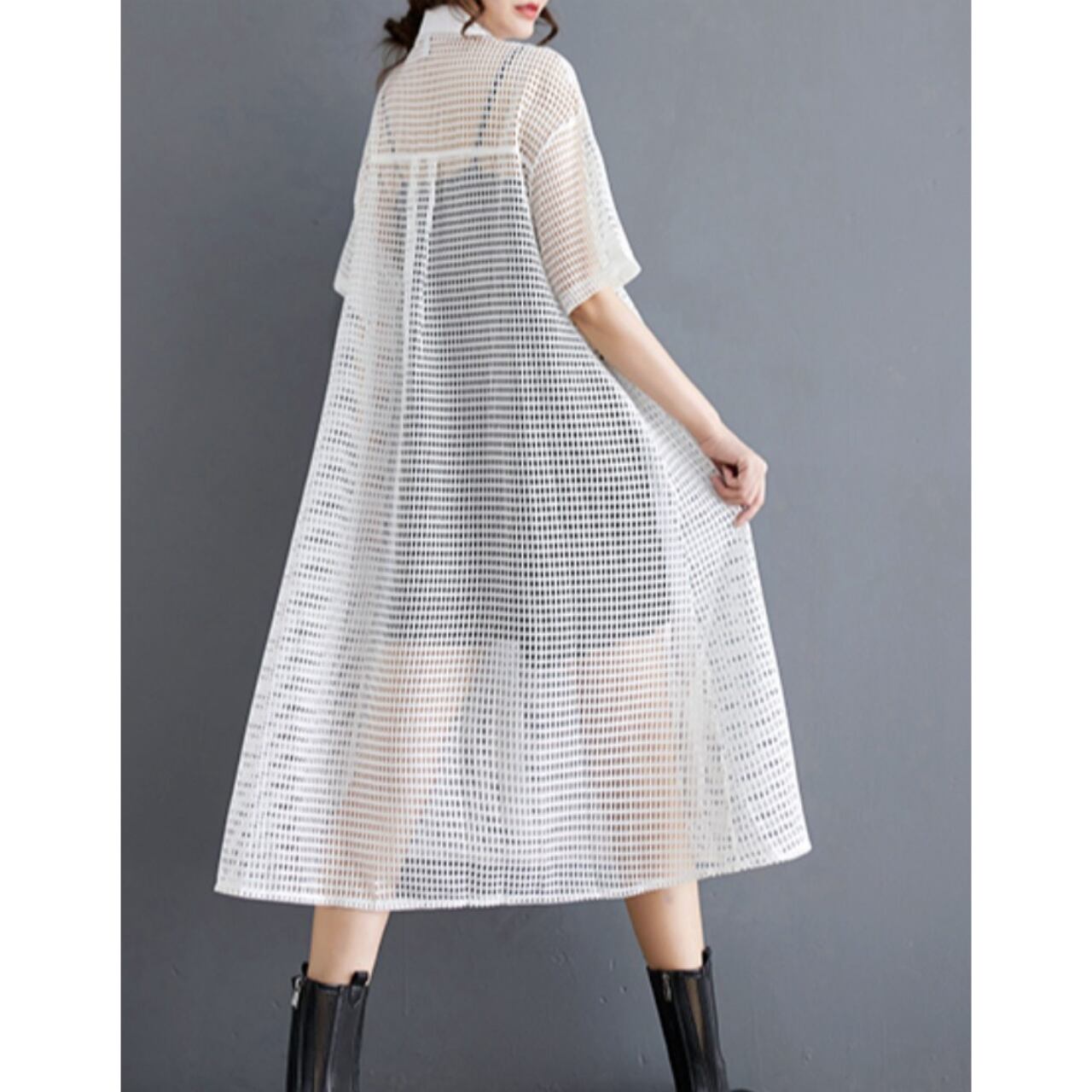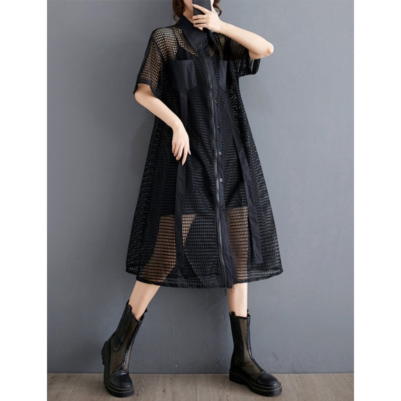 Mesh Material A-Line Front Button Shirt Dress 00134