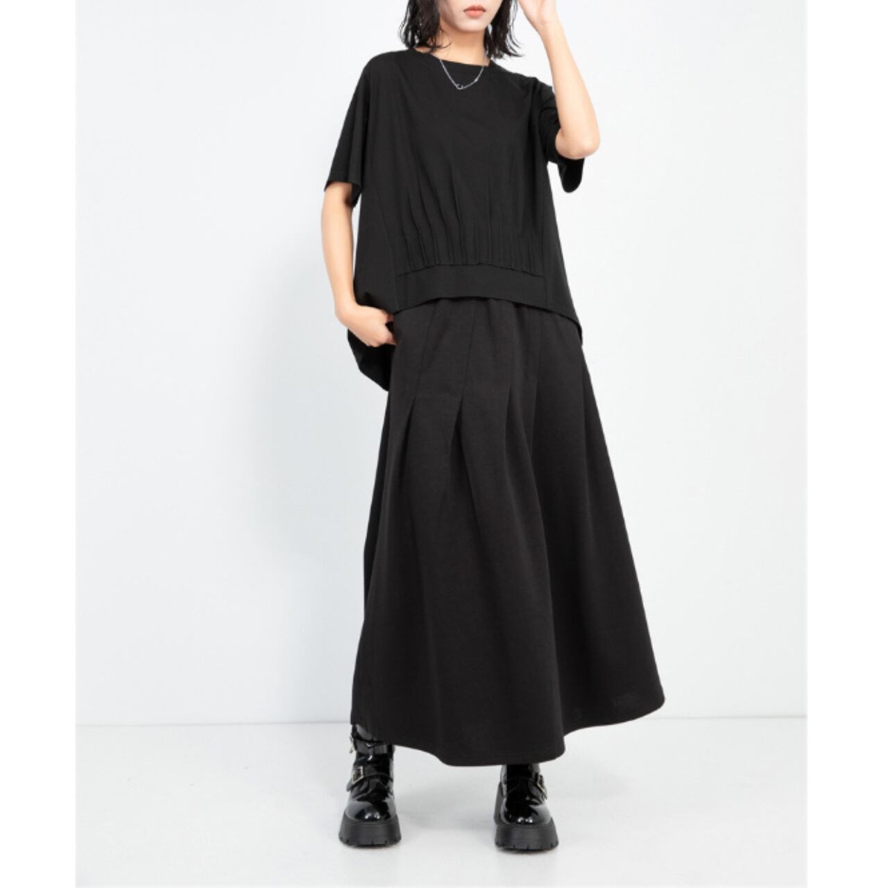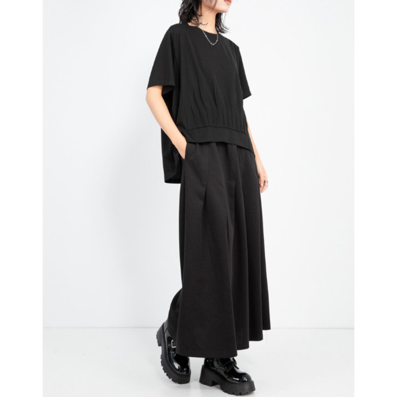 シンプルなデザインでありながら、裾のタックデザインがさりげないアクセントとなり、着こなしに奥行きを与えます。