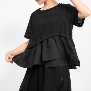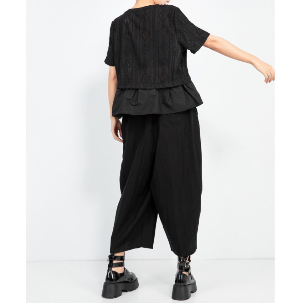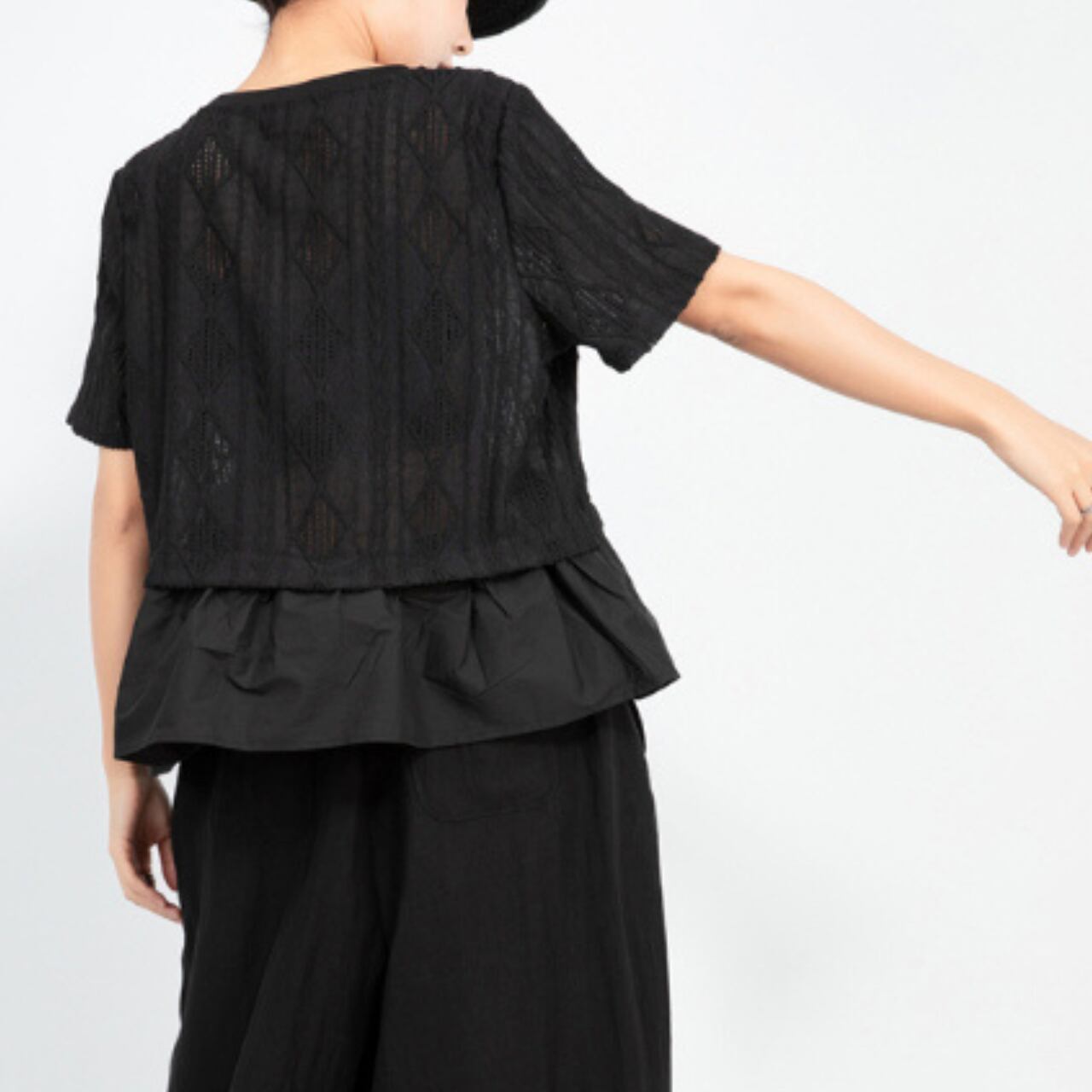 繊細な透かし模様が施されたトップスに、すっきりとしたシルエットのレイヤードされたデザイン。