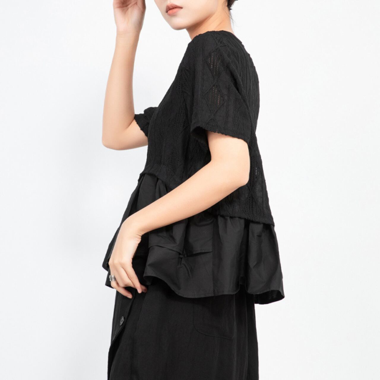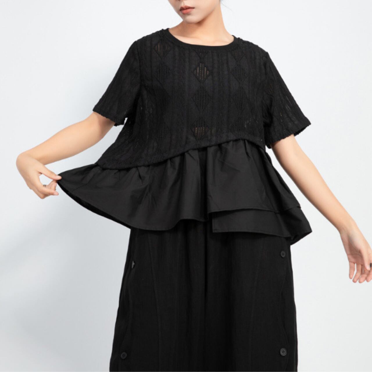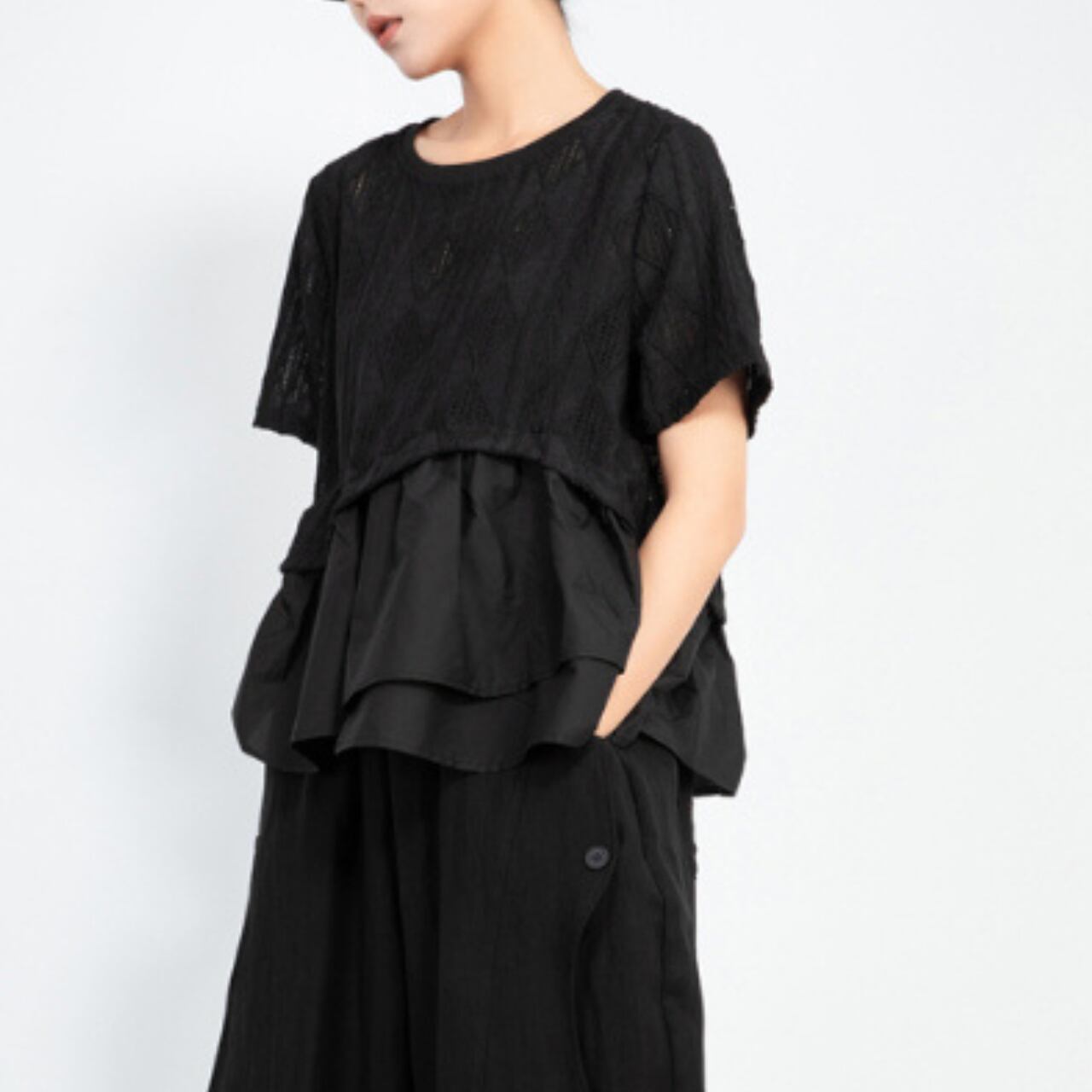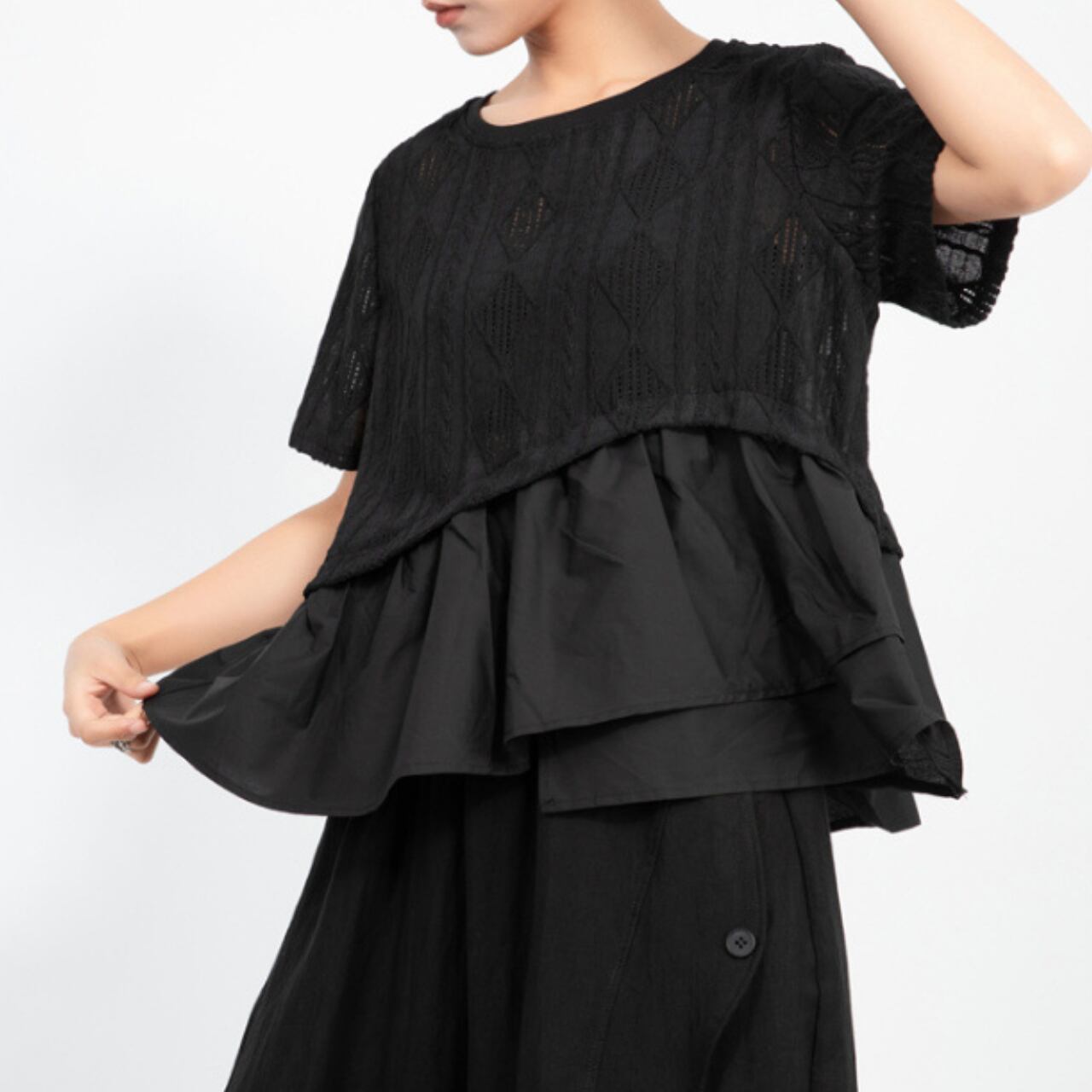 Double Layer Crew Neck Flared Sleeve Short Sleeve Top 00141