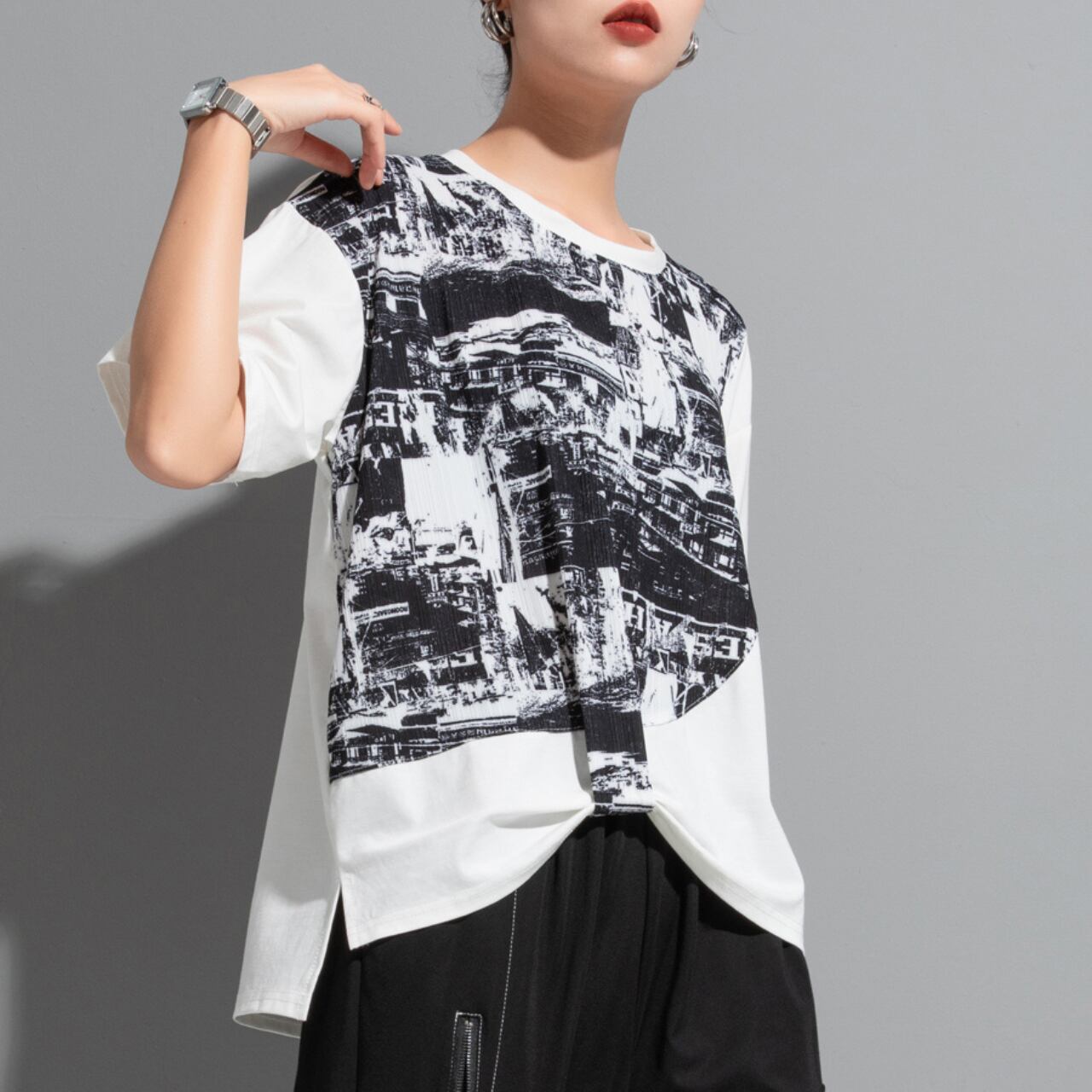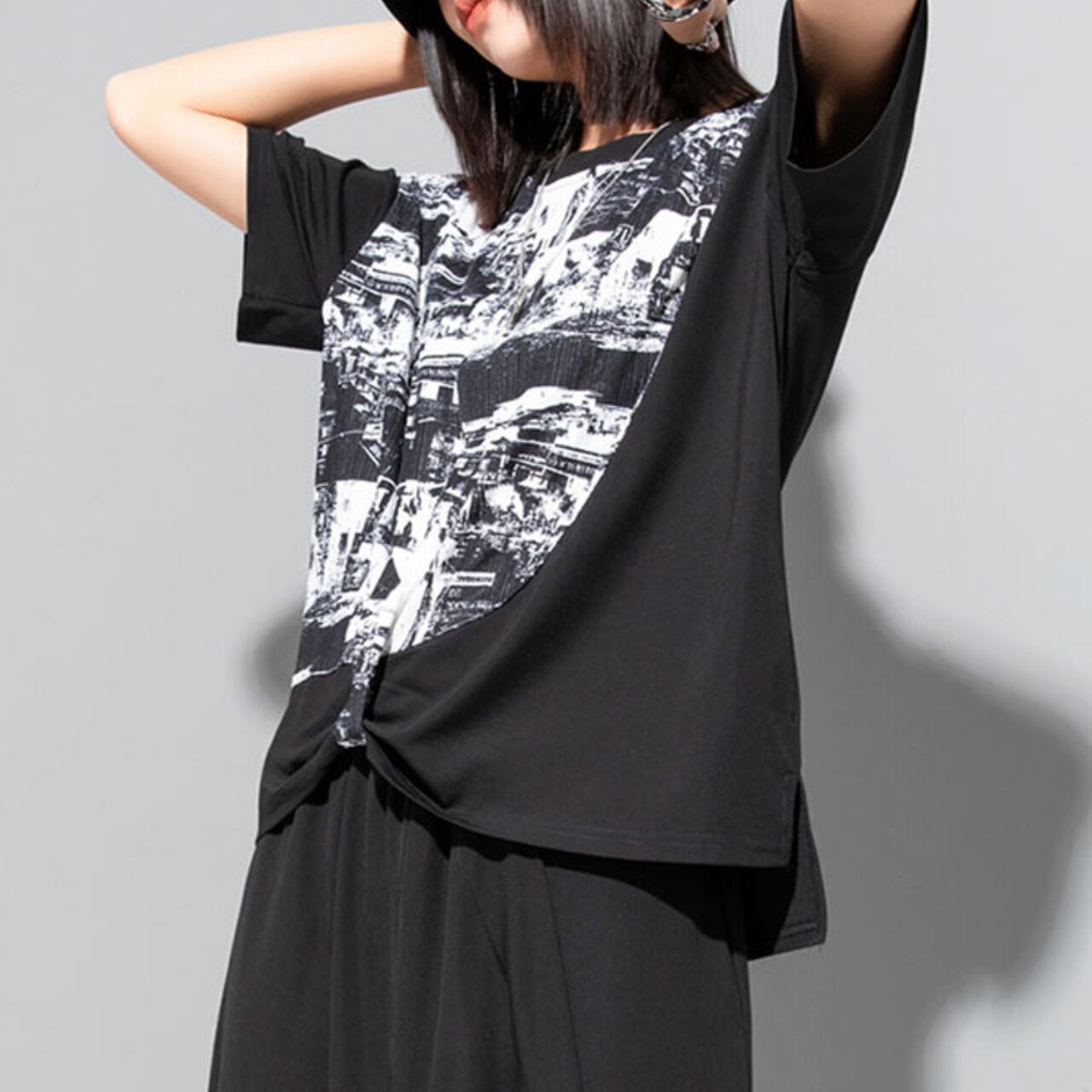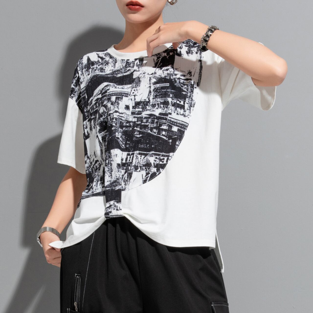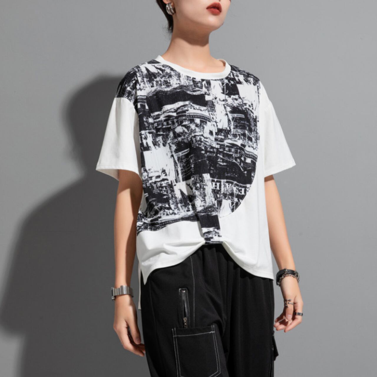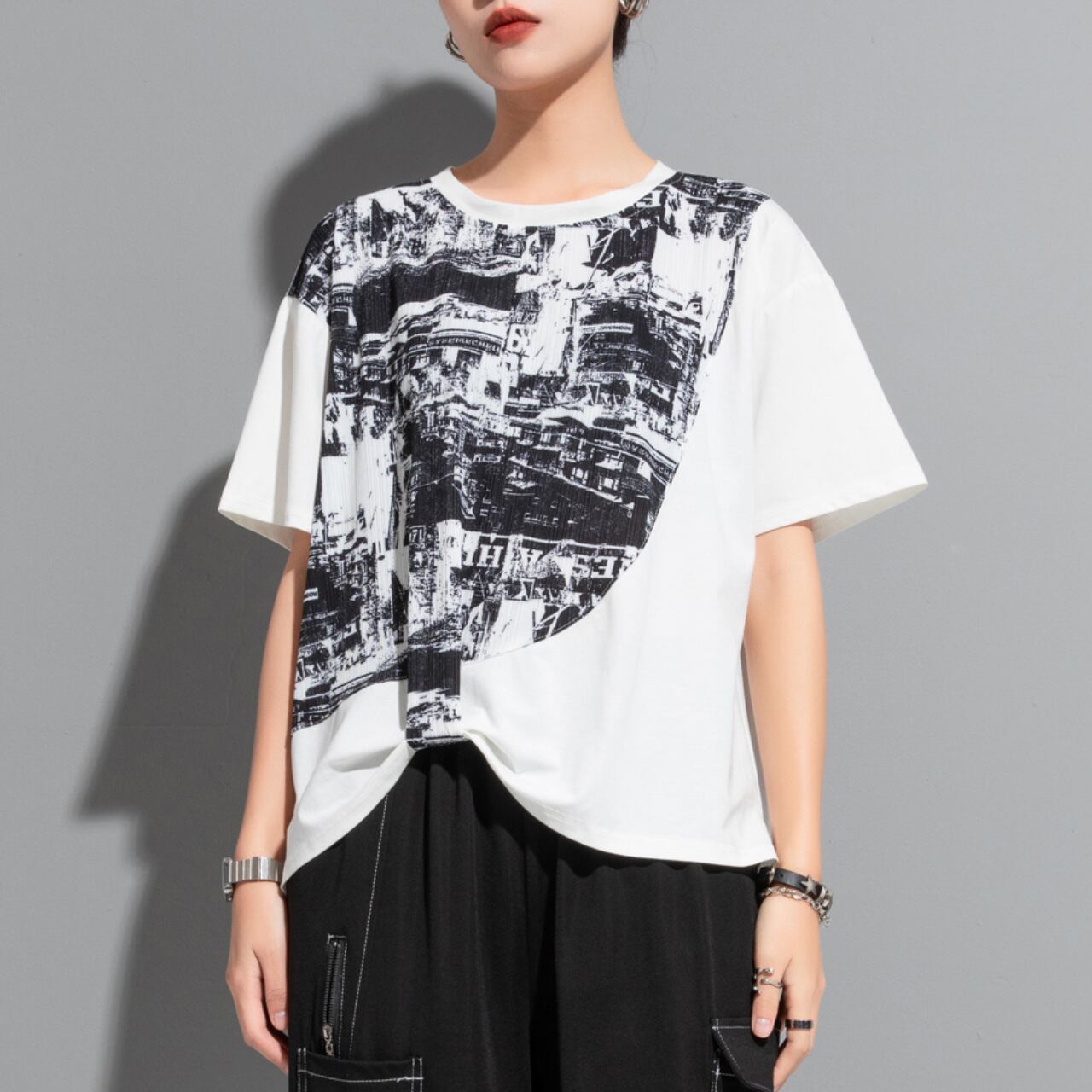 個性的な抽象プリントが魅力の半袖Tシャツ。 ゆったりとしたドロップショルダーデザインが、リラックス感をプラスします。 一枚で着ても、レイヤードスタイルにも合わせやすく、様々なコーディネートを楽しめます。 【サイズ】 M 肩幅 43cm 胸囲 110cm 着丈 53-64cm 袖丈 17cm L 肩幅 44cm 胸囲 114cm 着丈 54-65cm 袖丈 18cm ※採寸方法により1~3cmの誤差がある場合がございます 【カラー】 ホワイト ブラック 【素材】 ポリエステル 【お届けについて】 こちらの商品は海外店舗より直接発送となる為、ご入金から1週間〜3週間前後で発送致します。 ◼️注意事項 ・タイミングによっては 商品在庫切れにより注文キャンセルとさせていただく恐れもございますので、予めご了承くださいませ。 ・こちらは輸入品となります。 日本製とは検品基準が異なる為、新品未使用品でも、ごくわずかな汚れや傷がある場合もございます。 ・商品の色味は、お手持ちのデバイスの画面によって実物と若干異なる場合がございます。 ・イメージ違いやサイズ等、お客様都合による交換、返品、キャンセルは対応出来かねます。 ———————————— ご購入前にこちらをお読みください →https://shop.remtry.net/about ————————————