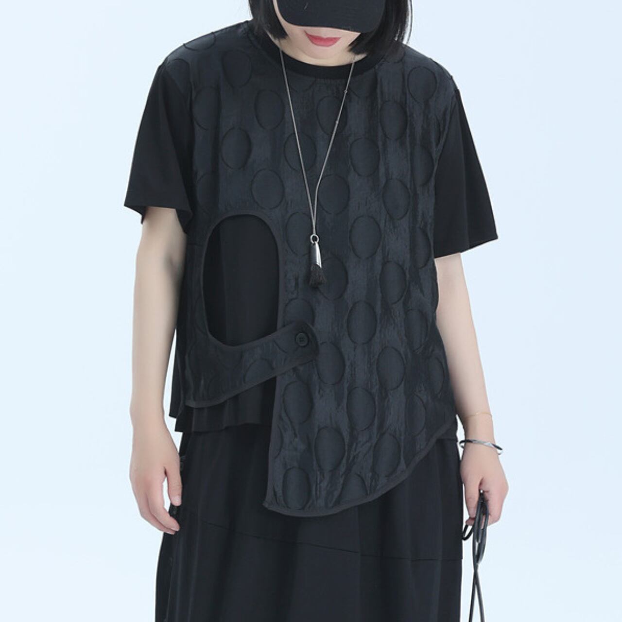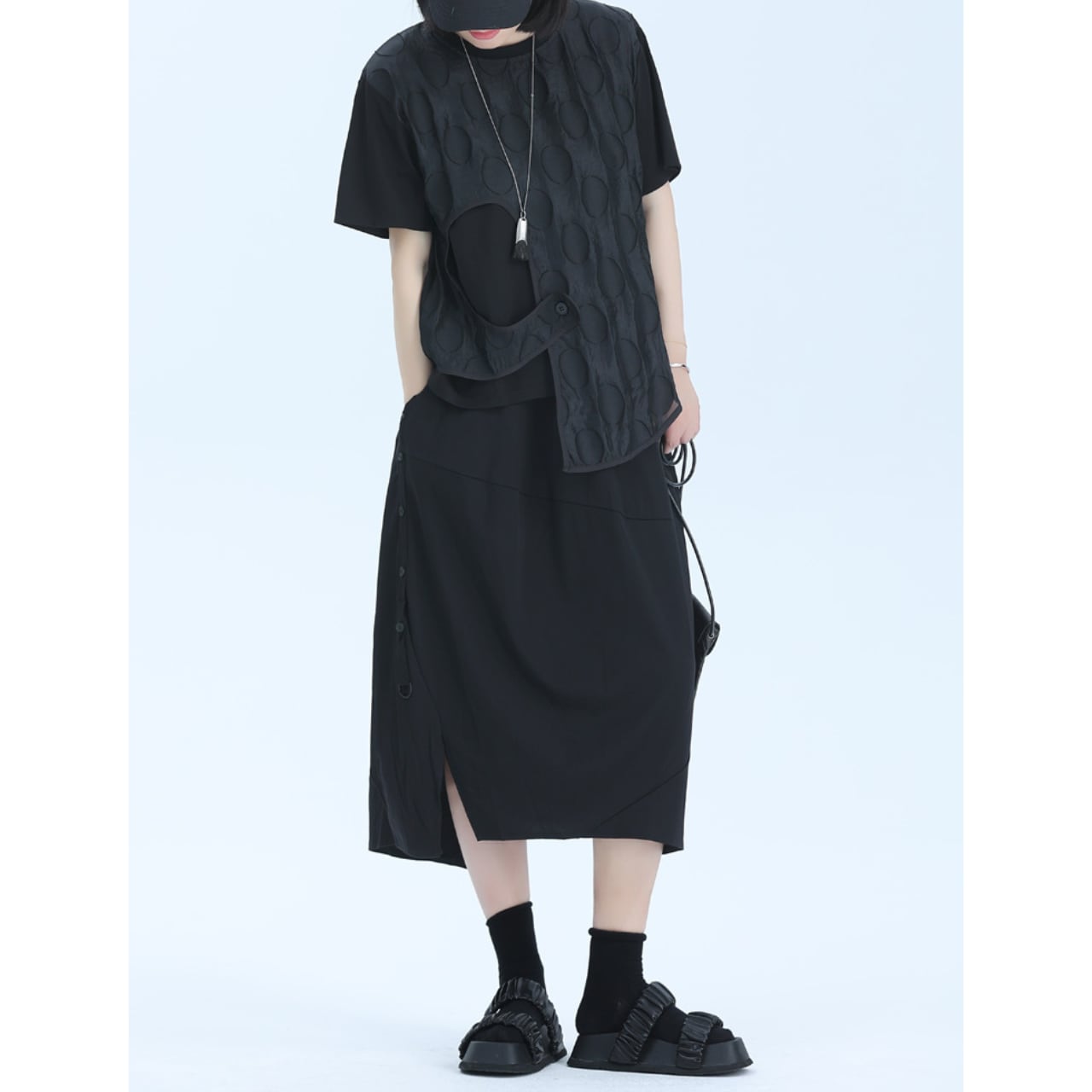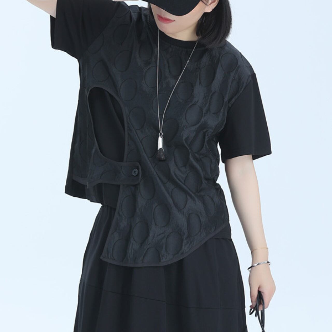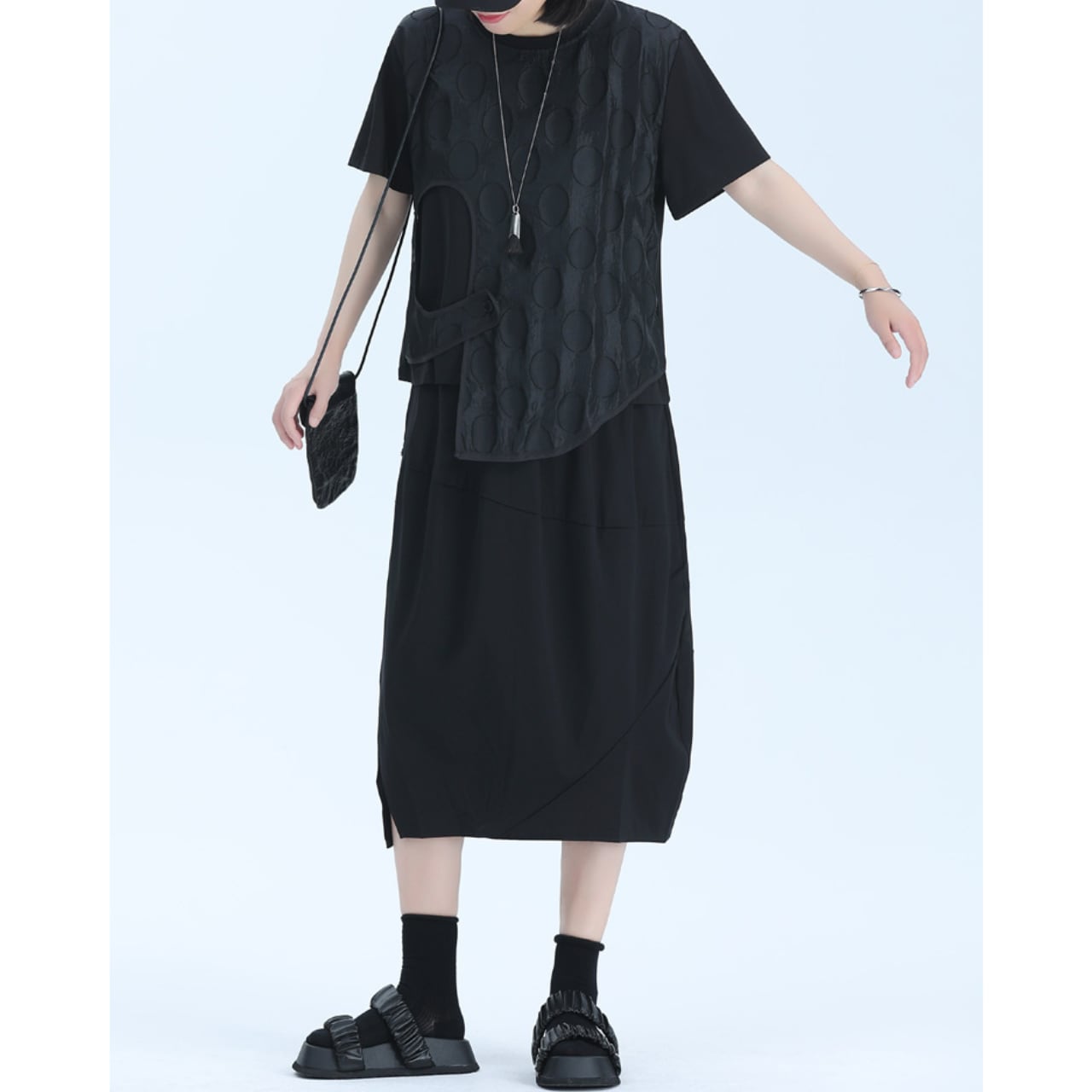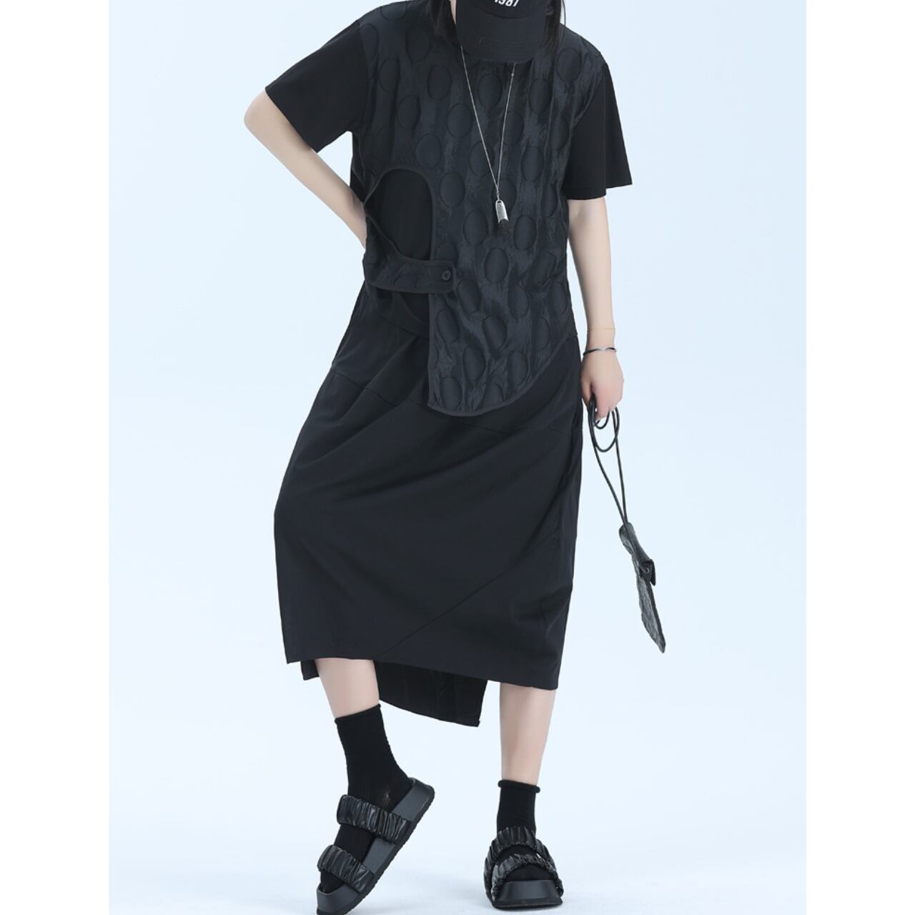 アシンメトリーなデザインと、レイヤードされた生地が、シンプルながらも個性的なシルエットを作り出します。