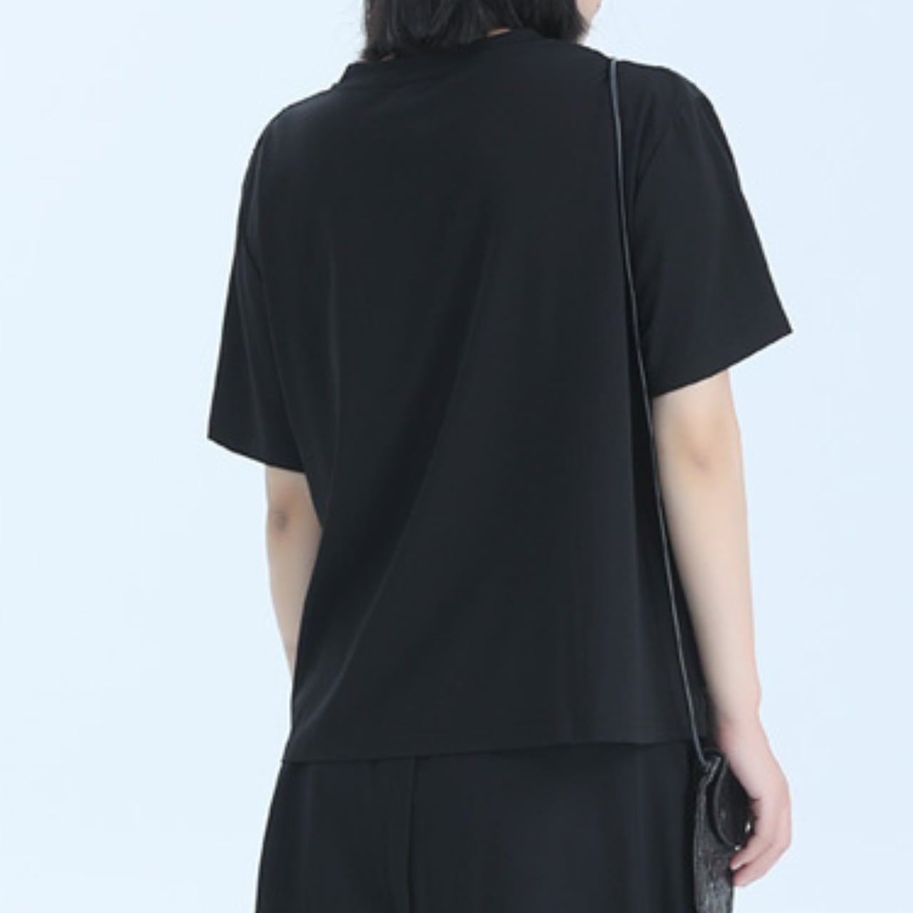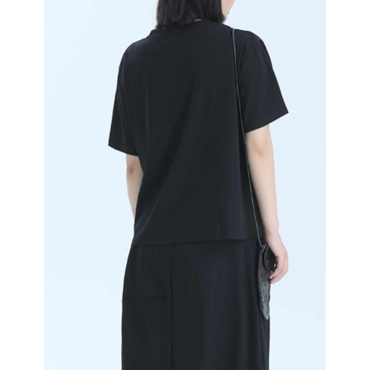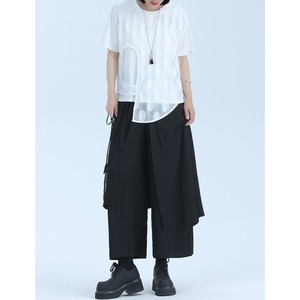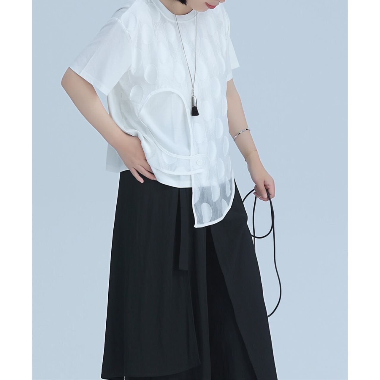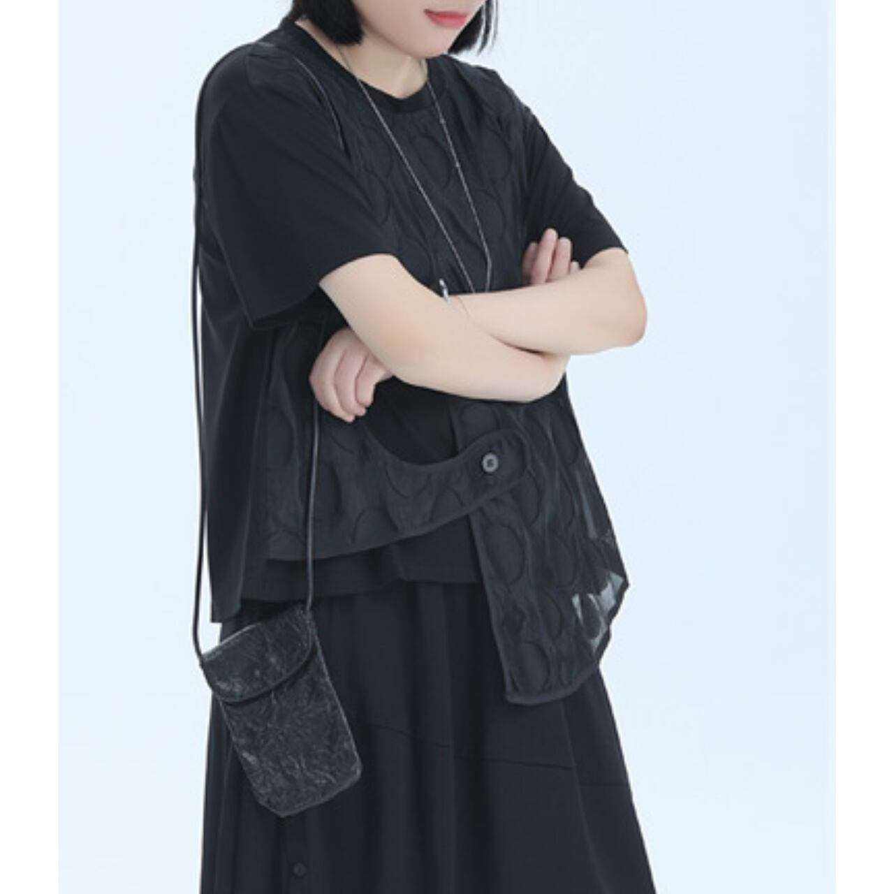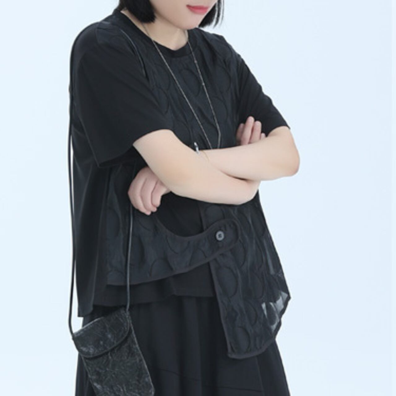 アシンメトリーなデザインと、レイヤードされた生地が、シンプルながらも個性的なシルエットを作り出します。