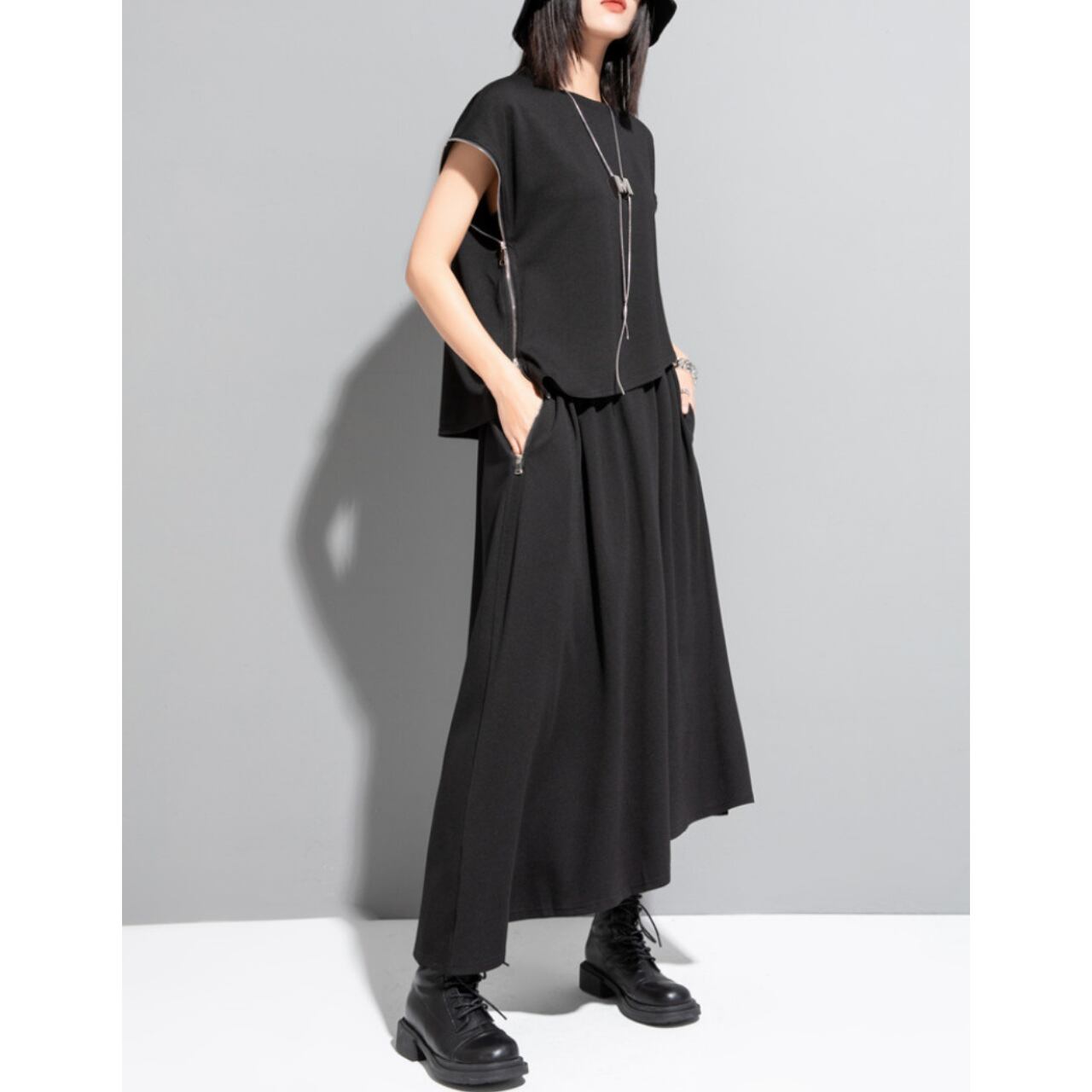 サイドのジッパーがアクセントとなり、着こなしに変化をつけられます。