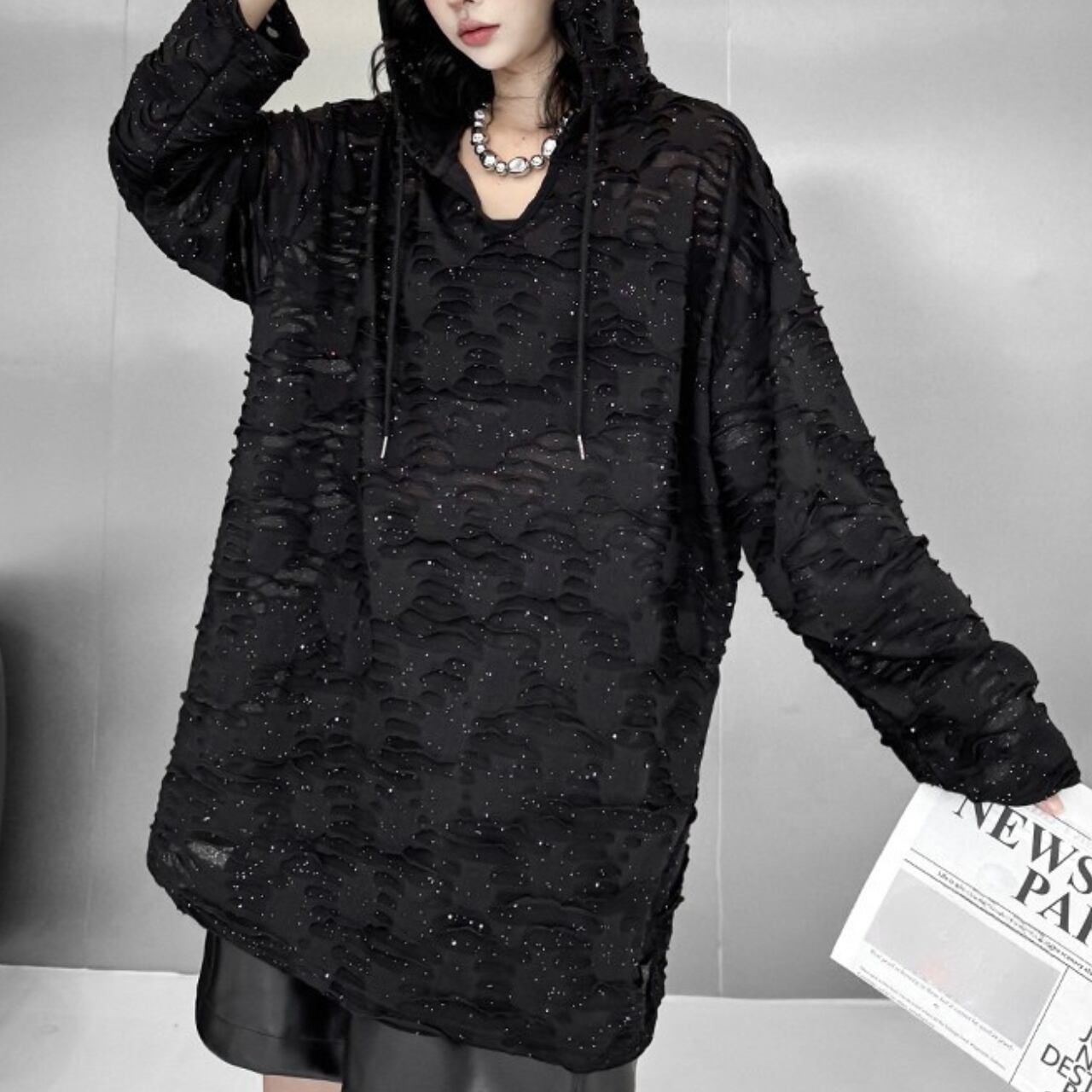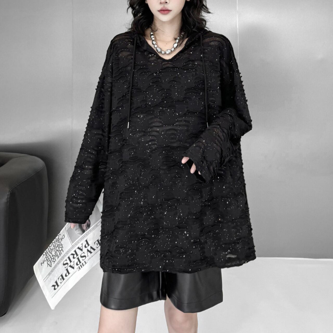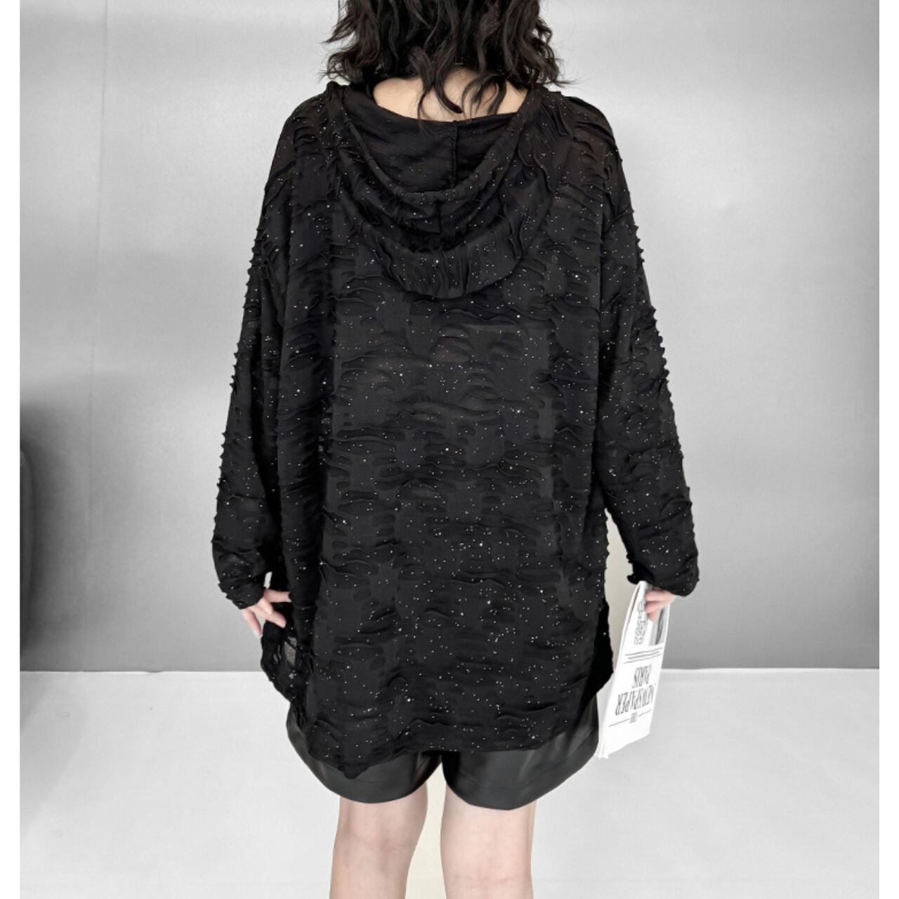 立体感のあるテクスチャー素材が印象的な、フード付きオーバートップス。