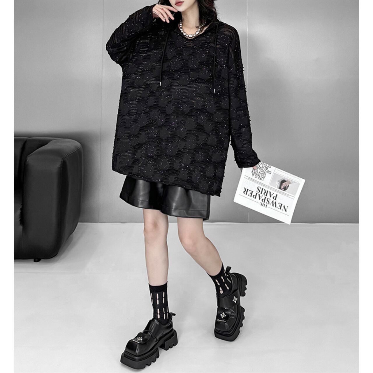 透け感を含んだブラックカラーに、表情のある生地を重ねることで、奥行きのあるモードスタイルを演出します。