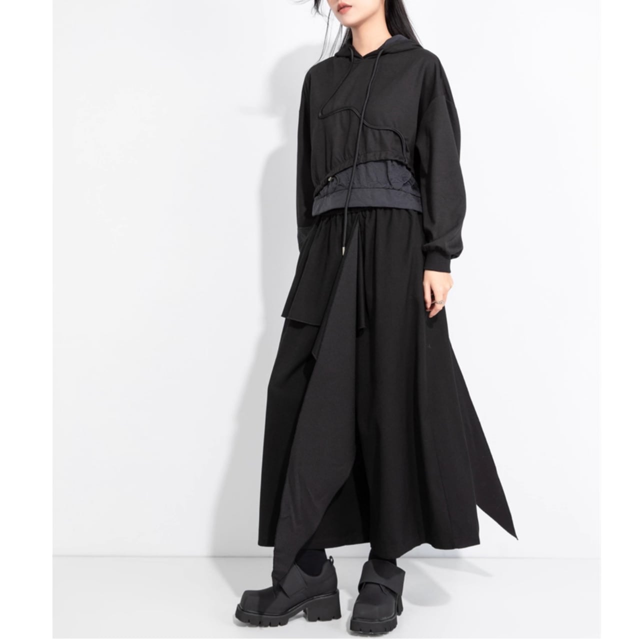 重ねられた生地がつくり出すドレープが、歩くたびにドラマチックなシルエットを演出します。