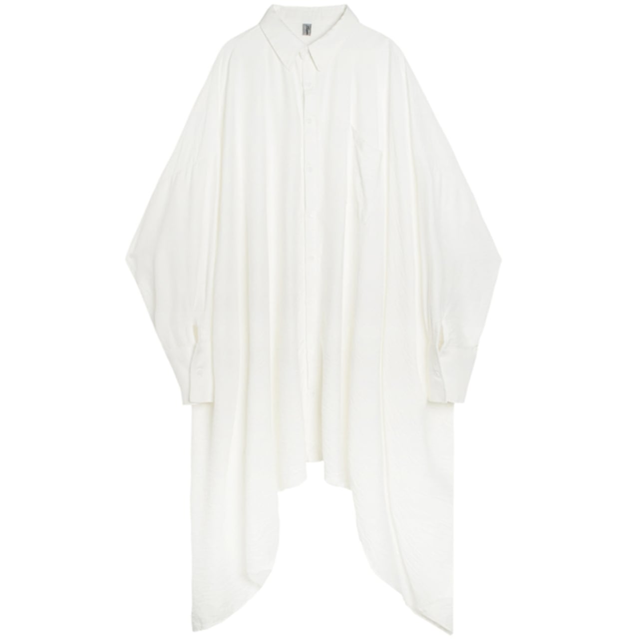 アシンメトリーな裾が目を引くシャツ。